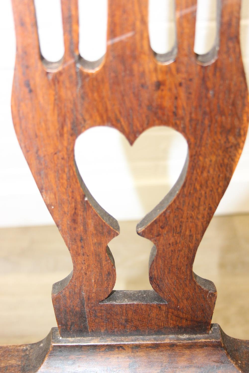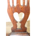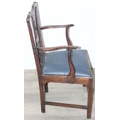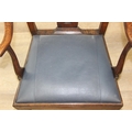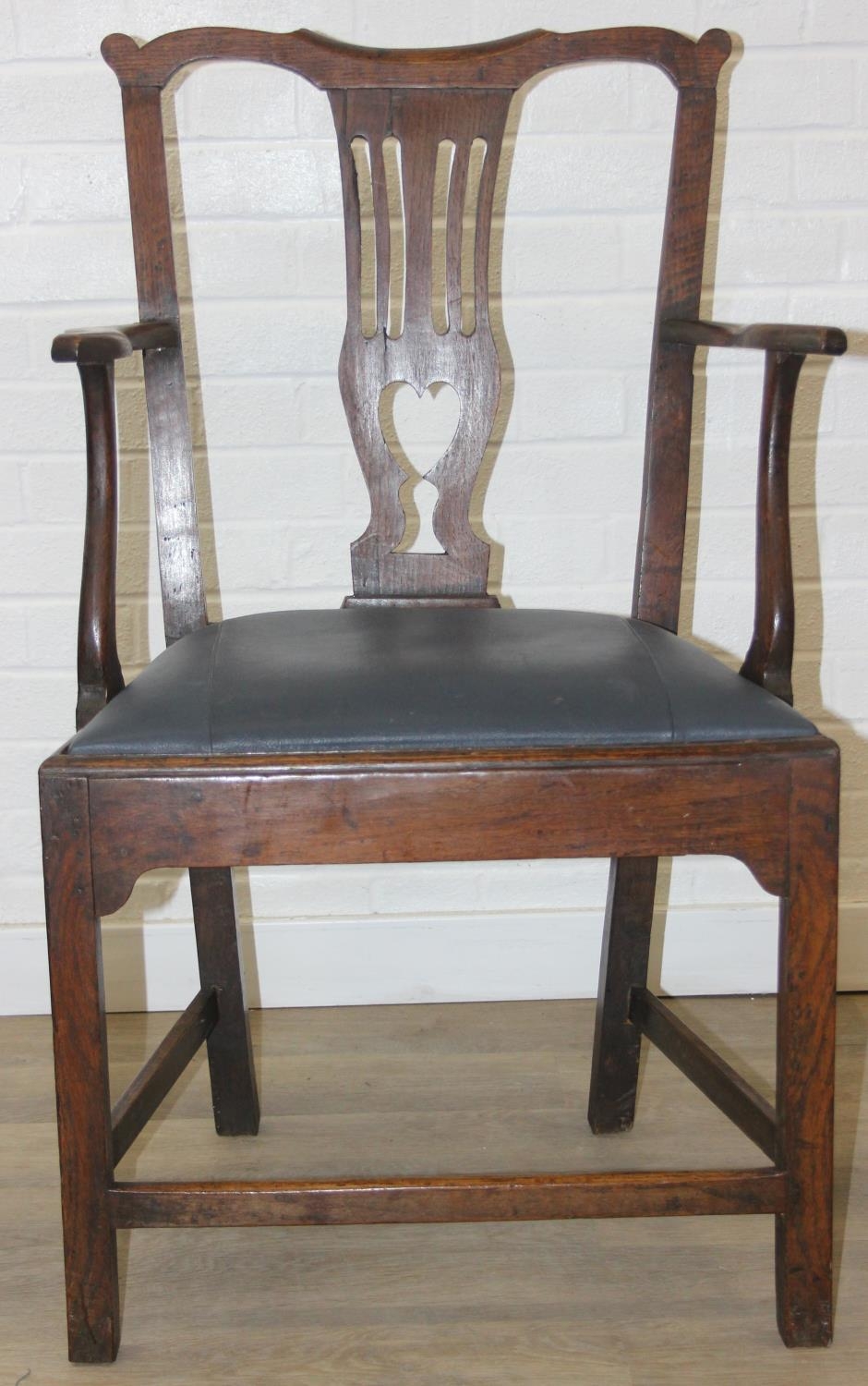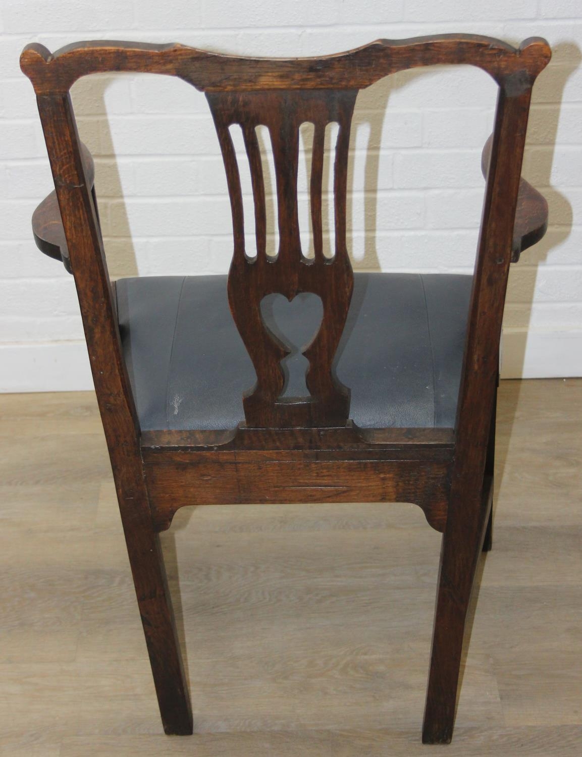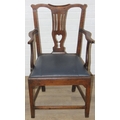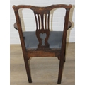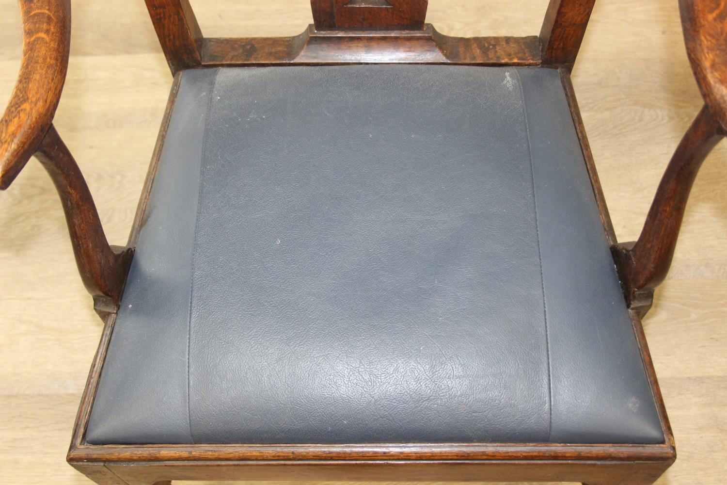 Georgian oak elbow chair with pierced splat and petrol blue leather upholstery, 60cm wide x 98cm tall