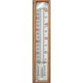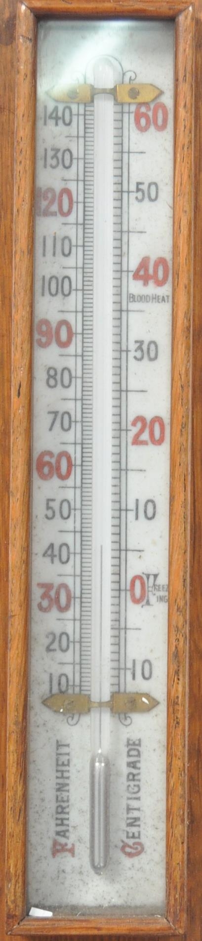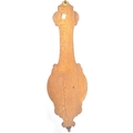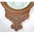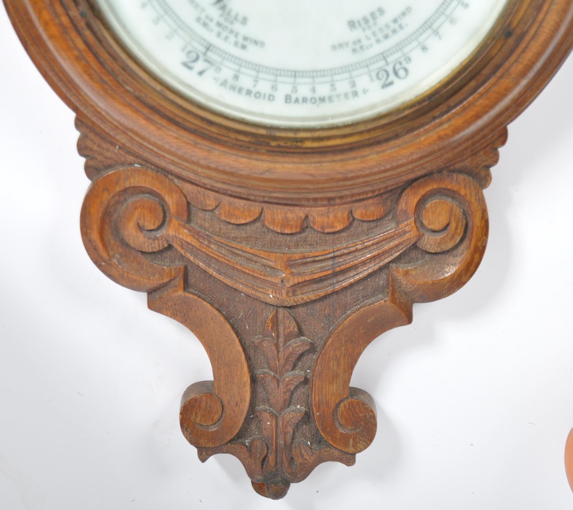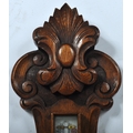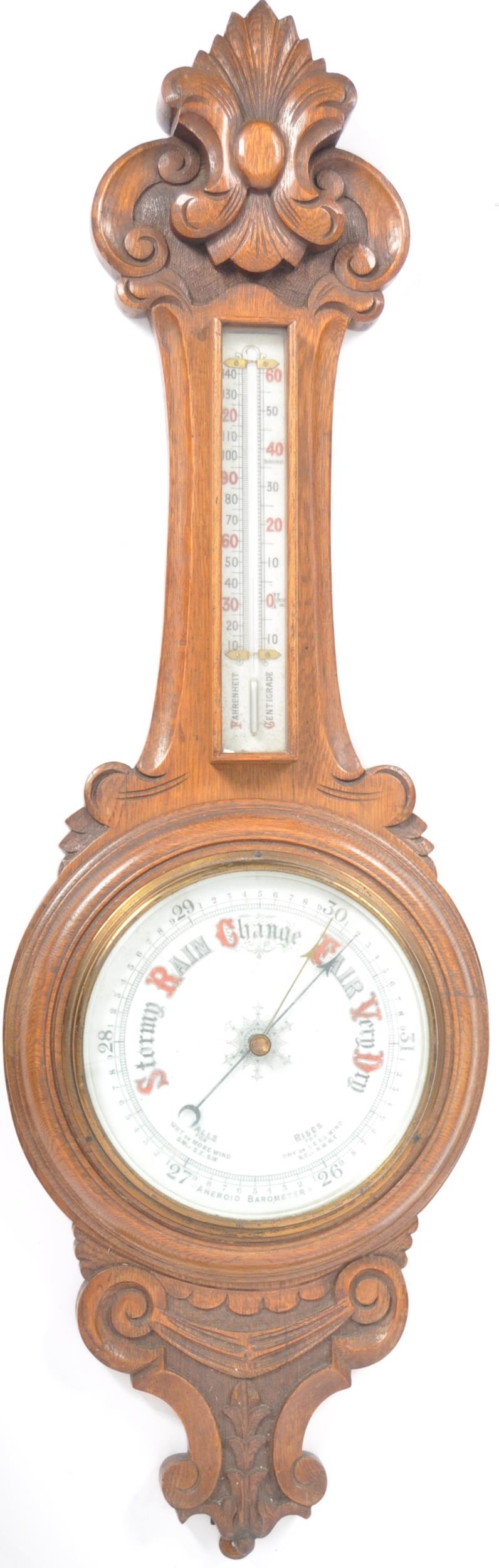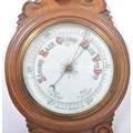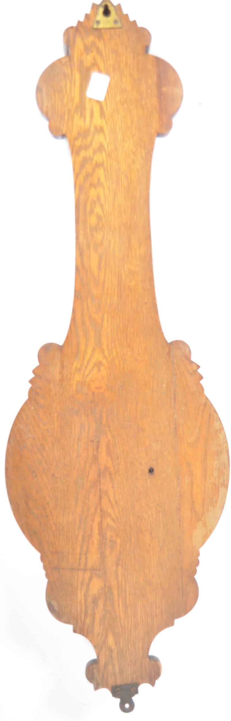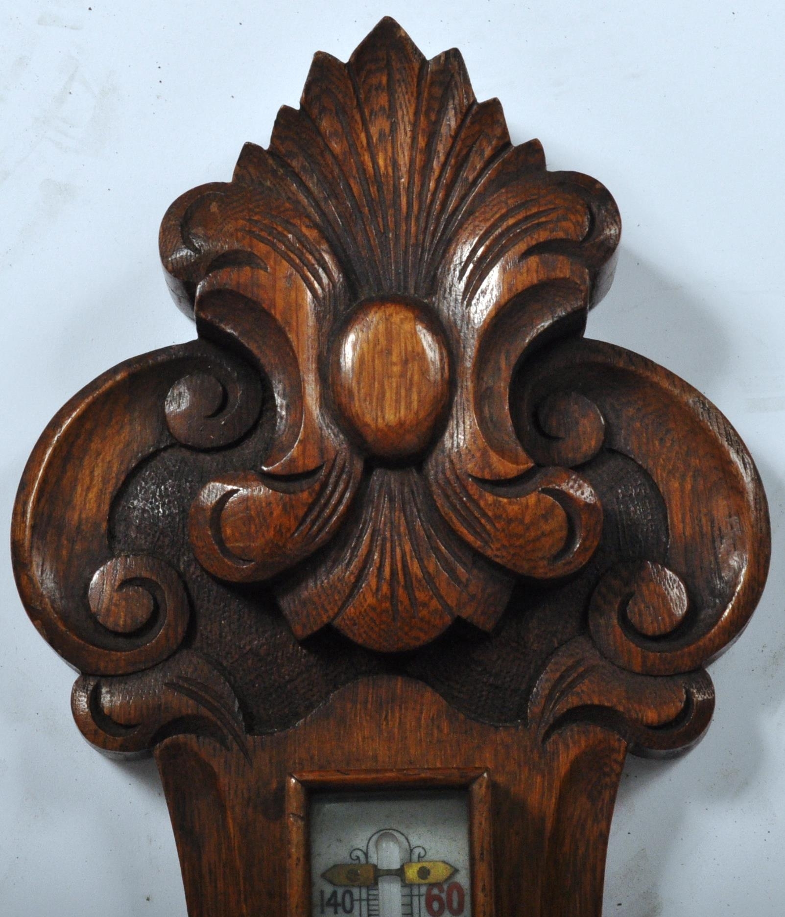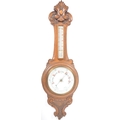 Early 20th century large oak aneroid wall barometer - thermometer banjo shaped compendium. Carved oak top with milk glass lined dial and thermometer