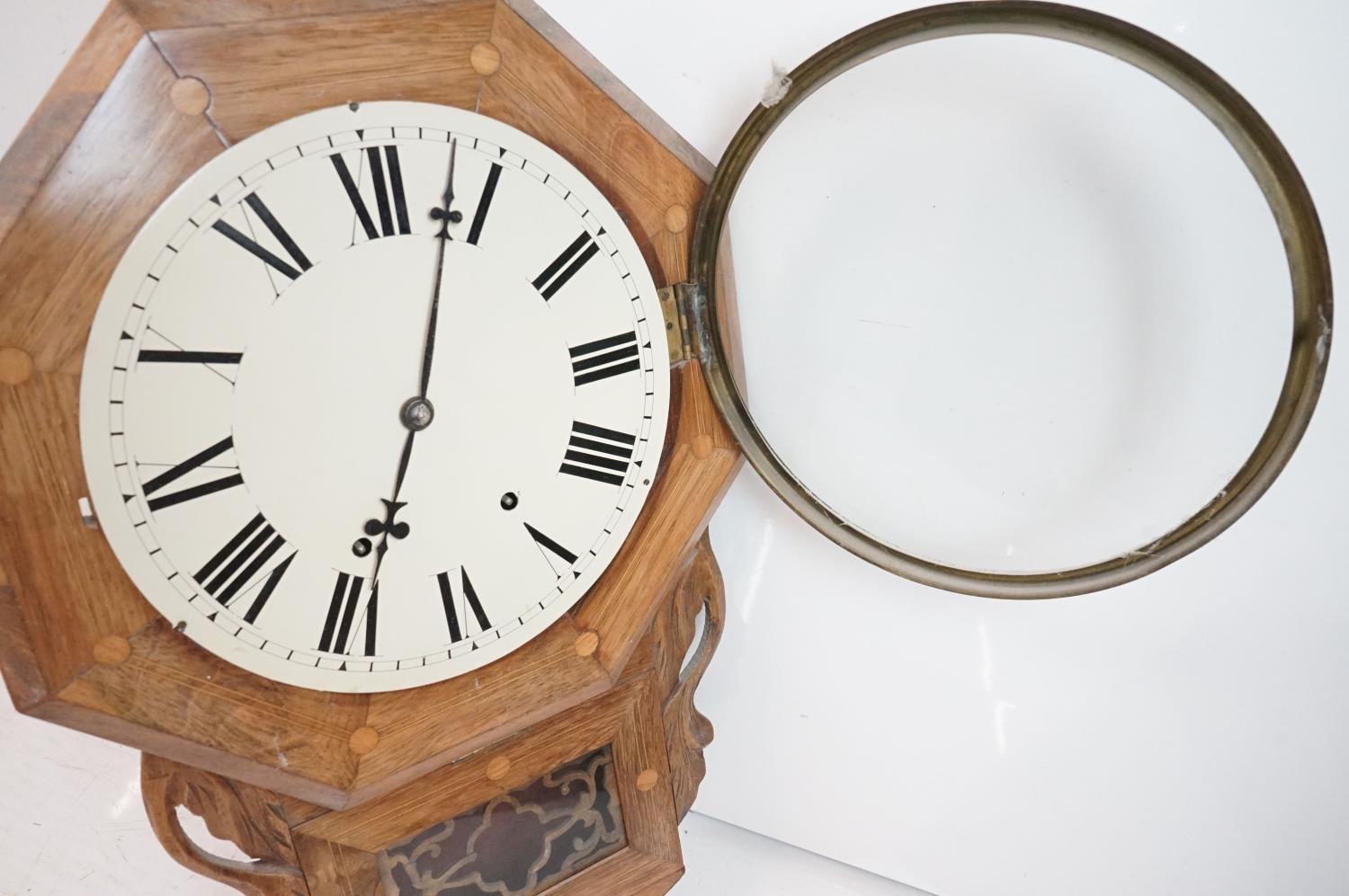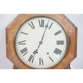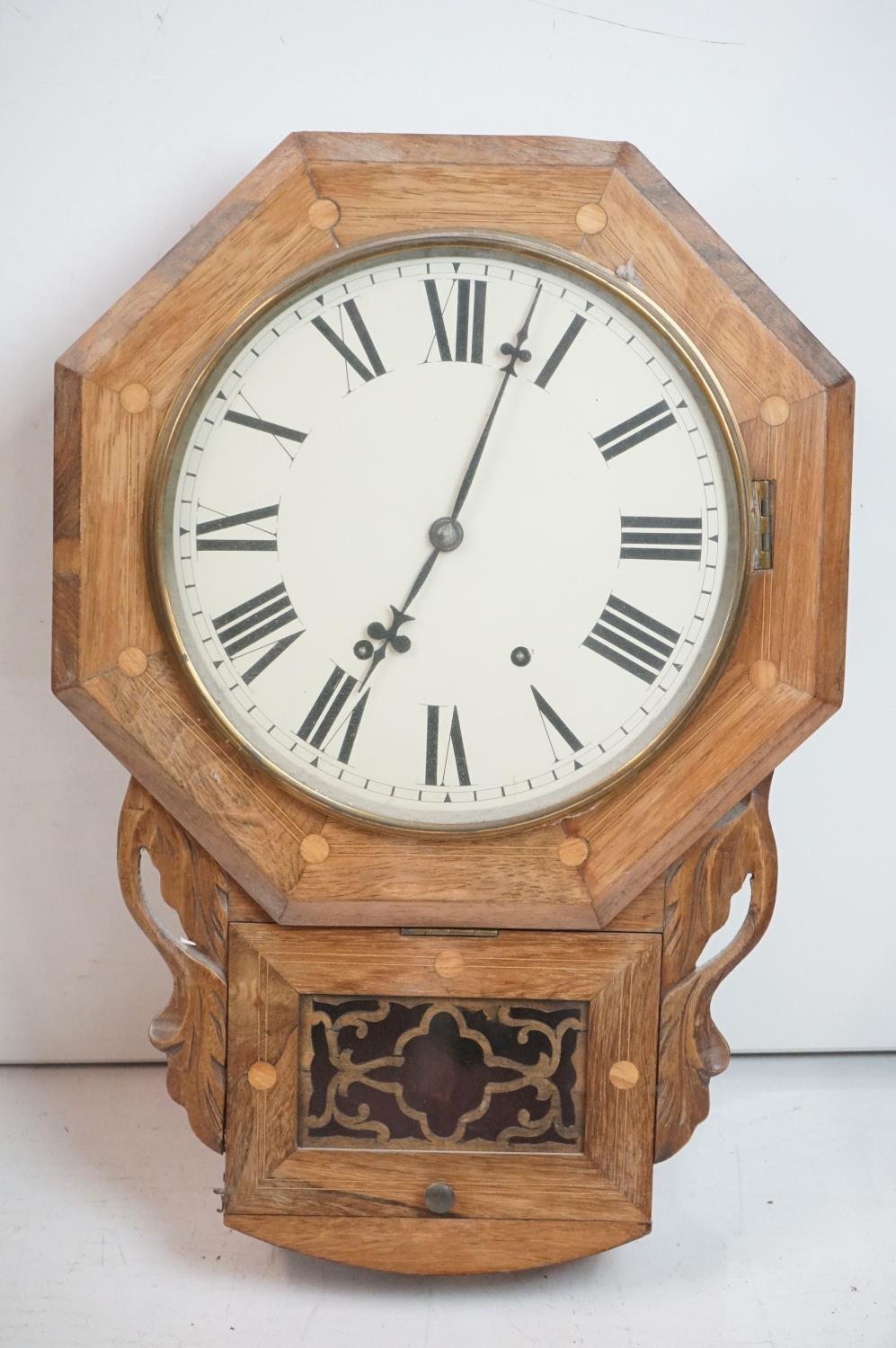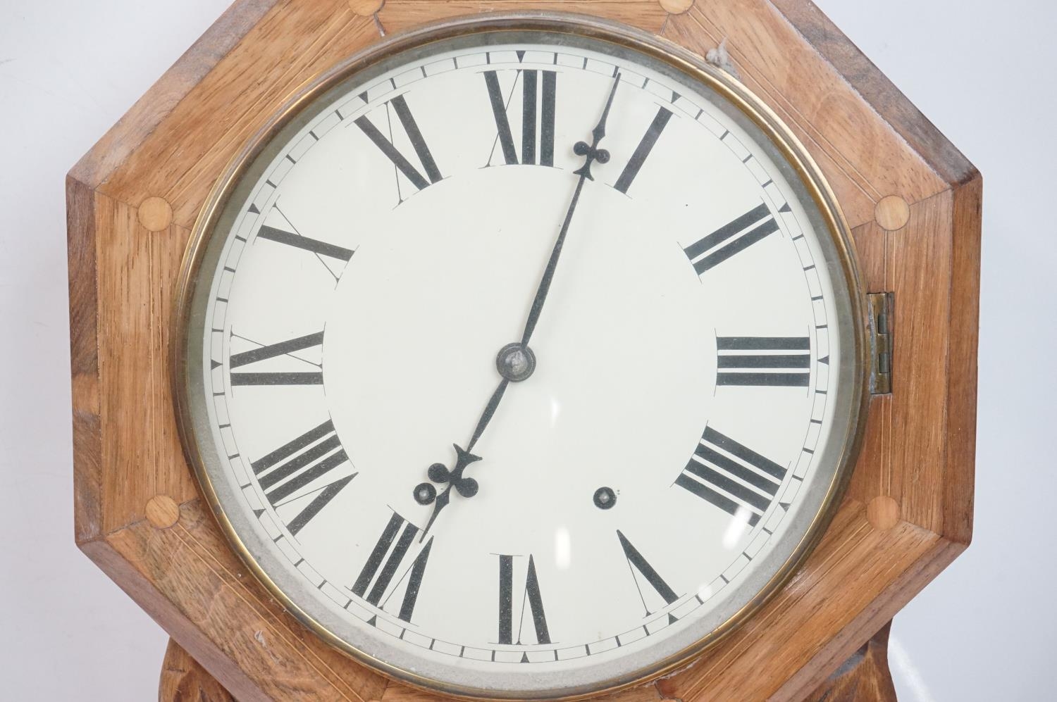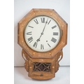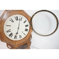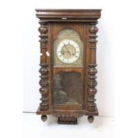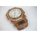 A vintage wooden cased wall clock, white enamel dial with Roman numeral markers.