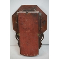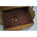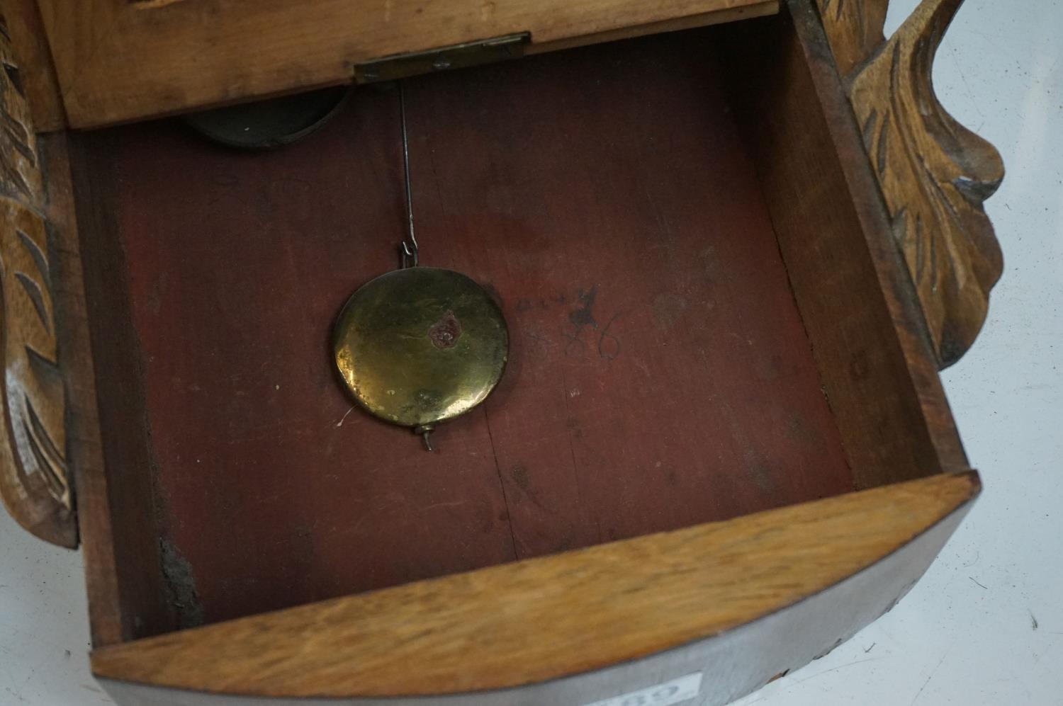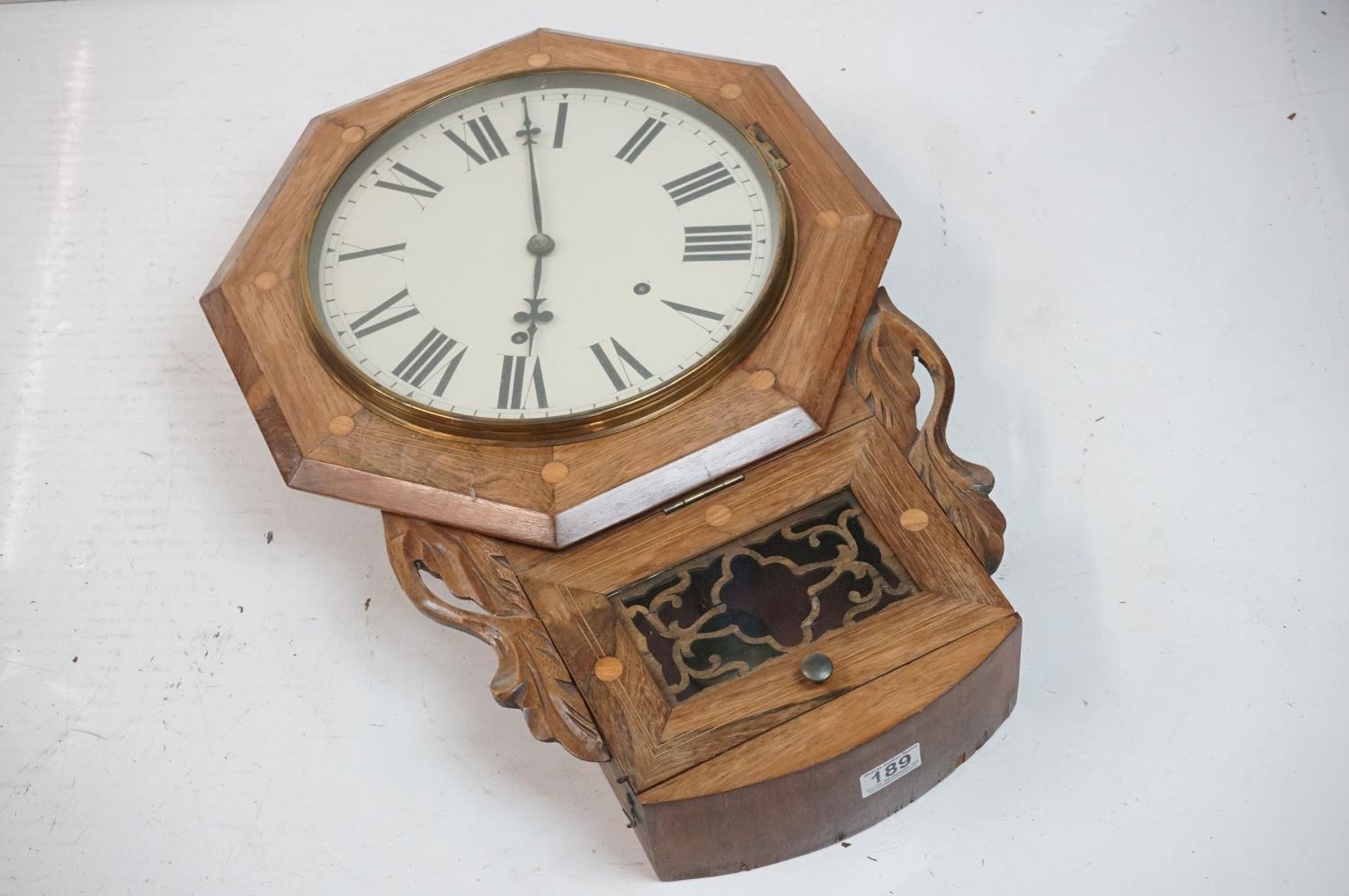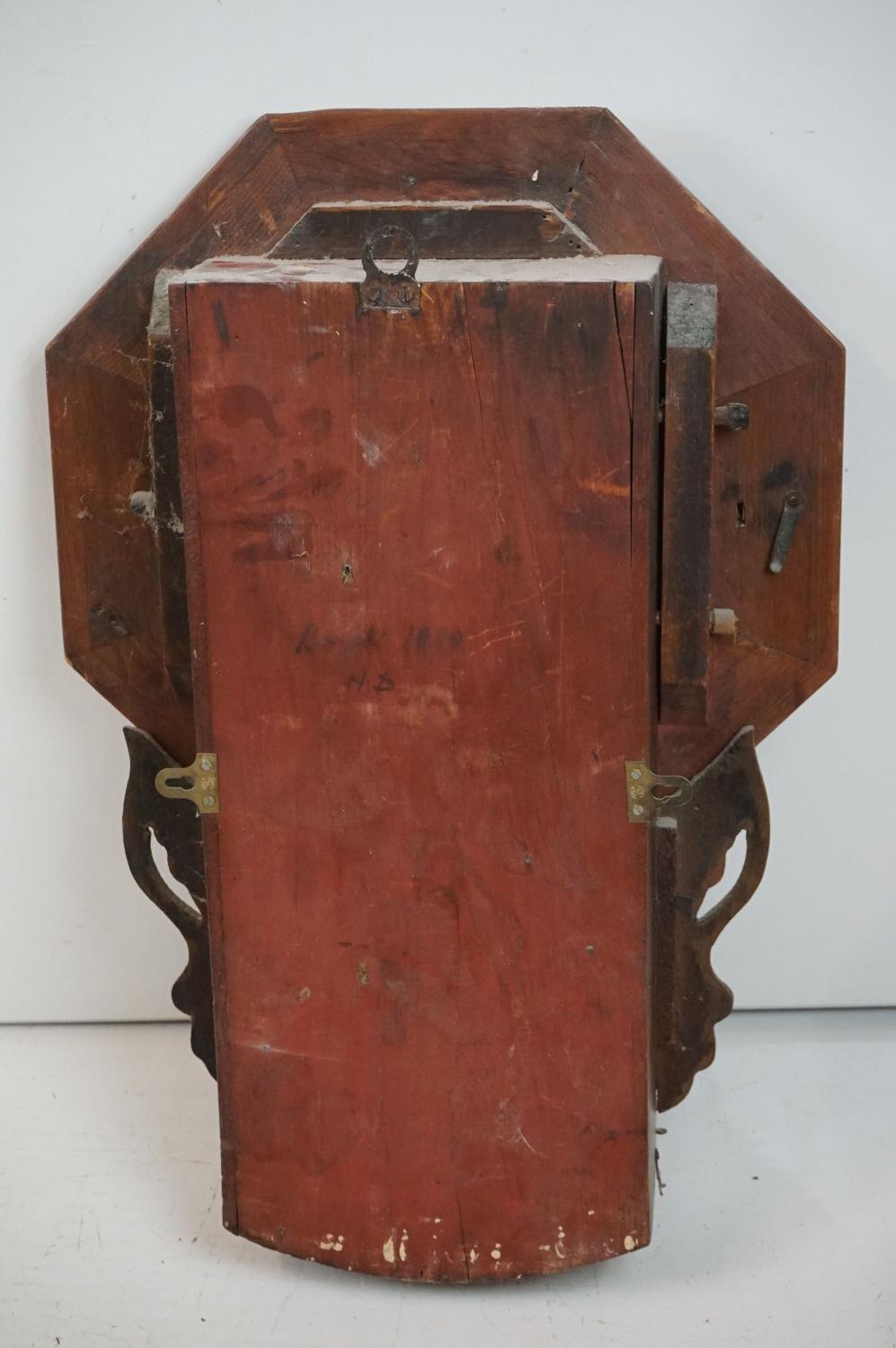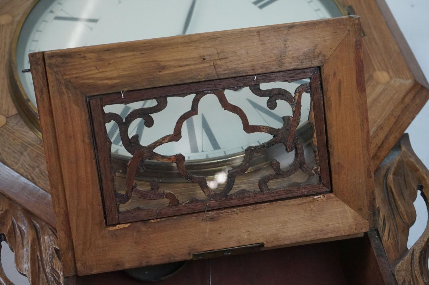 A vintage wooden cased wall clock, white enamel dial with Roman numeral markers.