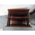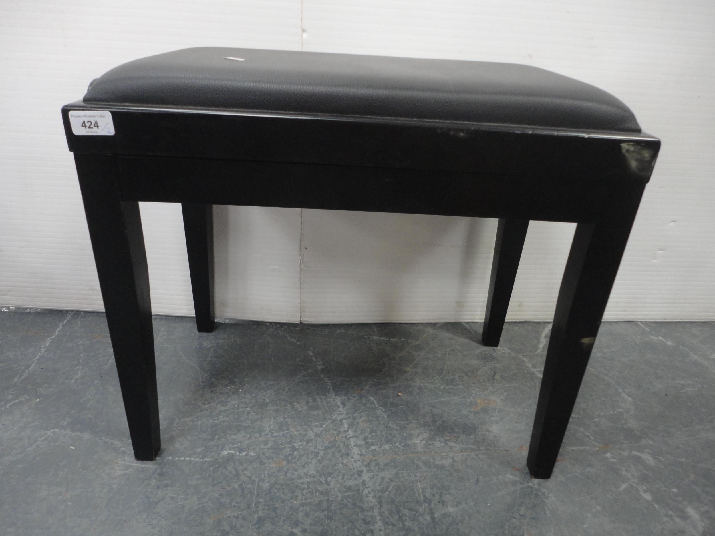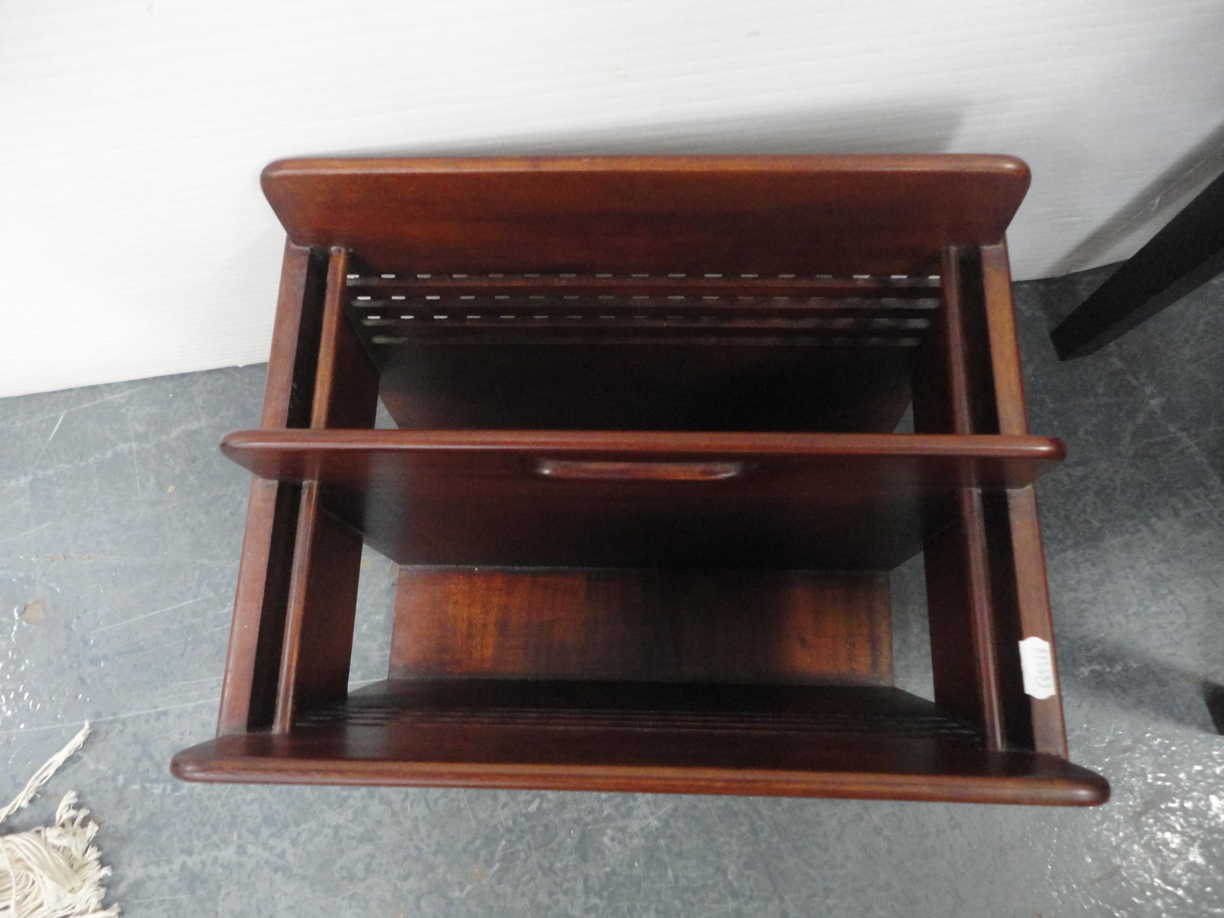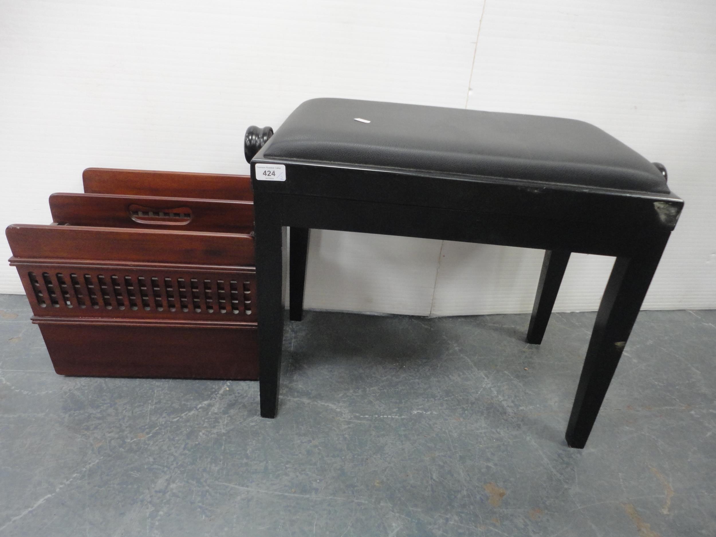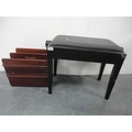 Adjustable ebonised piano stool and a magazine rack. (2)