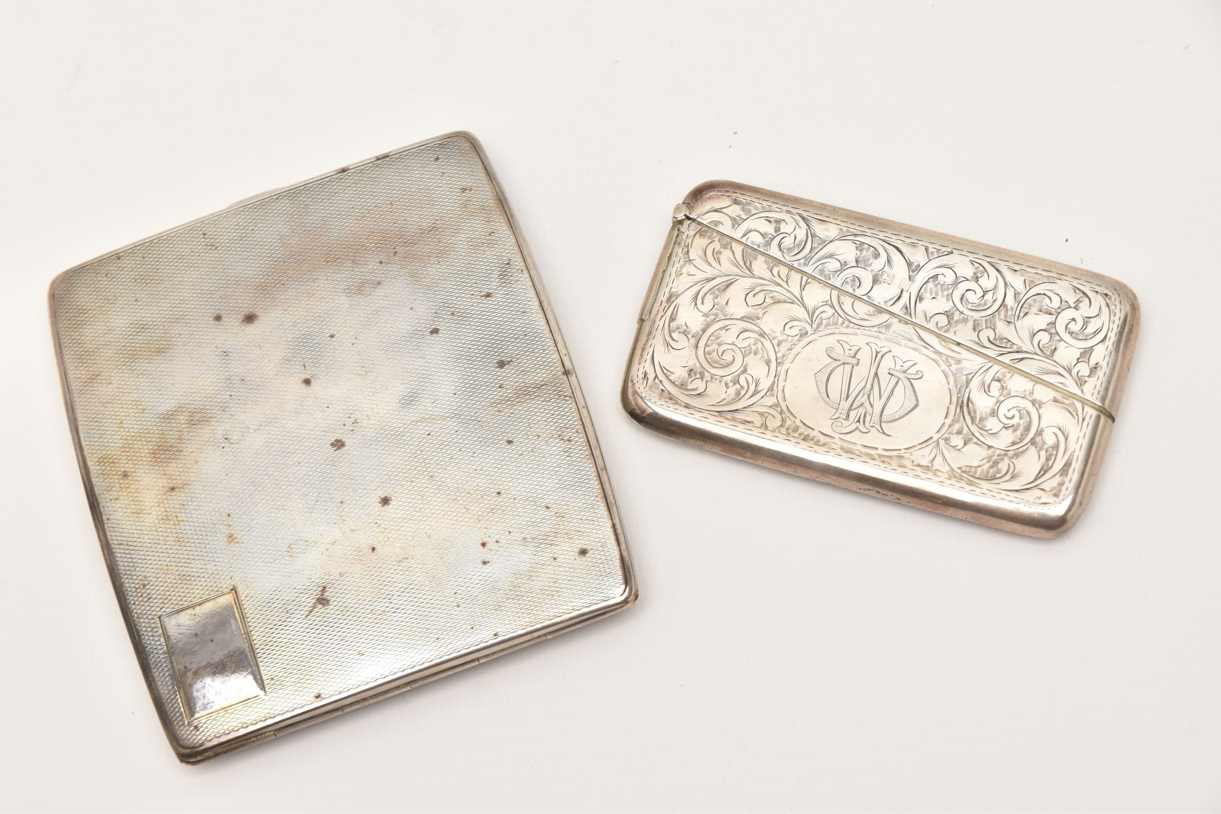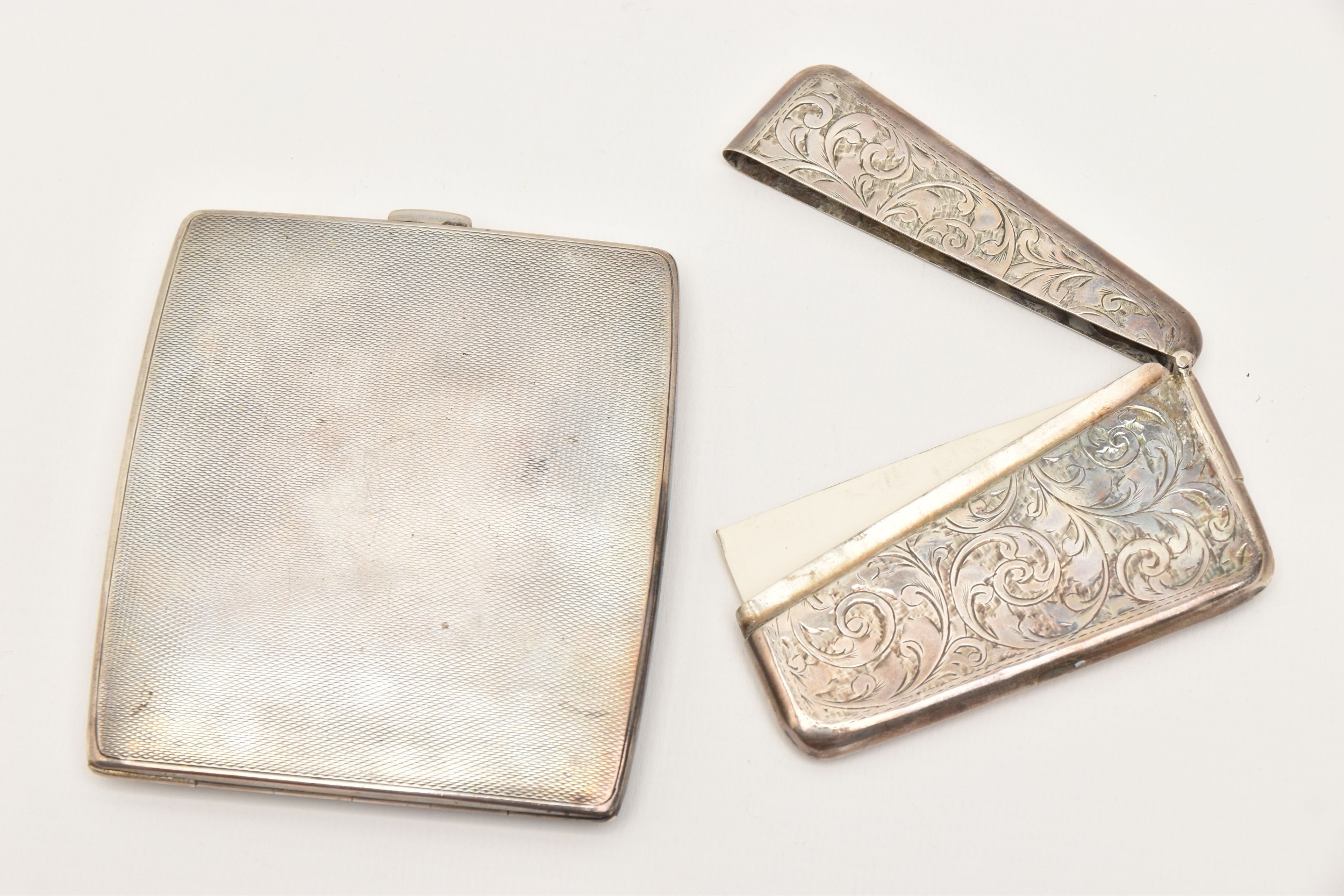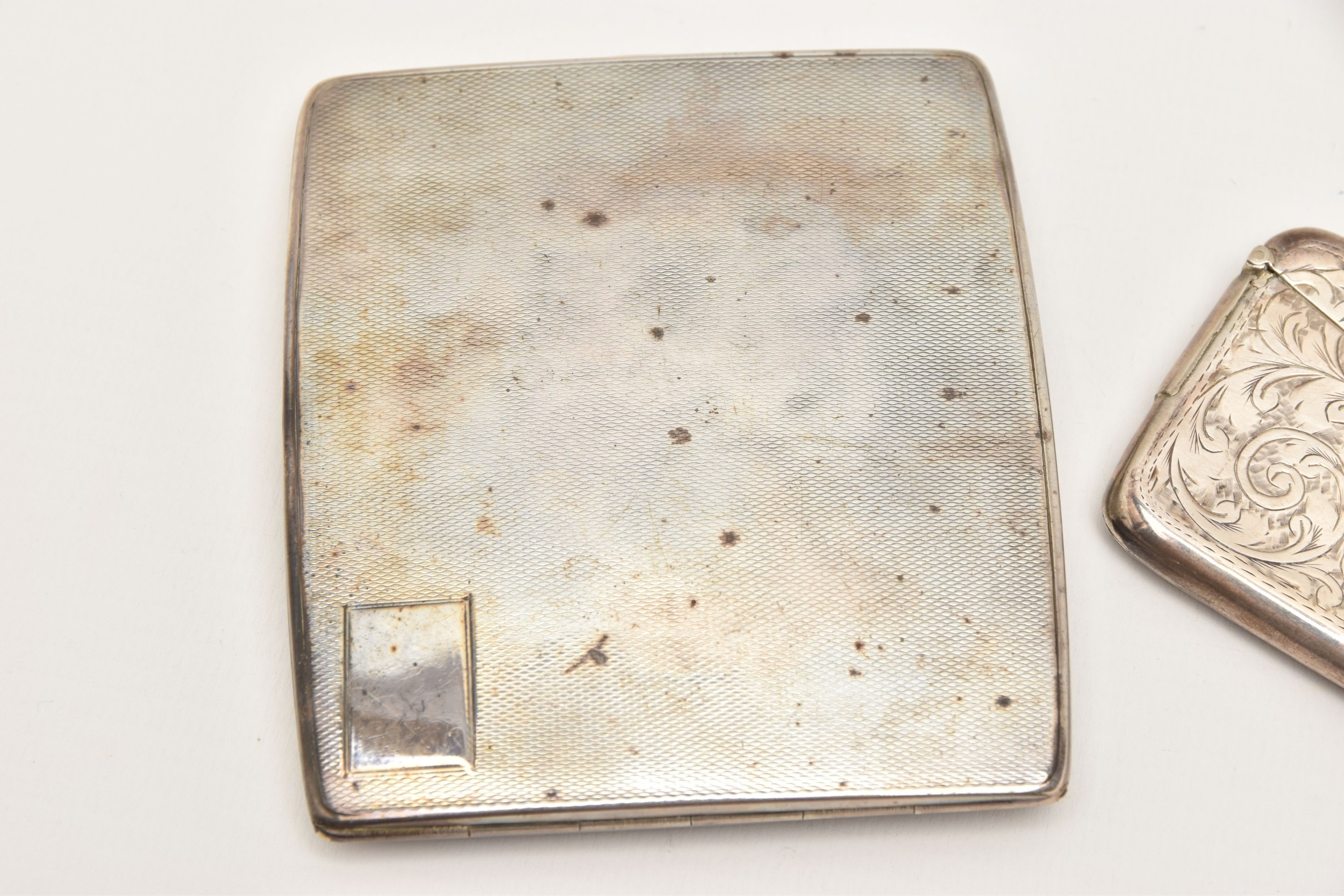 A SILVER CIGARETTE CASE AND CARD CASE, the cigarette case of a square form with engine turned pattern and vacant cartouche, push button clasp, gilt interior fitted with a red ribbon not original, hallmarked 'Thomas William Lack' London 1934, together with a foliate pattern card case with engraved cartouche, hallmarked 'G E Walton & Co Ltd (George Edwin Walton)' Birmingham 1910, approximate gross weight 4.58 ozt, 142.6 grams (condition report: both have tarnishing, dinks and dents to the card case)