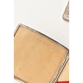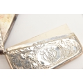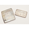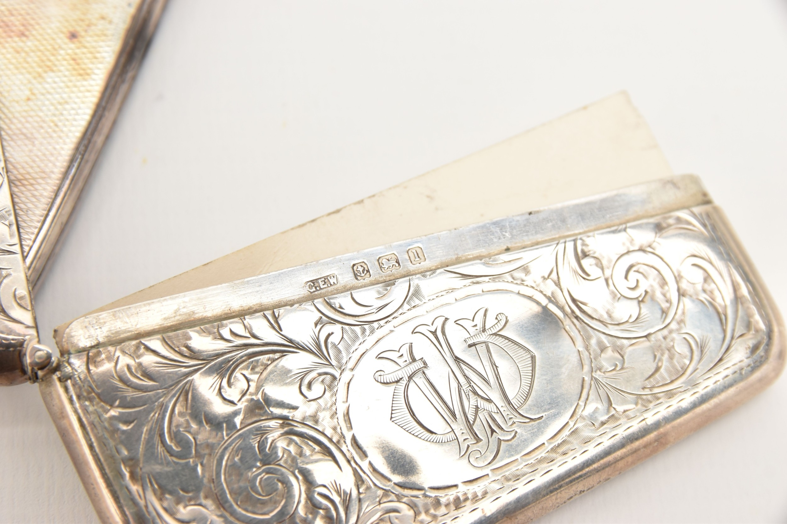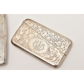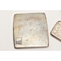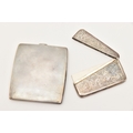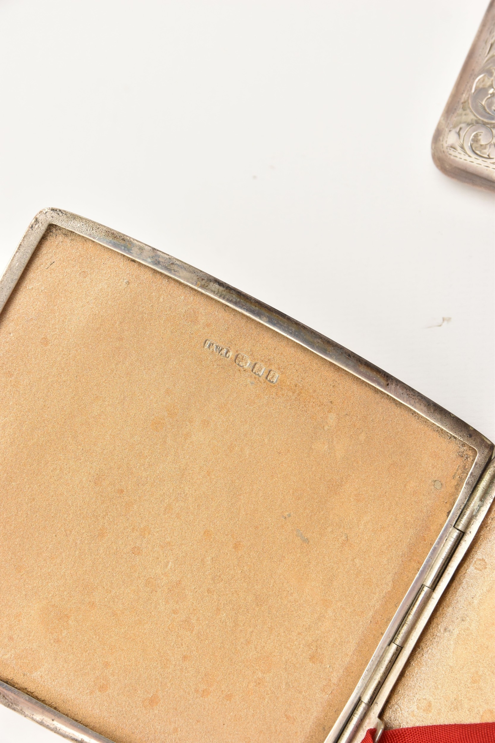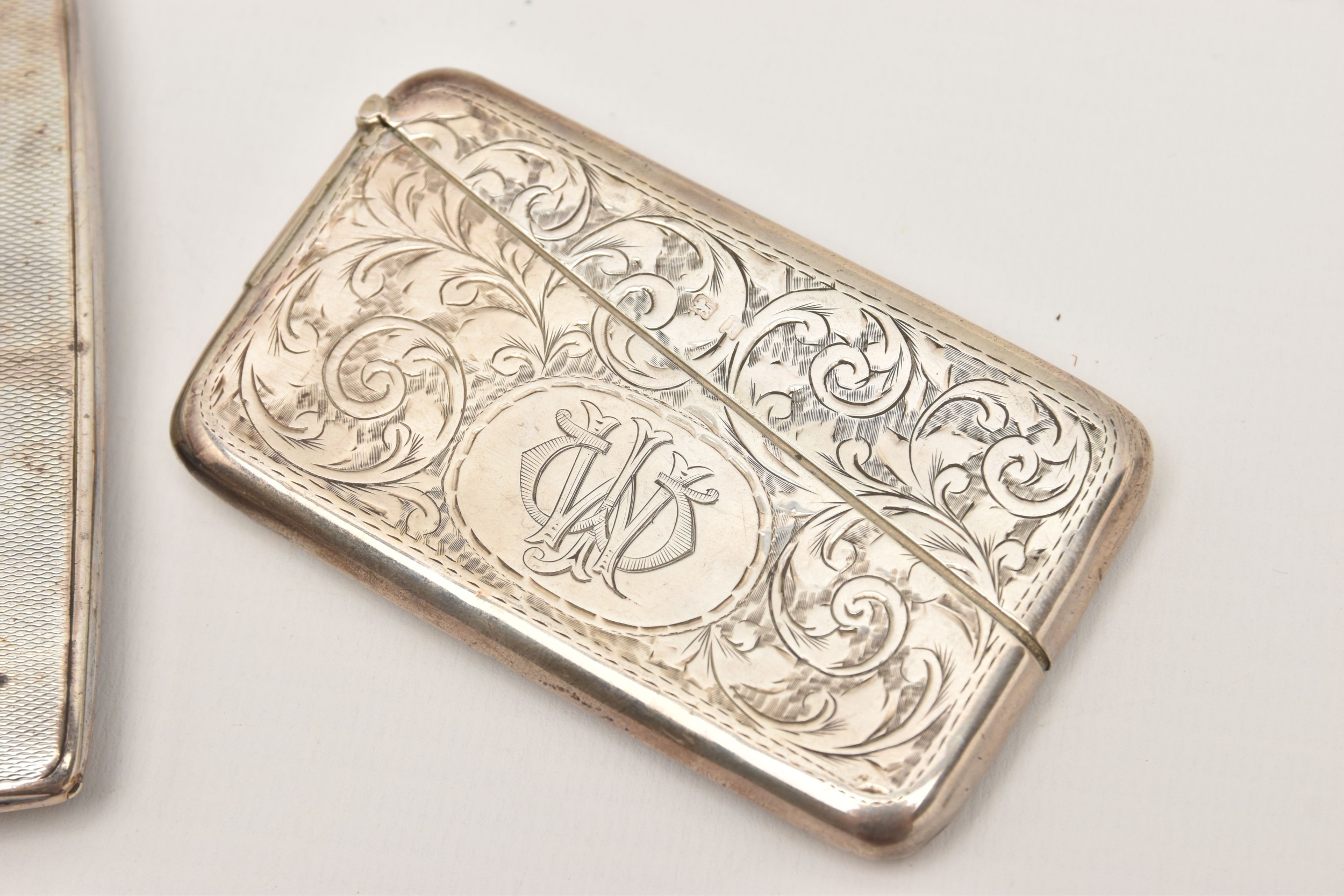 A SILVER CIGARETTE CASE AND CARD CASE, the cigarette case of a square form with engine turned pattern and vacant cartouche, push button clasp, gilt interior fitted with a red ribbon not original, hallmarked 'Thomas William Lack' London 1934, together with a foliate pattern card case with engraved cartouche, hallmarked 'G E Walton & Co Ltd (George Edwin Walton)' Birmingham 1910, approximate gross weight 4.58 ozt, 142.6 grams (condition report: both have tarnishing, dinks and dents to the card case)