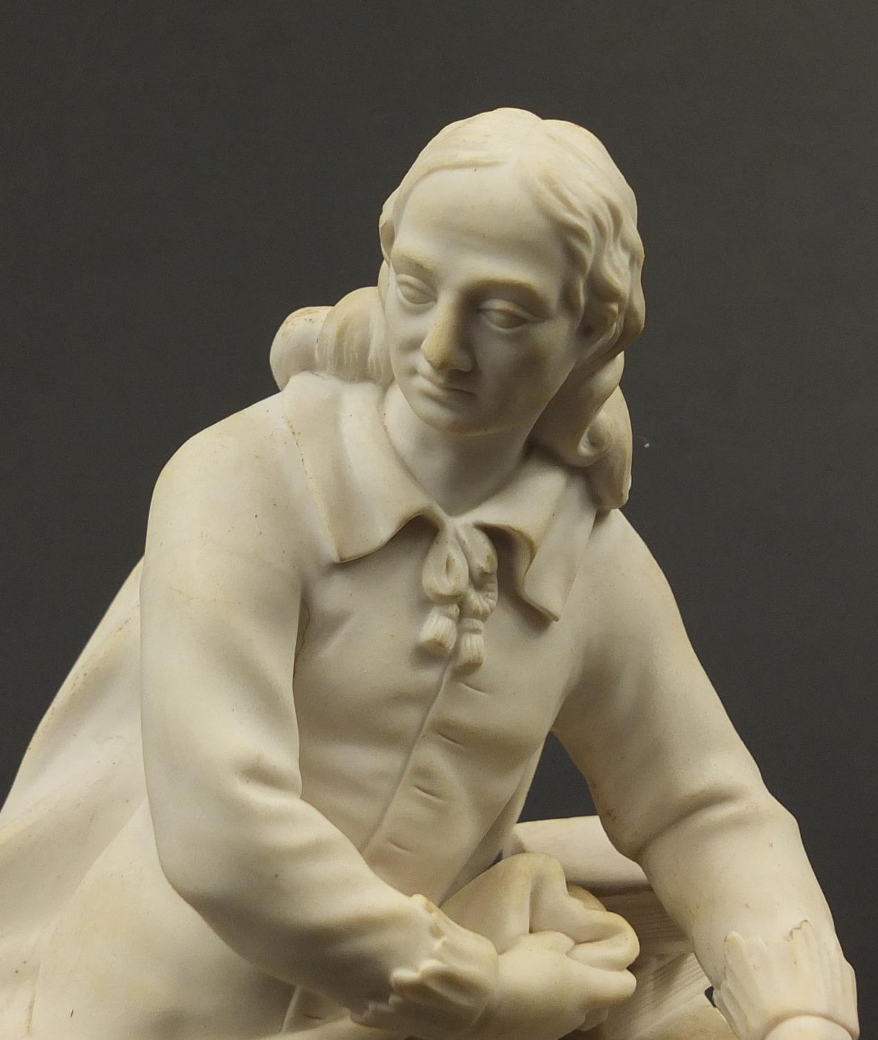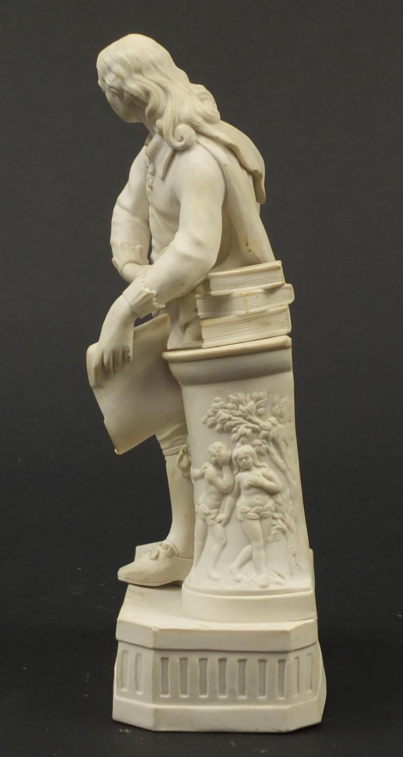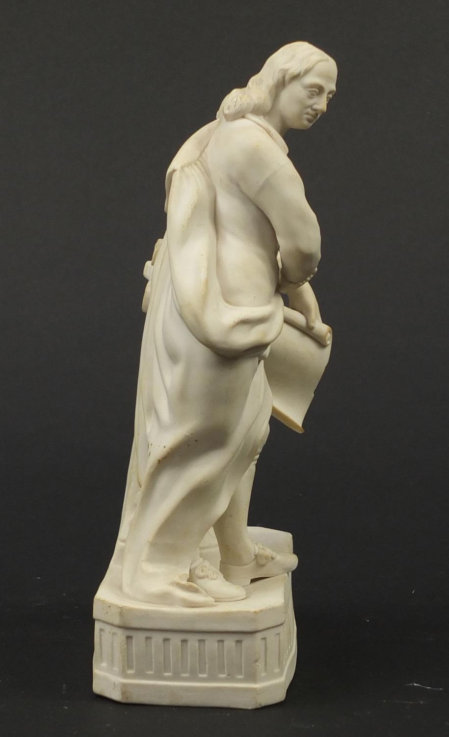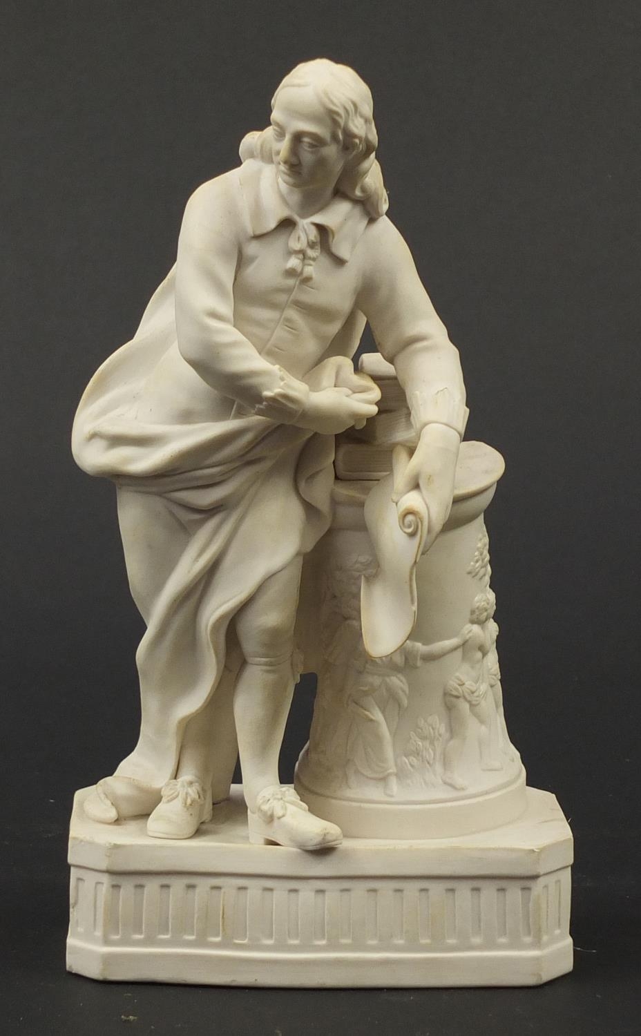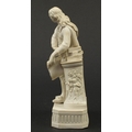 Victorian parian figure of a man beside a pillar holding a scroll, 24.5cm high