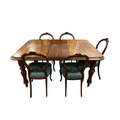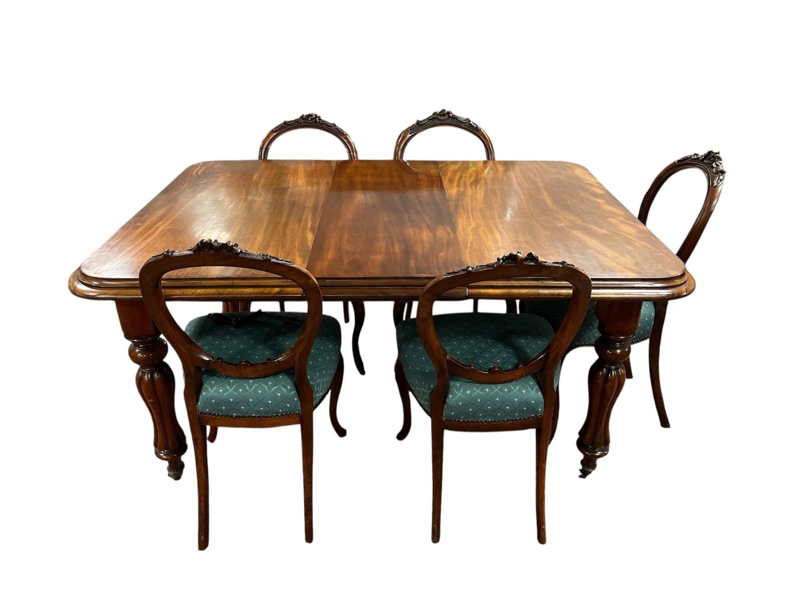 A SIX PIECE VICTORIAN MAHOGANY DINING ROOM SUITE comprising a set of five mahogany dining chairs each with a foliate carved top rail and splat with upholstered seats on cabriole legs the dining table of rectangular outline with one loose leaf on lobed tapering legs with castors 74cm (h) x 104cm (w) x 143cm (l)