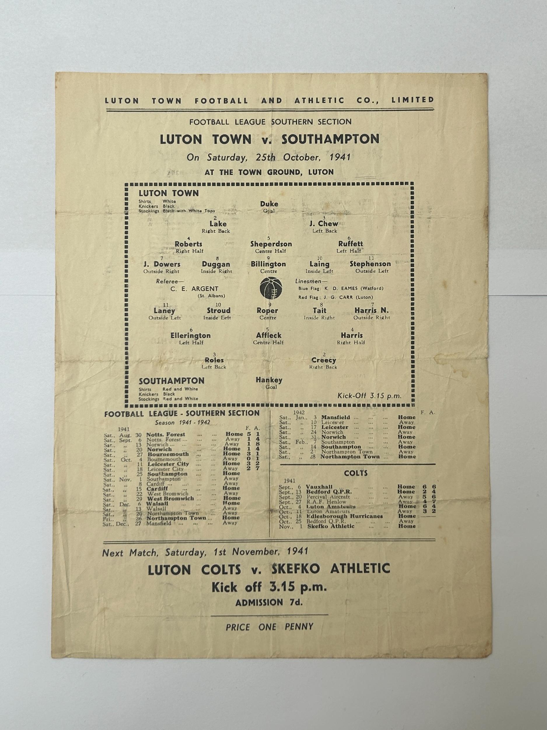 LUTON TOWN VERSUS SOUTHAMPTON 1941/42 FOOTBALL PROGRAMME, 25/10/1941, SINGLE SHEET ISSUE. CREASING NOTED, MINOR FOXING.