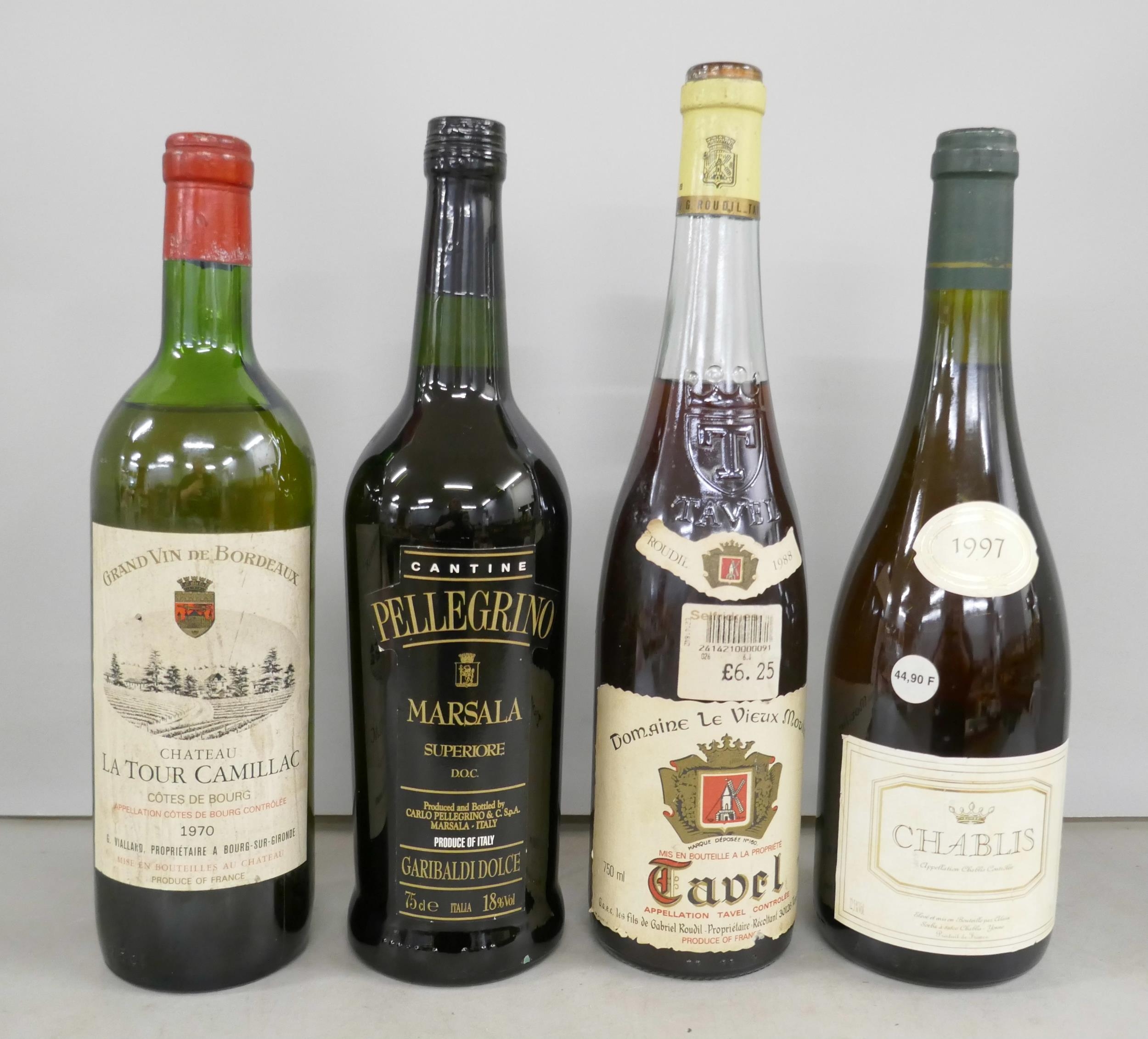 Four bottles; 1970 Chateau La Tour Camillac, 1997 Chablis, Pellegrino Marsala and Tavel