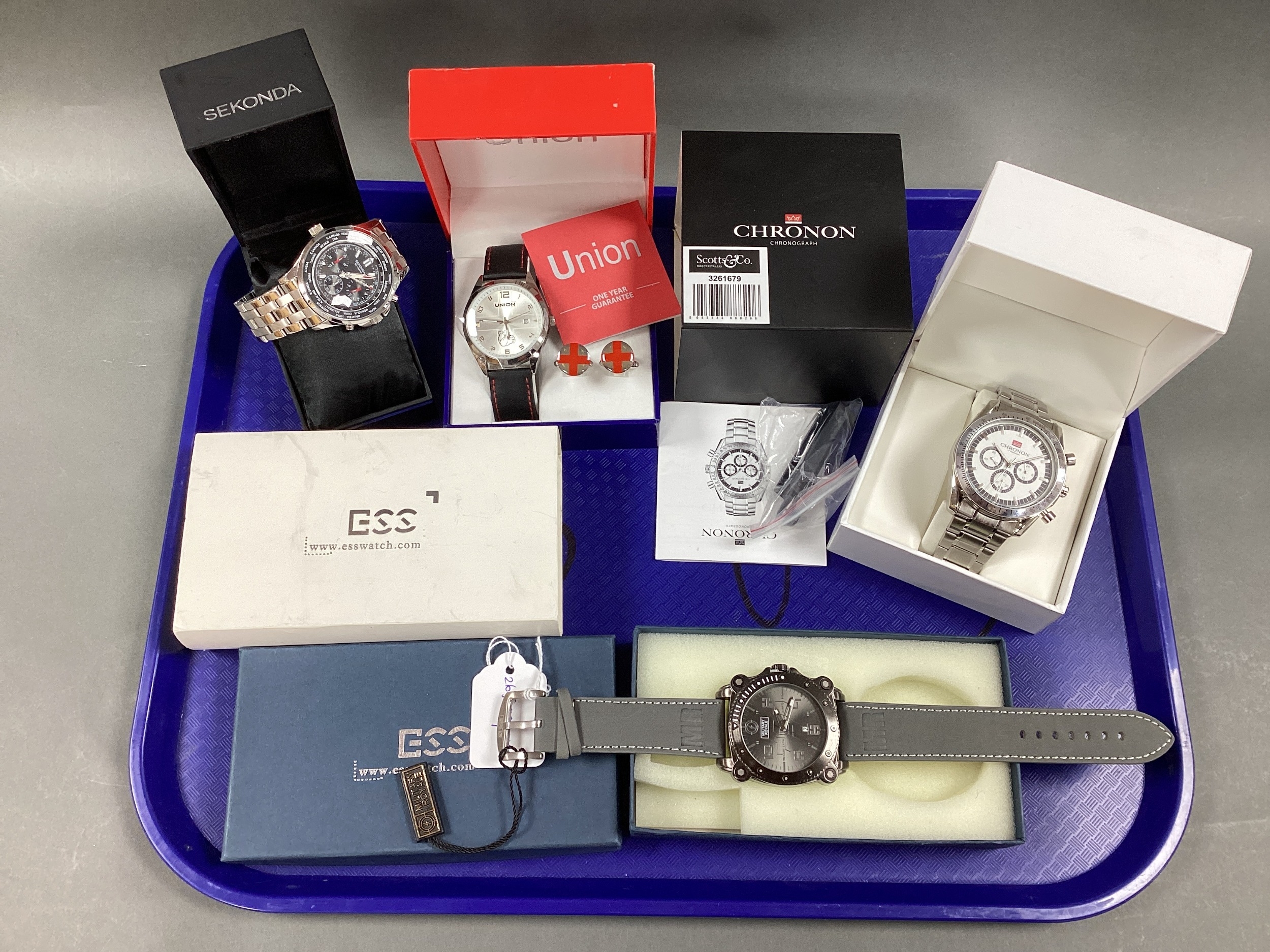 ESS Modern Military Royale Chunky Gent's Wristwatch, boxed; Chronon, Sekonda and Union modern gent's wristwatches, boxed :- One Tray [954404]