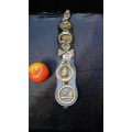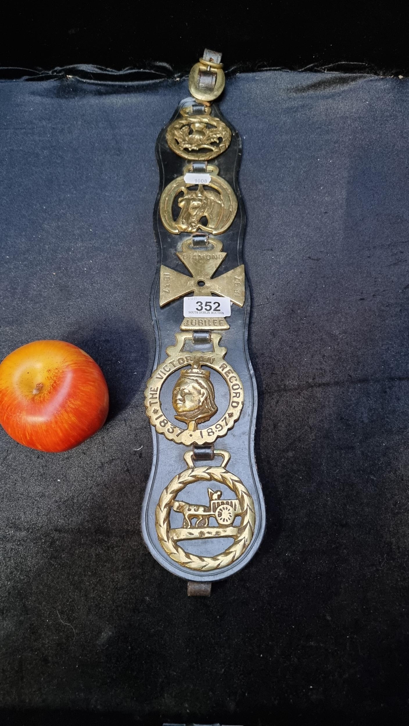 Set of Victorian horse brasses on a black leather martingale. Including a queen Victoria horse brass.