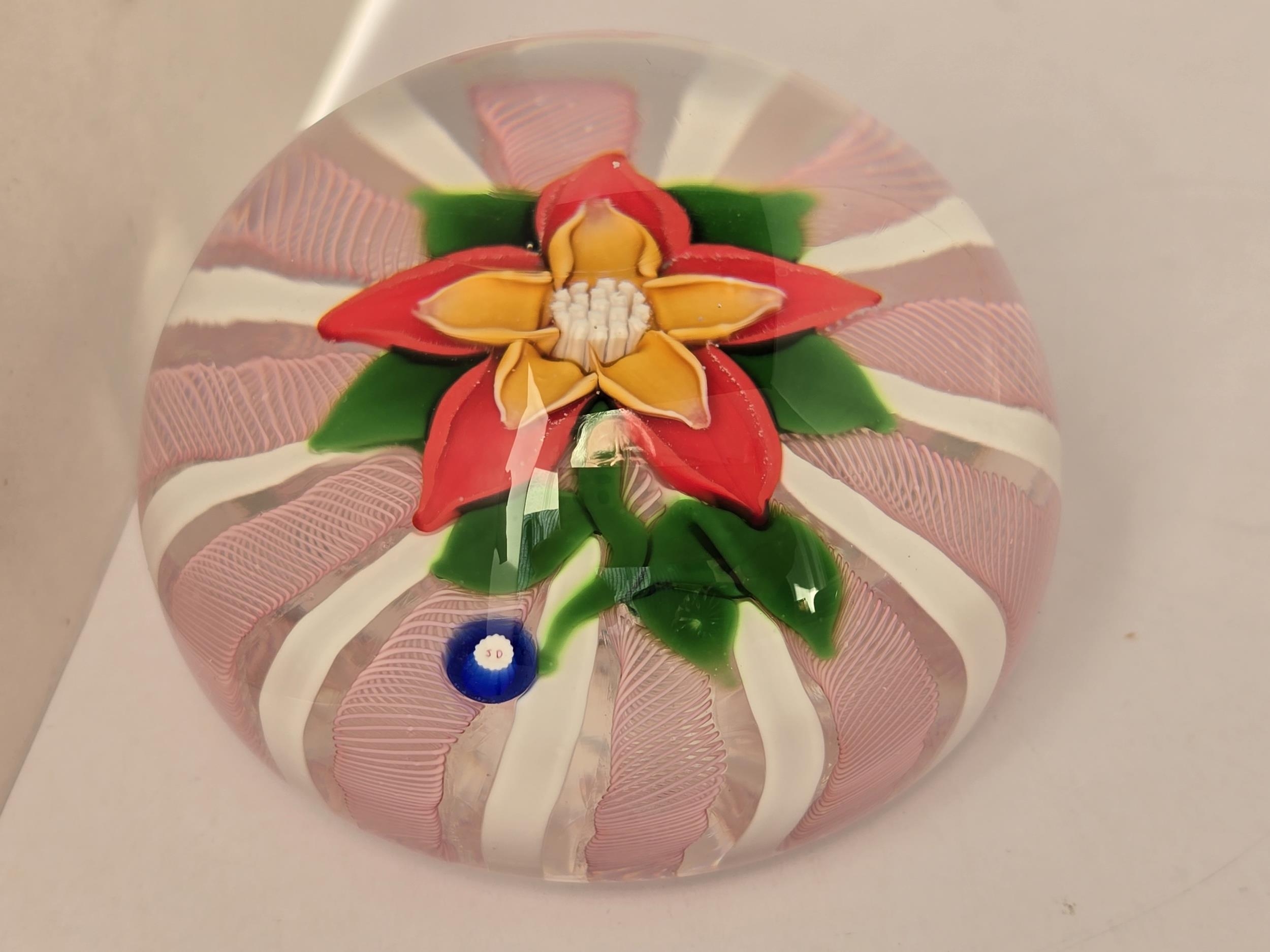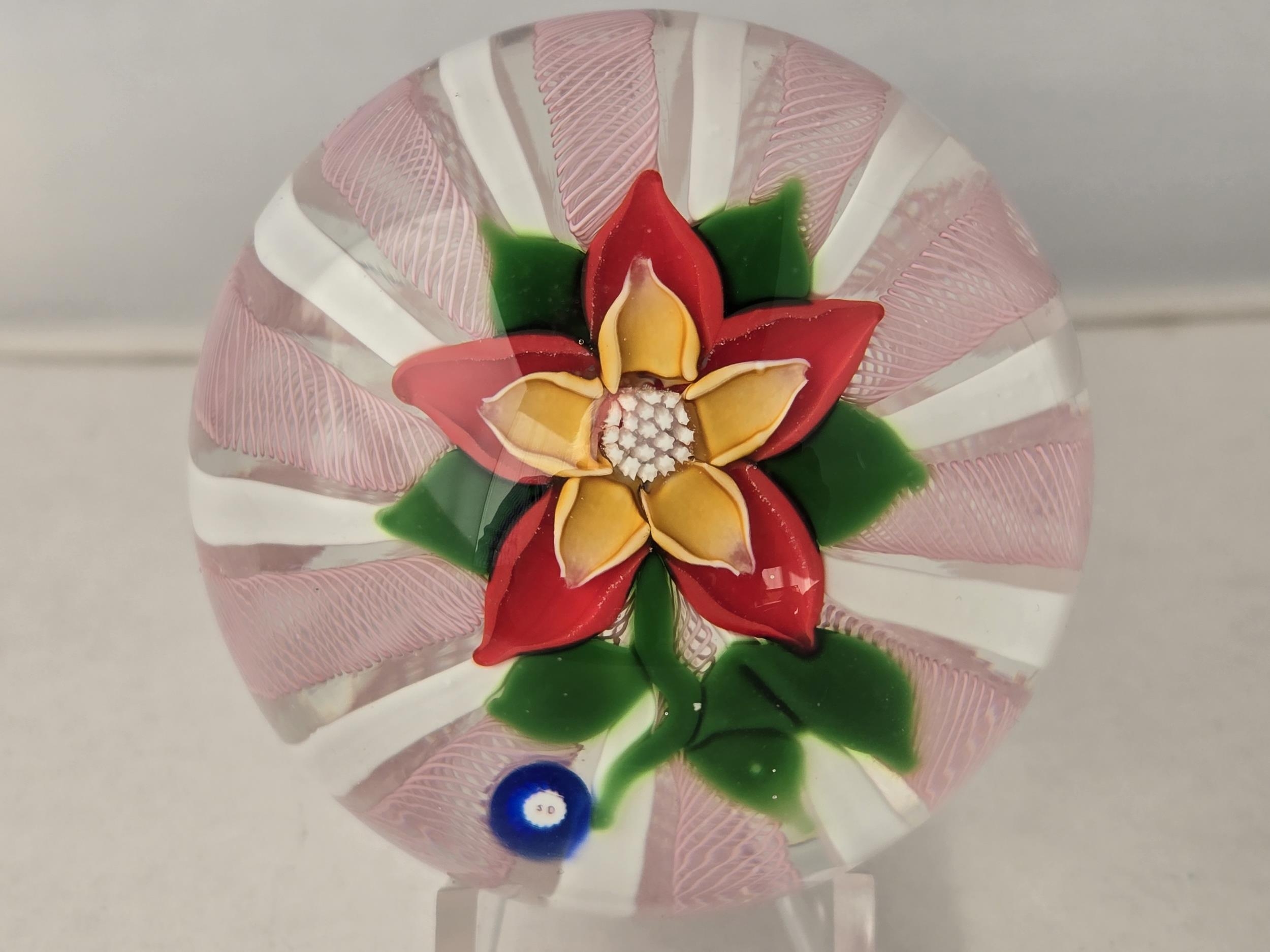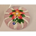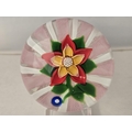 Deacons Glass paperweight - Really well made 1:1 piece, pink twist and white latticinio cushion, on which sits stem, leaves and a colourful red and yellow flower. Excellent condition. 70mm diam