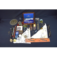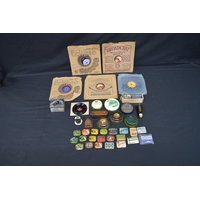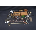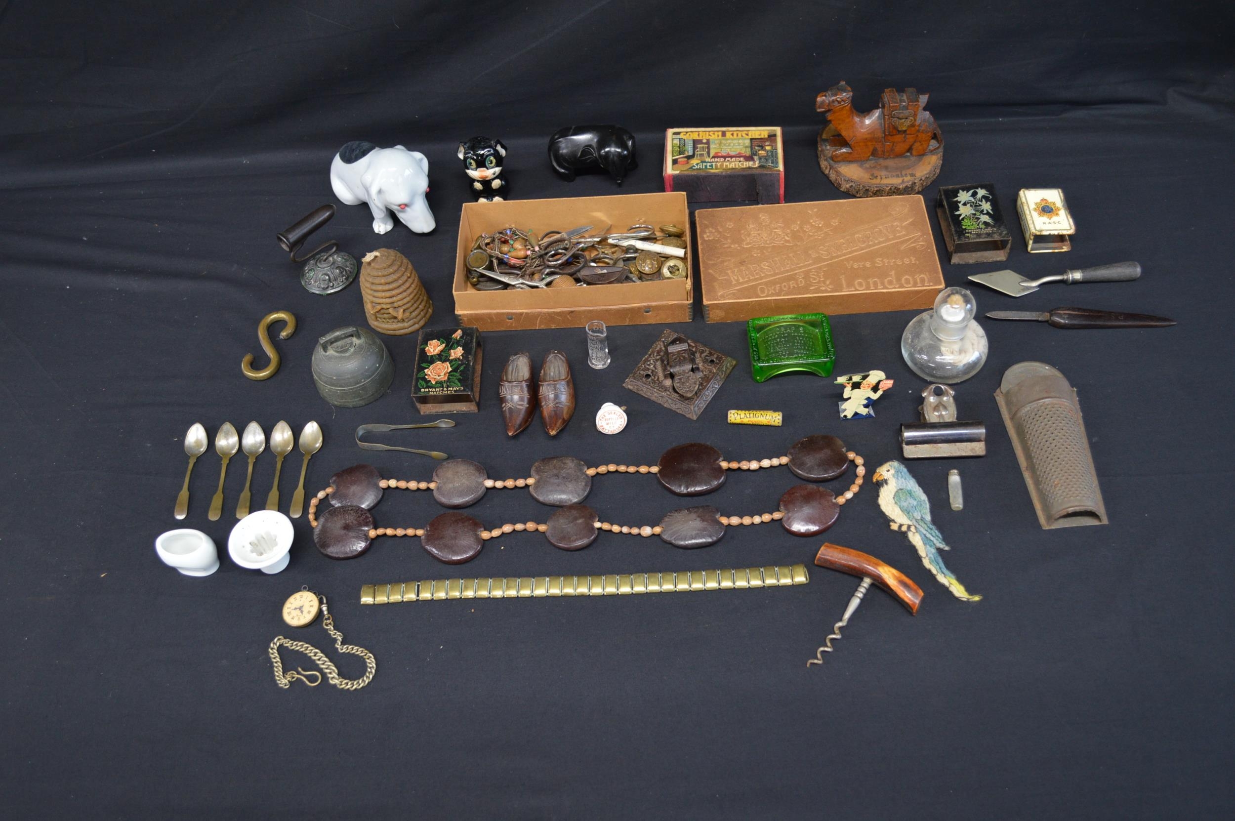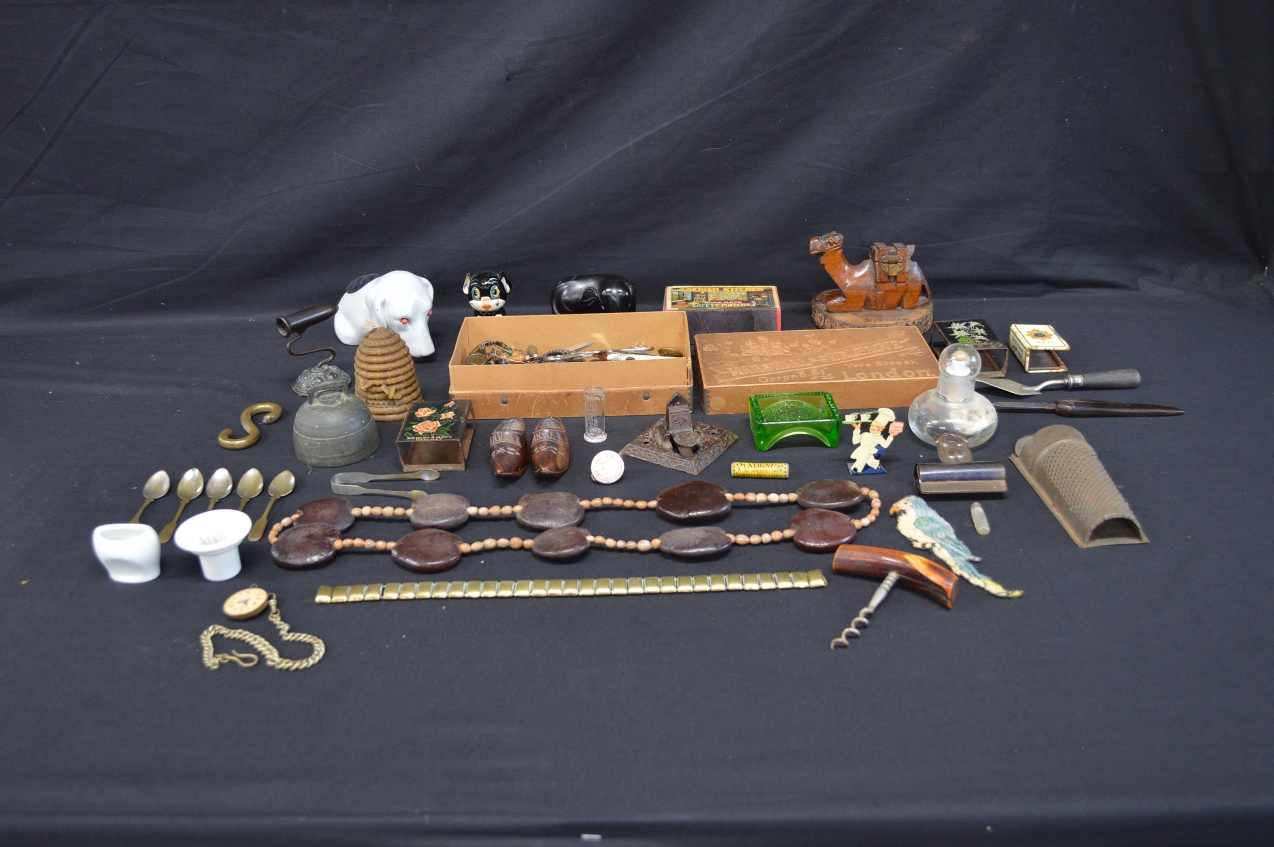 Collection of sundry items to include: dog form pin cushion, matchbox holders, paper clip, eye bath and cork screw etc