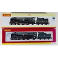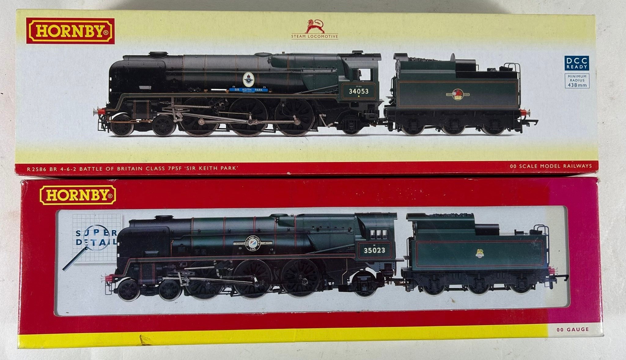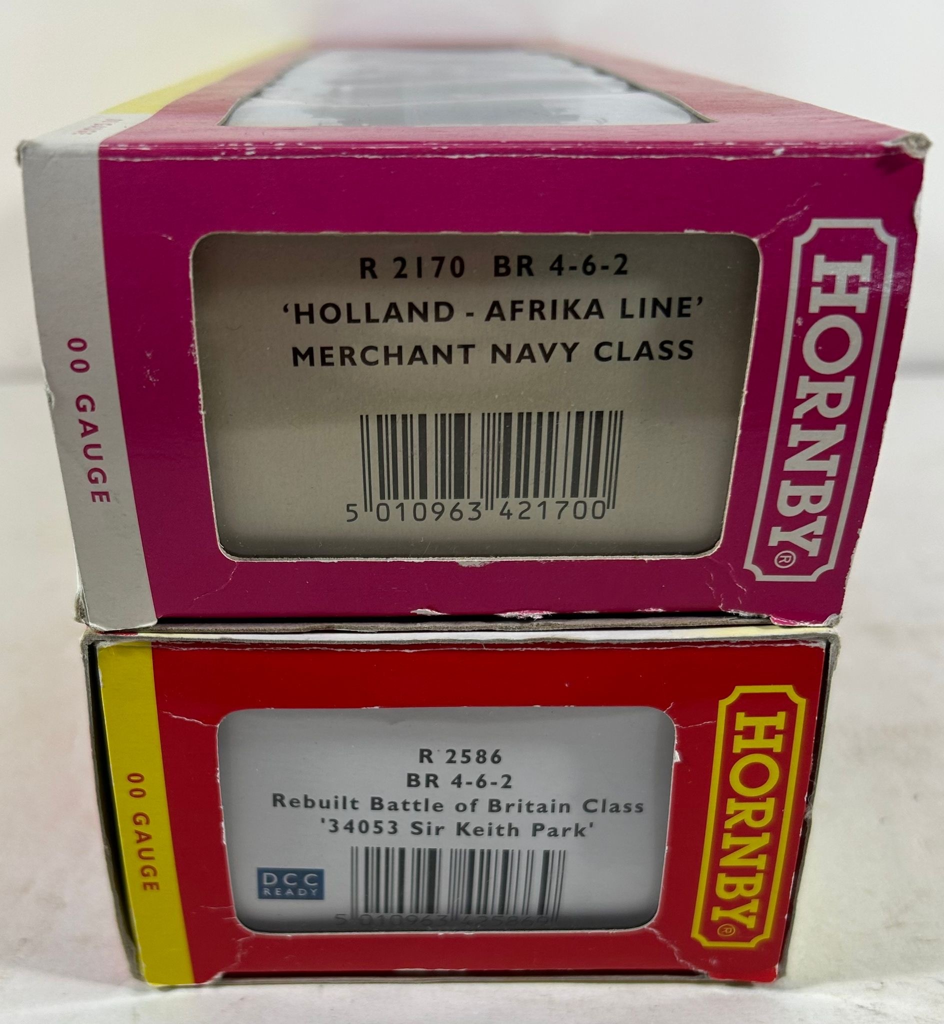 2 Hornby OO BR Tender Locomotives. A rebuilt Battle of Britain Class 4-6-2 'Sir Keith Park' 34053 (R.2586). Plus a rebuilt Merchant Navy Class 4-6-2 'Holland Afrika Line' 35023 (R.2170). Both boxed, minor wear. Contents VGC-Mint.