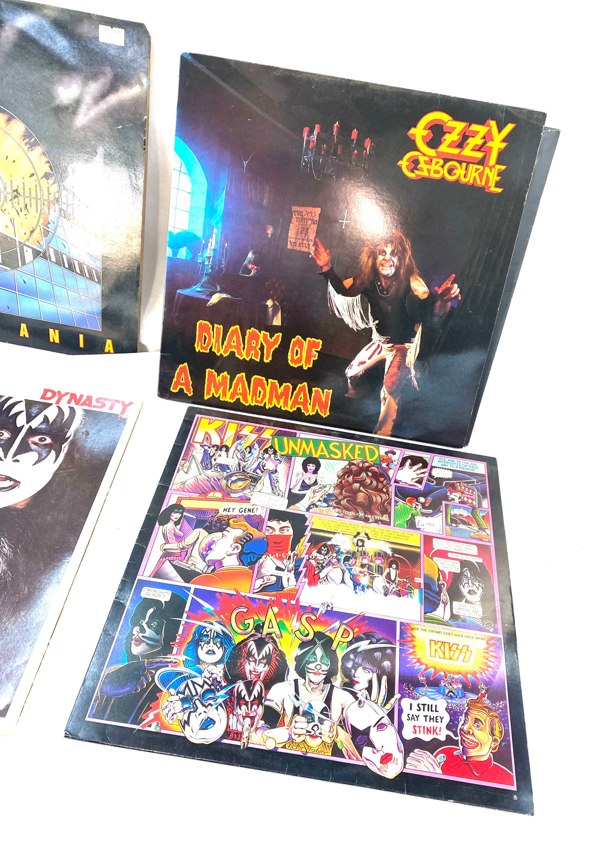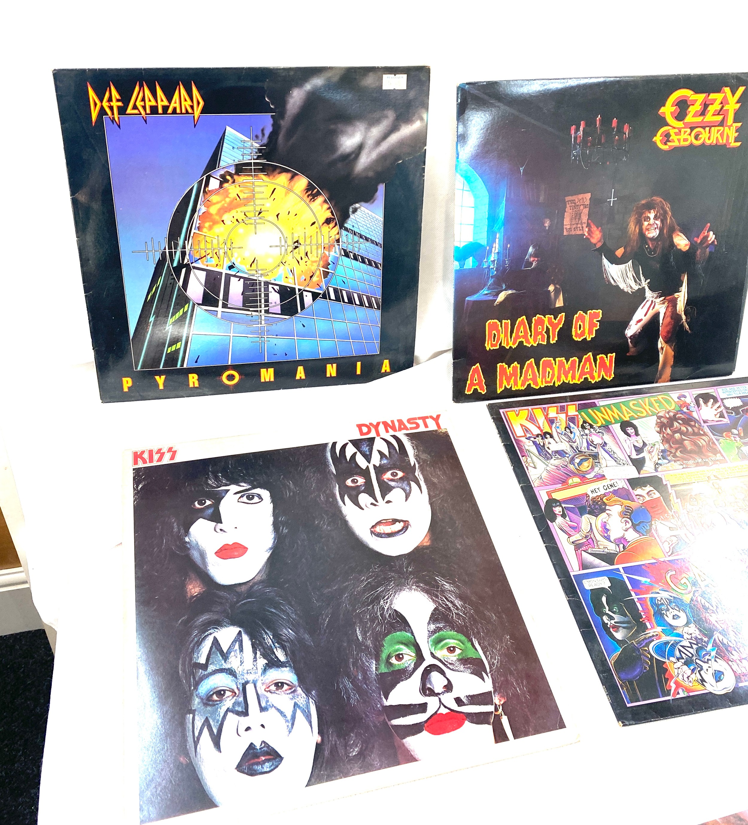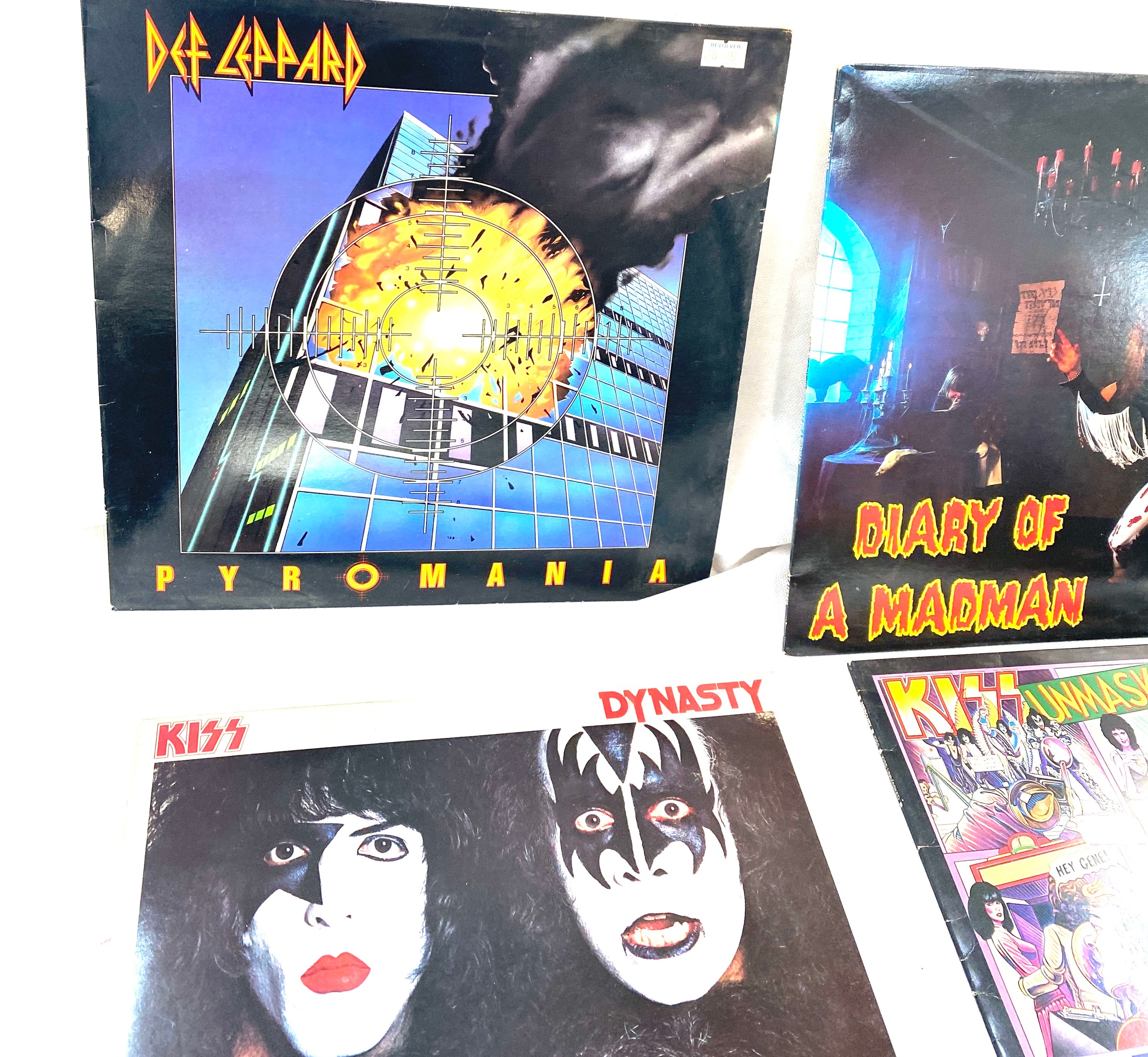Selection of four vinyl LPs to include Ozzy Osbourne, Kiss and Dek Leppard
