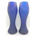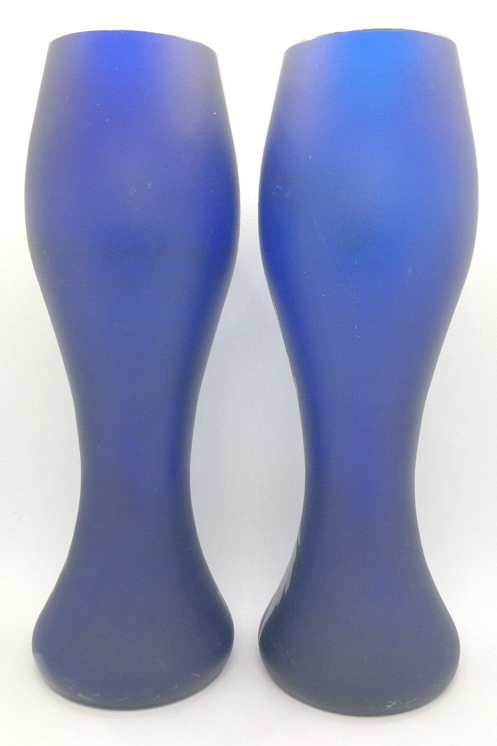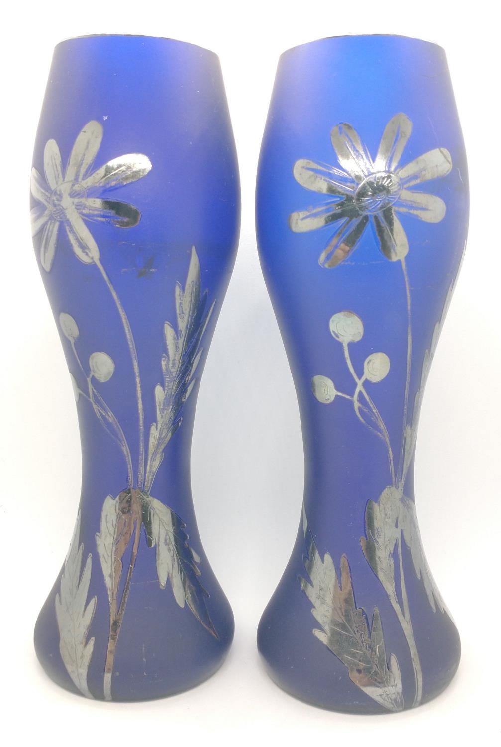 Pair of opaque blue vases with metallic floral design (approx. 18cm high)