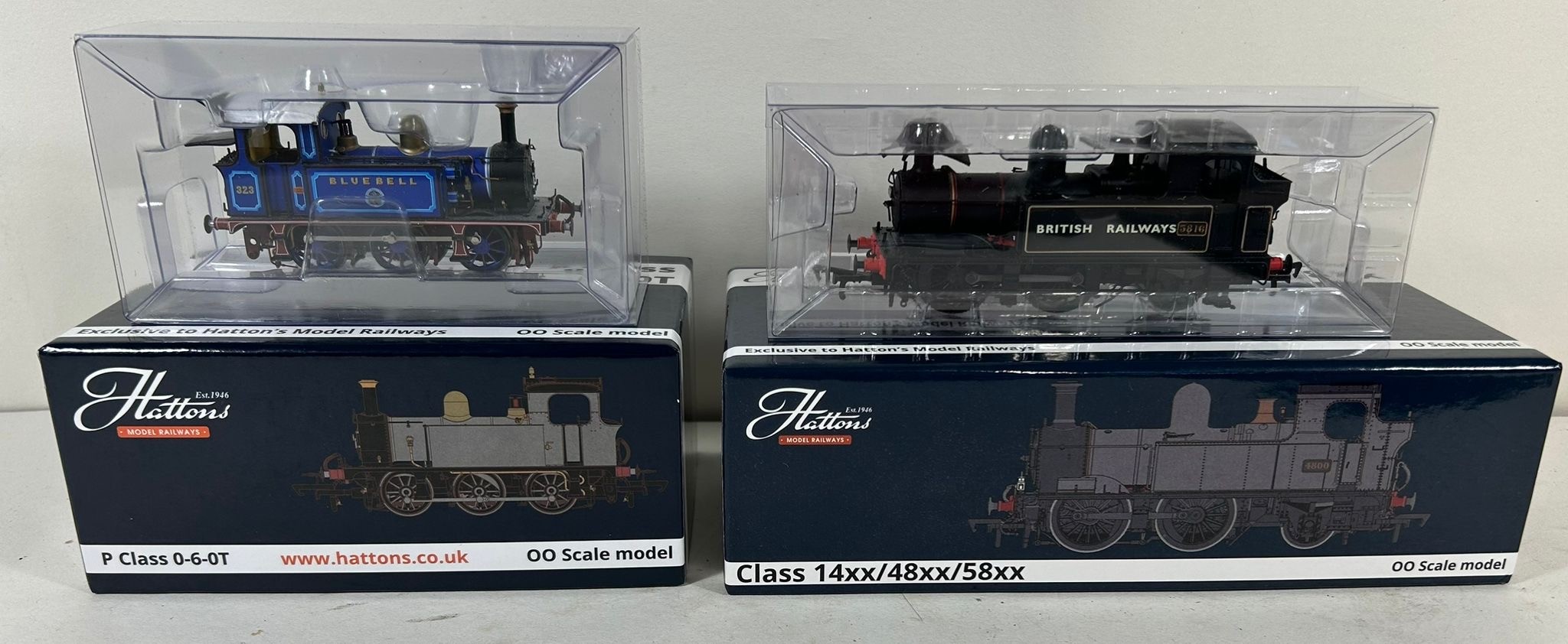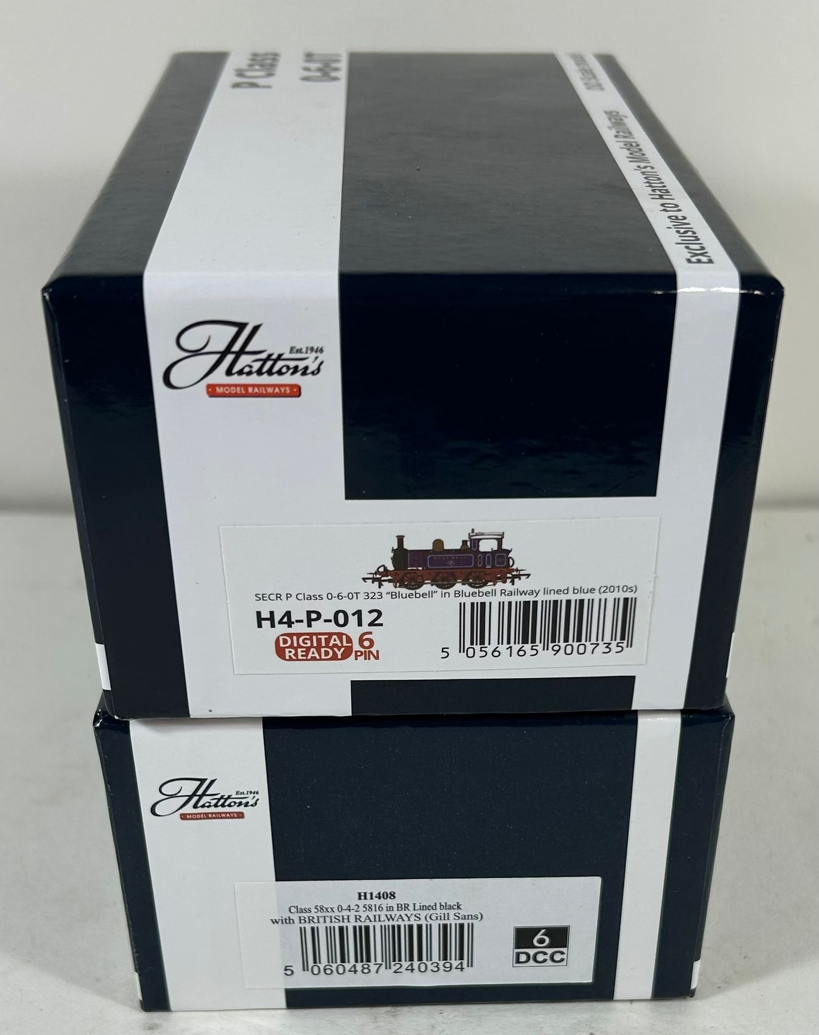 2 Hattons Originals OO Locomotives. An Ex SECR P Class 0-6-0 tank locomotive, 323 'Bluebell' (H4-P-012). In Bluebell Railway lined blue livery. Plus a Class 58XX 0-4-2T 5816 (H1408). In BR lined black livery, with British Railways to side tanks. Both boxed, with packing and operating instructions. Contents as new.