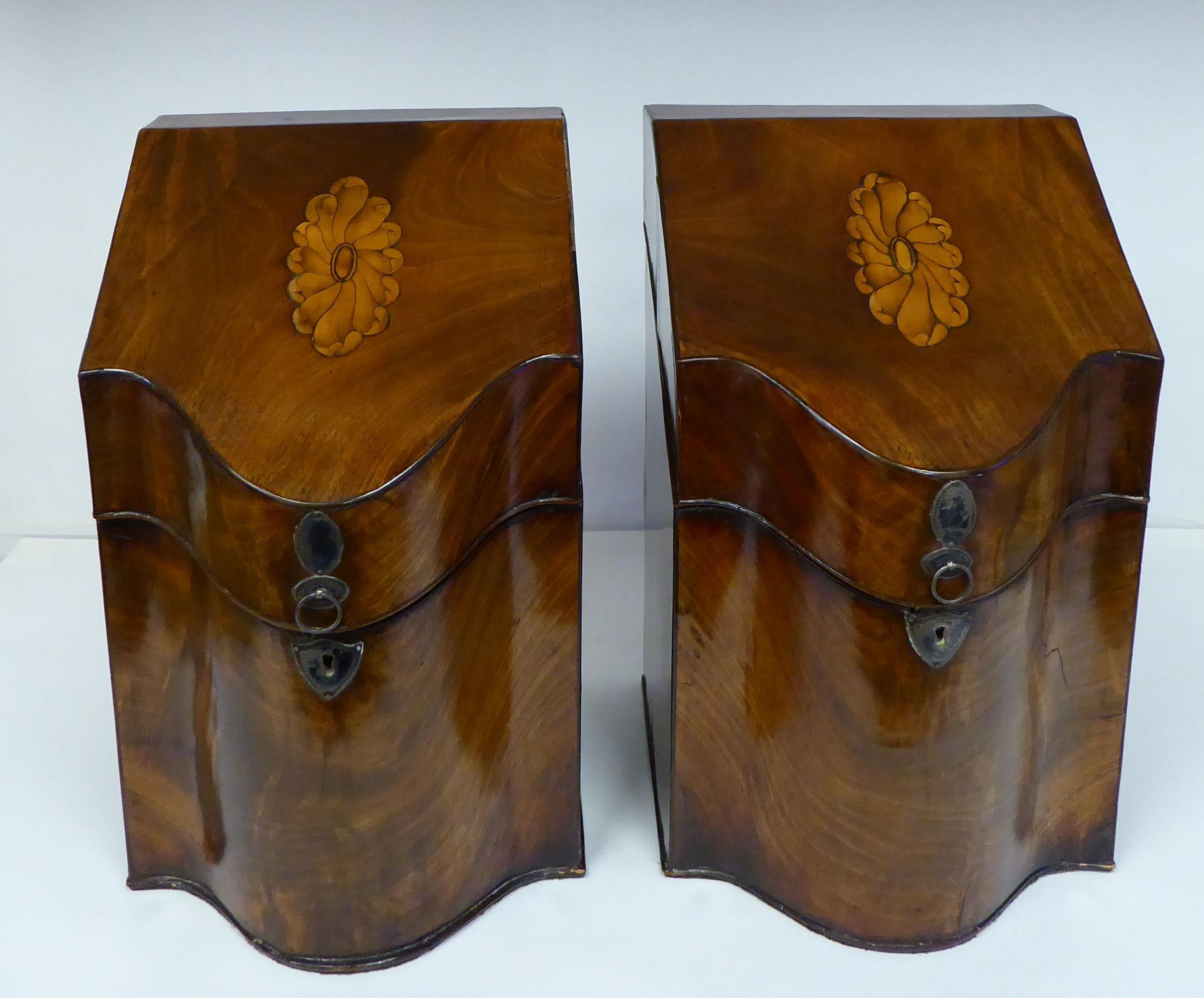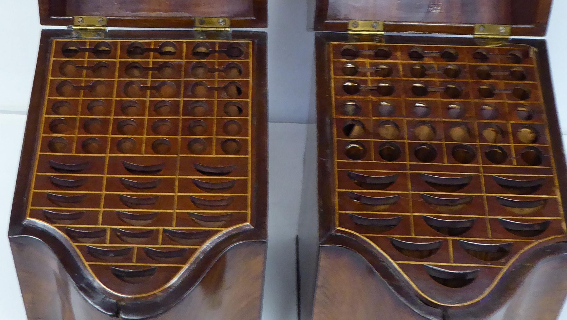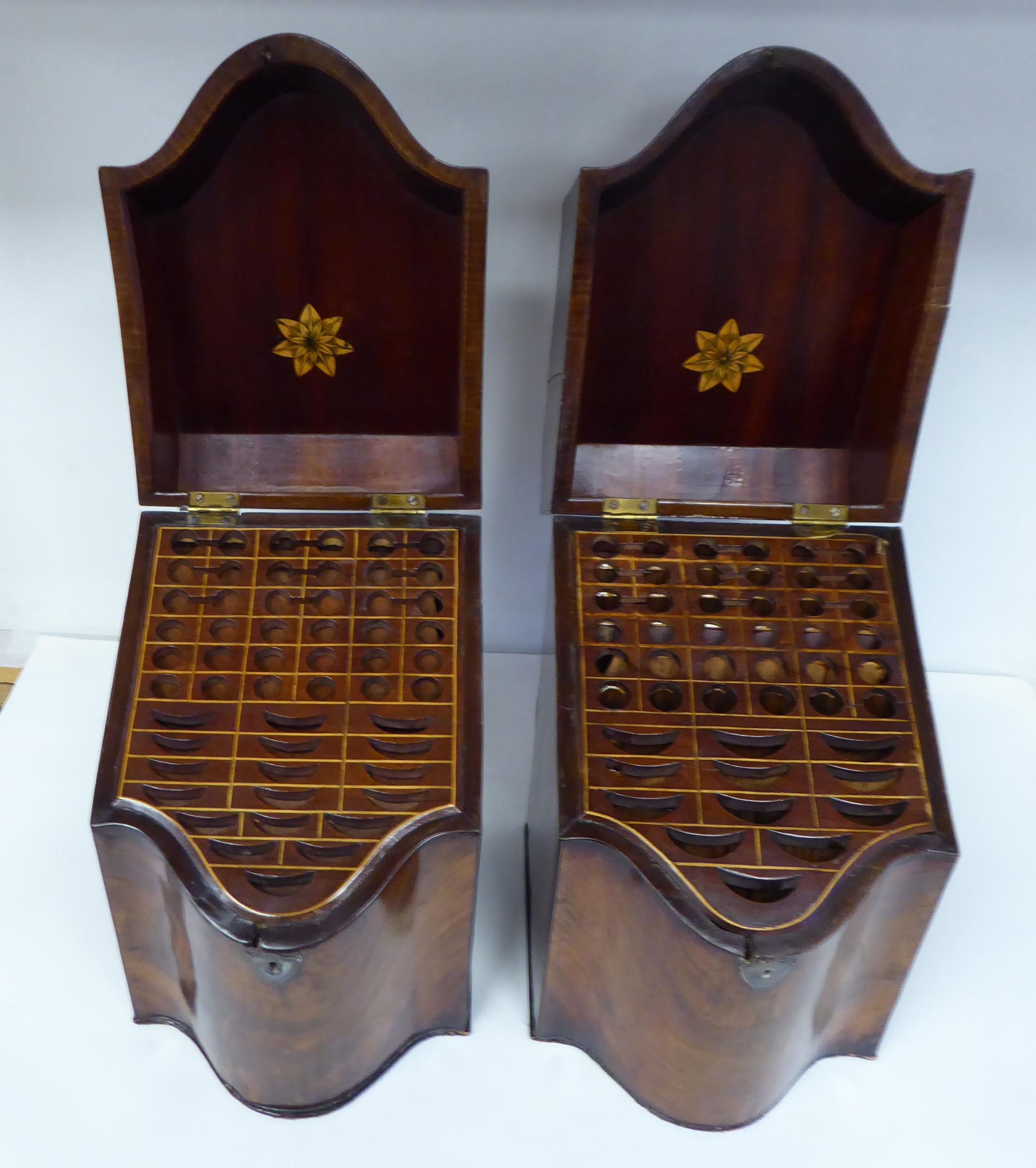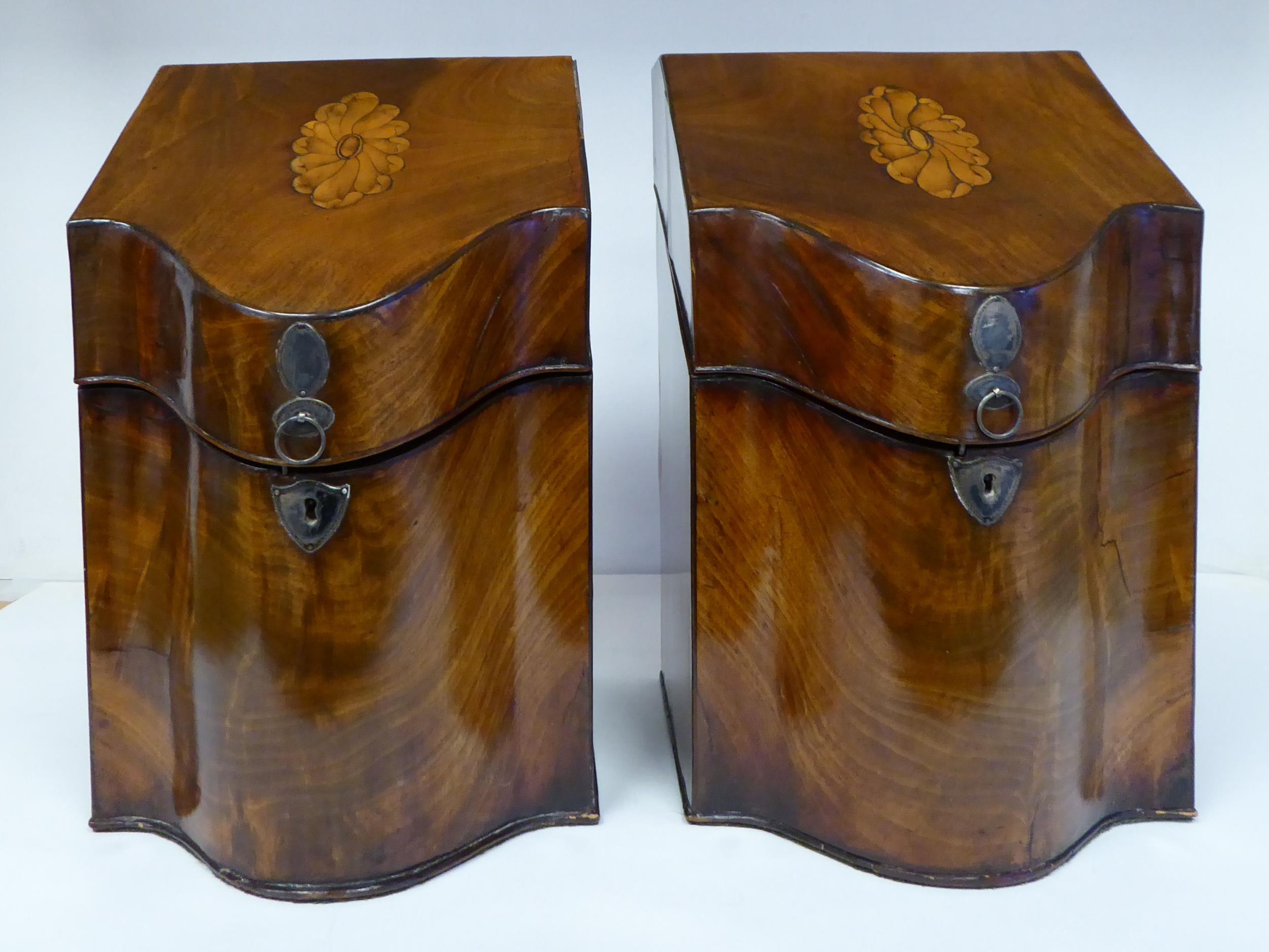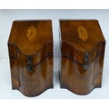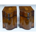 A pair of Regency serpentine front, mahogany knife boxes with satin marquetry ornament on the angled lids, enclosing identically pierced interiors 14"h 8.25"w