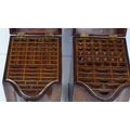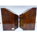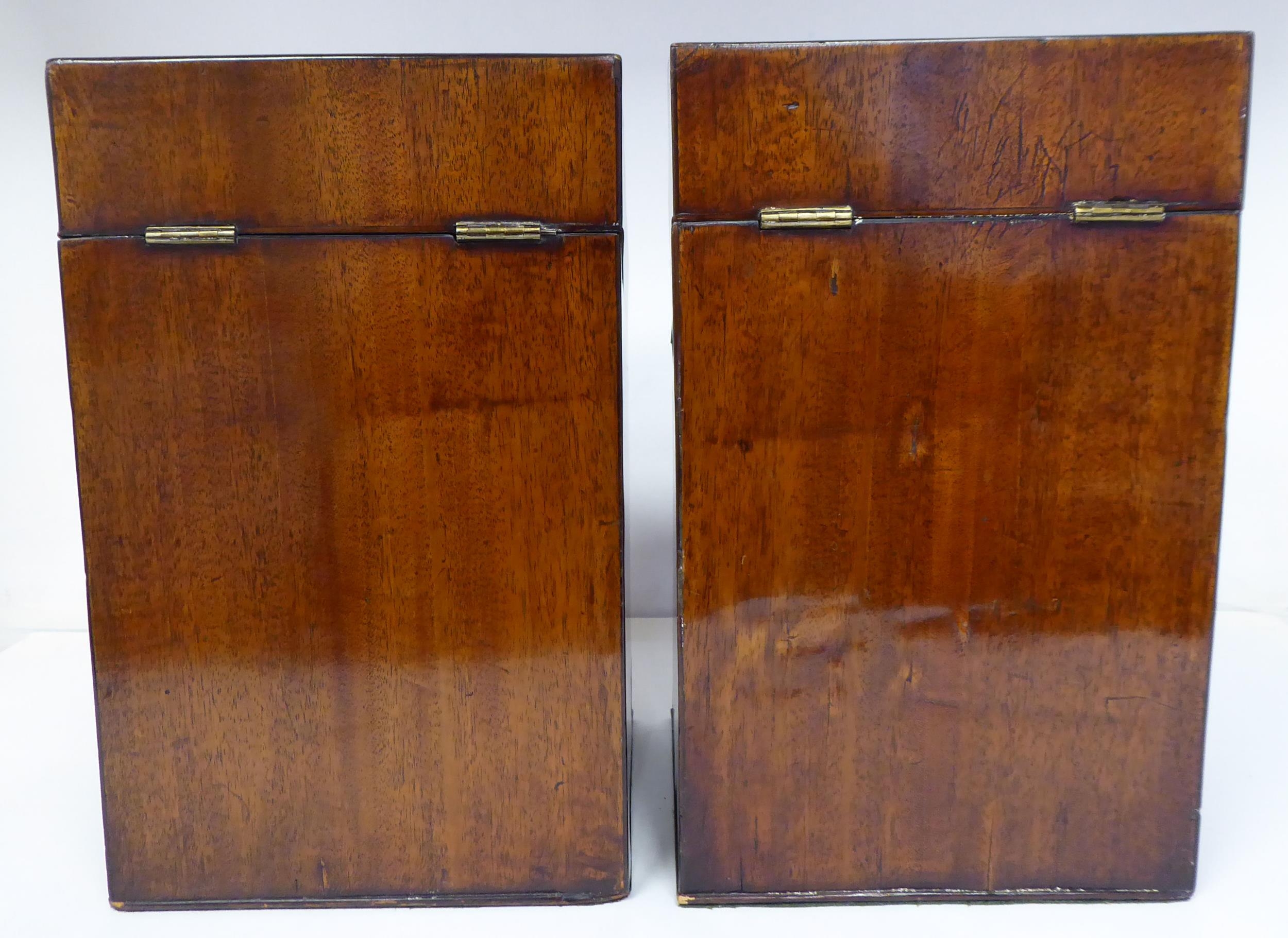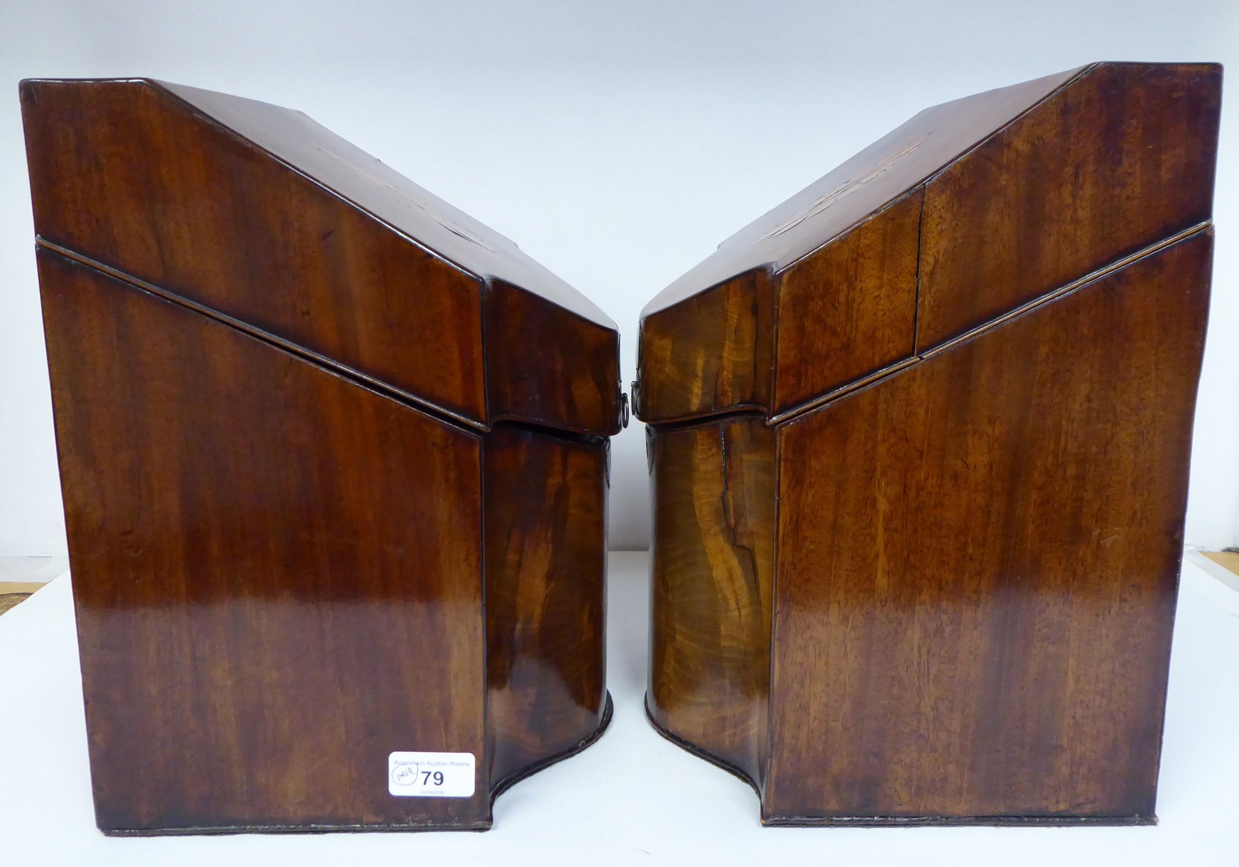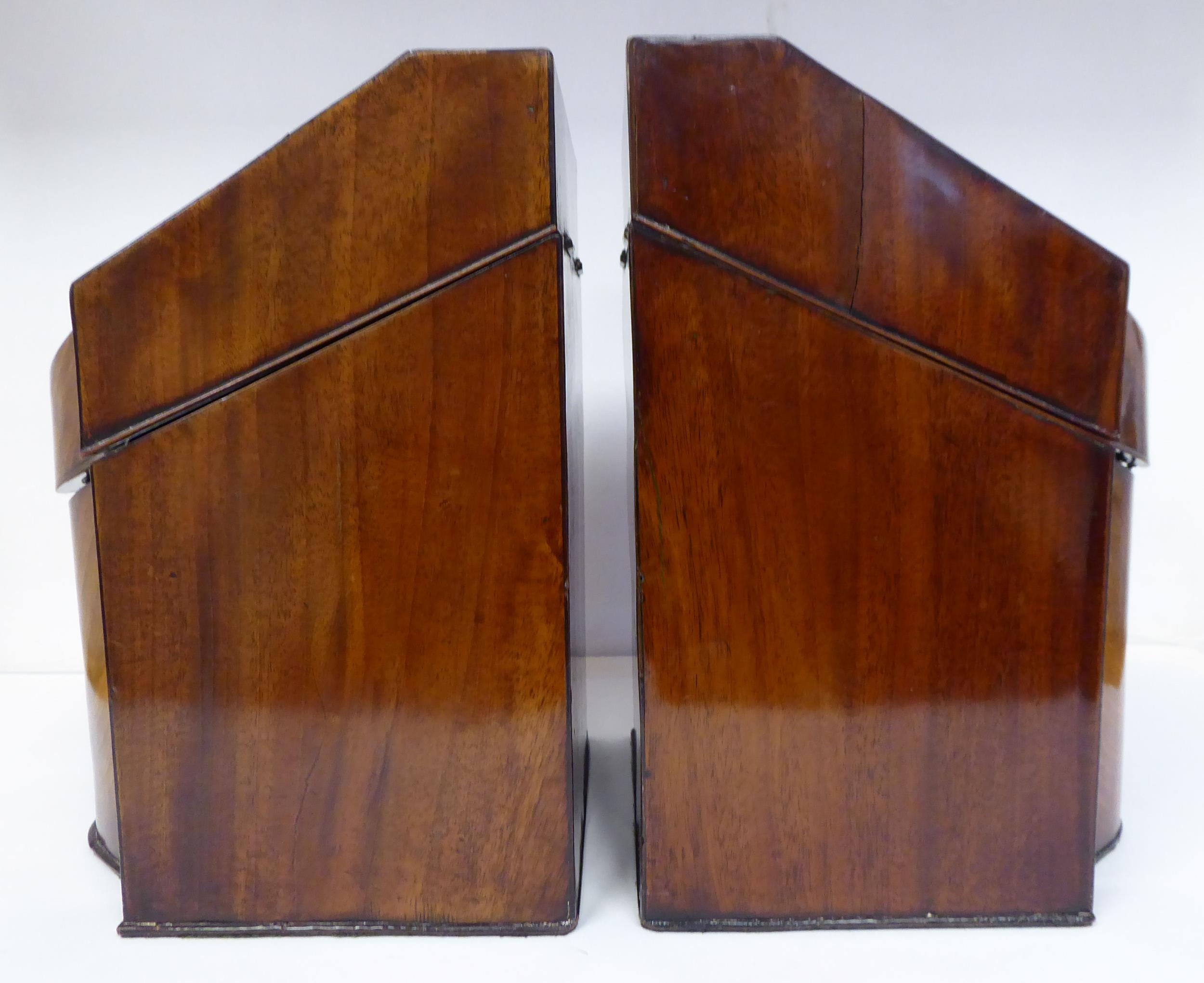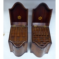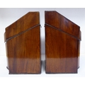 A pair of Regency serpentine front, mahogany knife boxes with satin marquetry ornament on the angled lids, enclosing identically pierced interiors 14"h 8.25"w