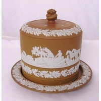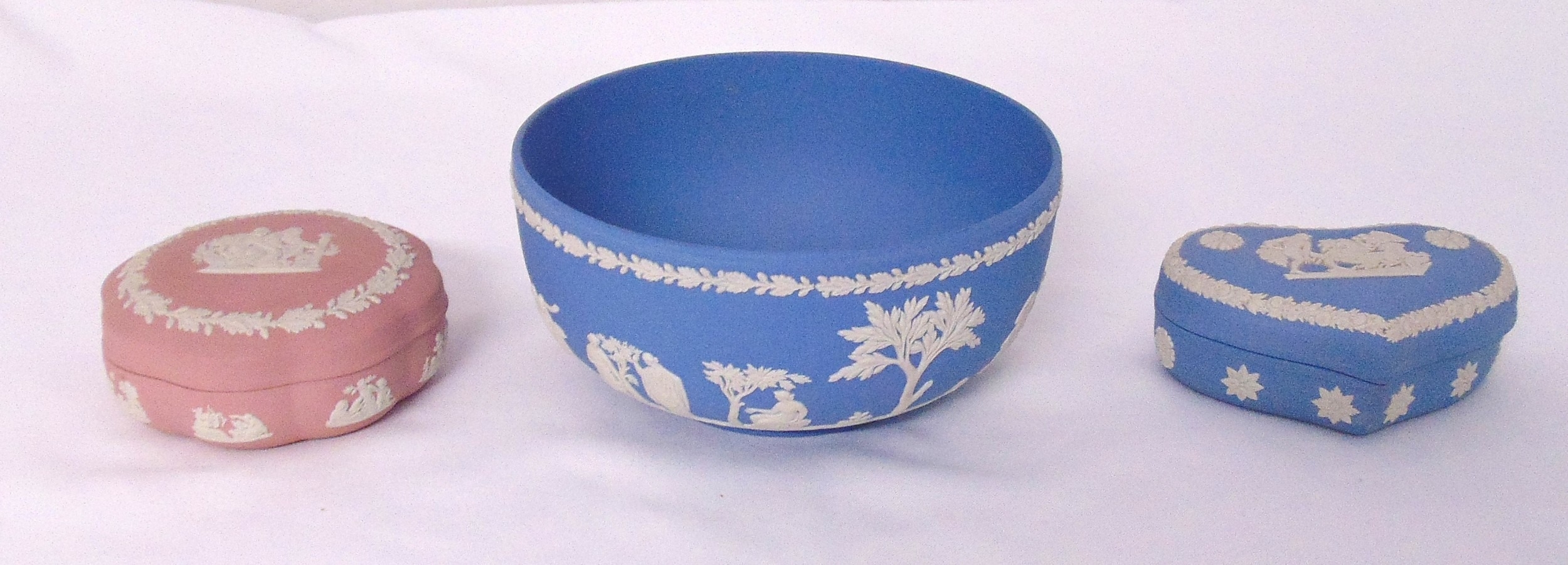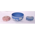 A Wedgwood blue Jasperware fruit bowl and a covered dish and a pink colourway covered dish, tallest 9.5cm (h)
