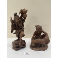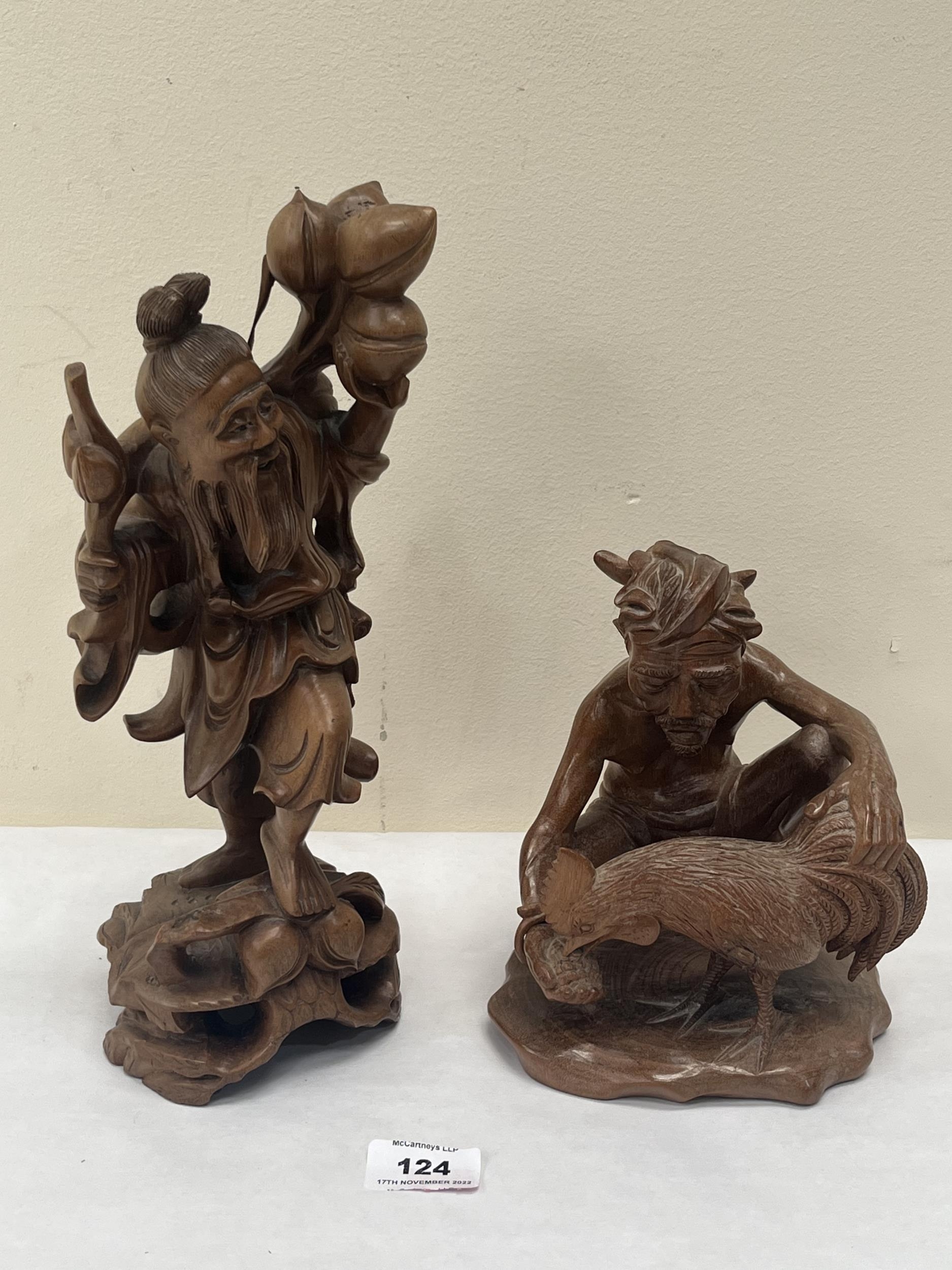 Two oriental carved treen figures, man with cockeral and a sage. The sage 12' high