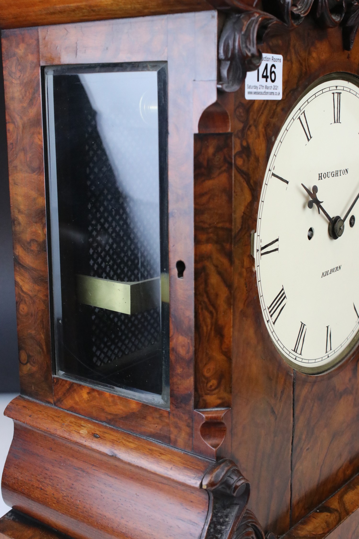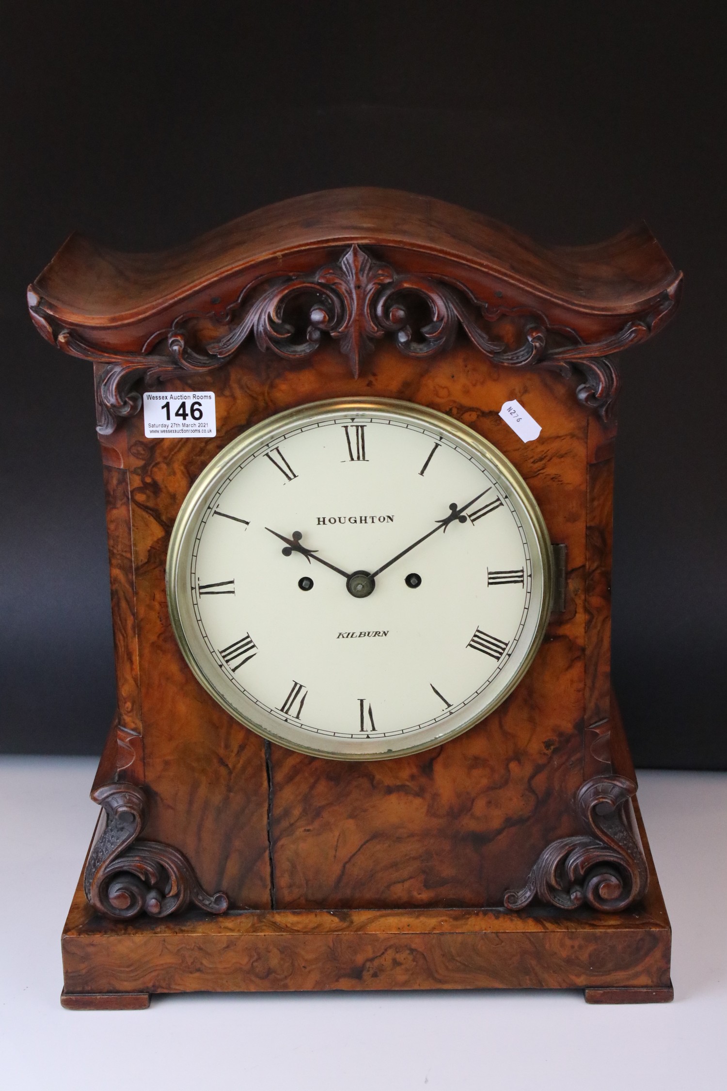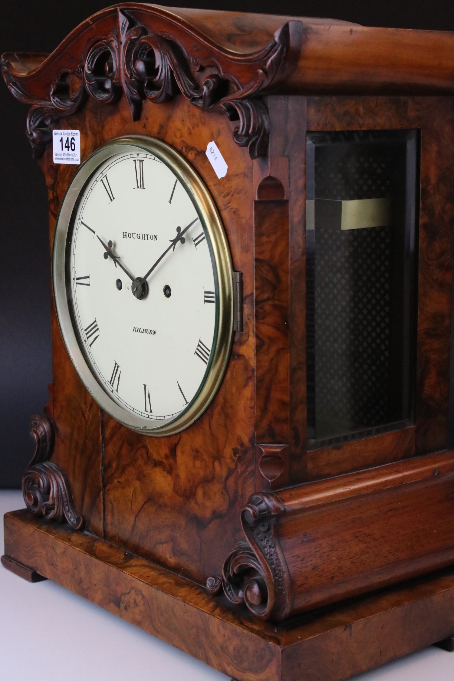 Houghton Of Kilburn 19th century burr walnut cased bracket clock with twin fusee movement with scrolling decoration.