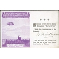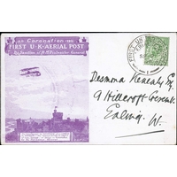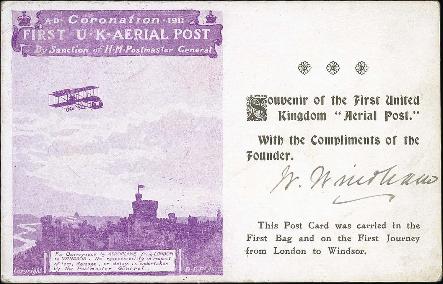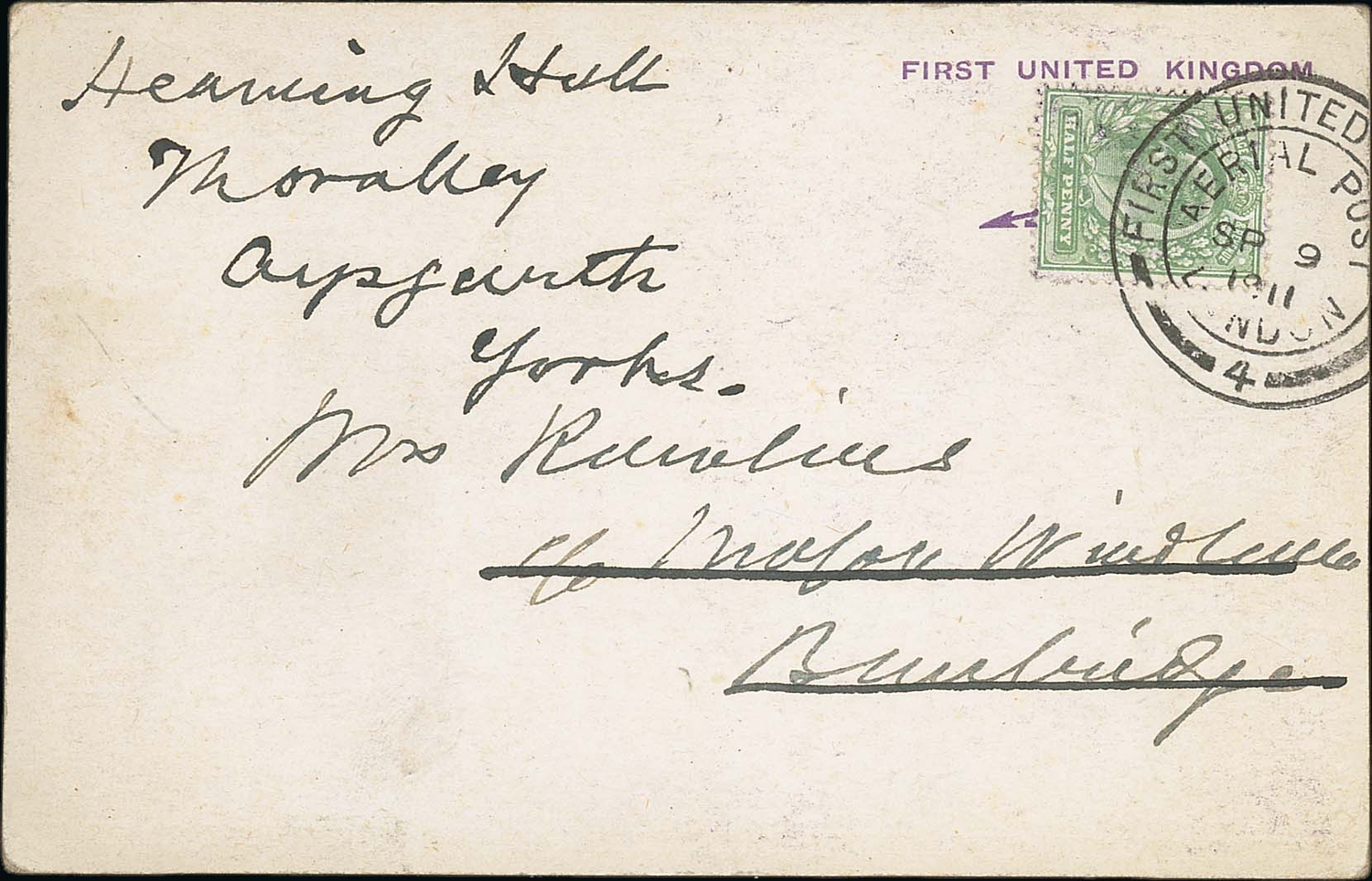 1911 (Sep 9) Violet London to Windsor postcard with the printed text "Souvenir of the First United Kingdom Aerial Post". With the Compliments of the Founder. This Post Card was carried in the First Bag and on the First Journey from London to Windsor", signed by Walter Windham, addressed to "Mrs Rawlins, c/o Major Windham, Bunbridge" and redirected to Heaming Hall at Aysgarth, a KEVII ½d tied by the London Aerial Post c.d.s code "4". A fine example of this very scarce card produced for Walter Windham, sent to his father's address. Photo on Page 10.