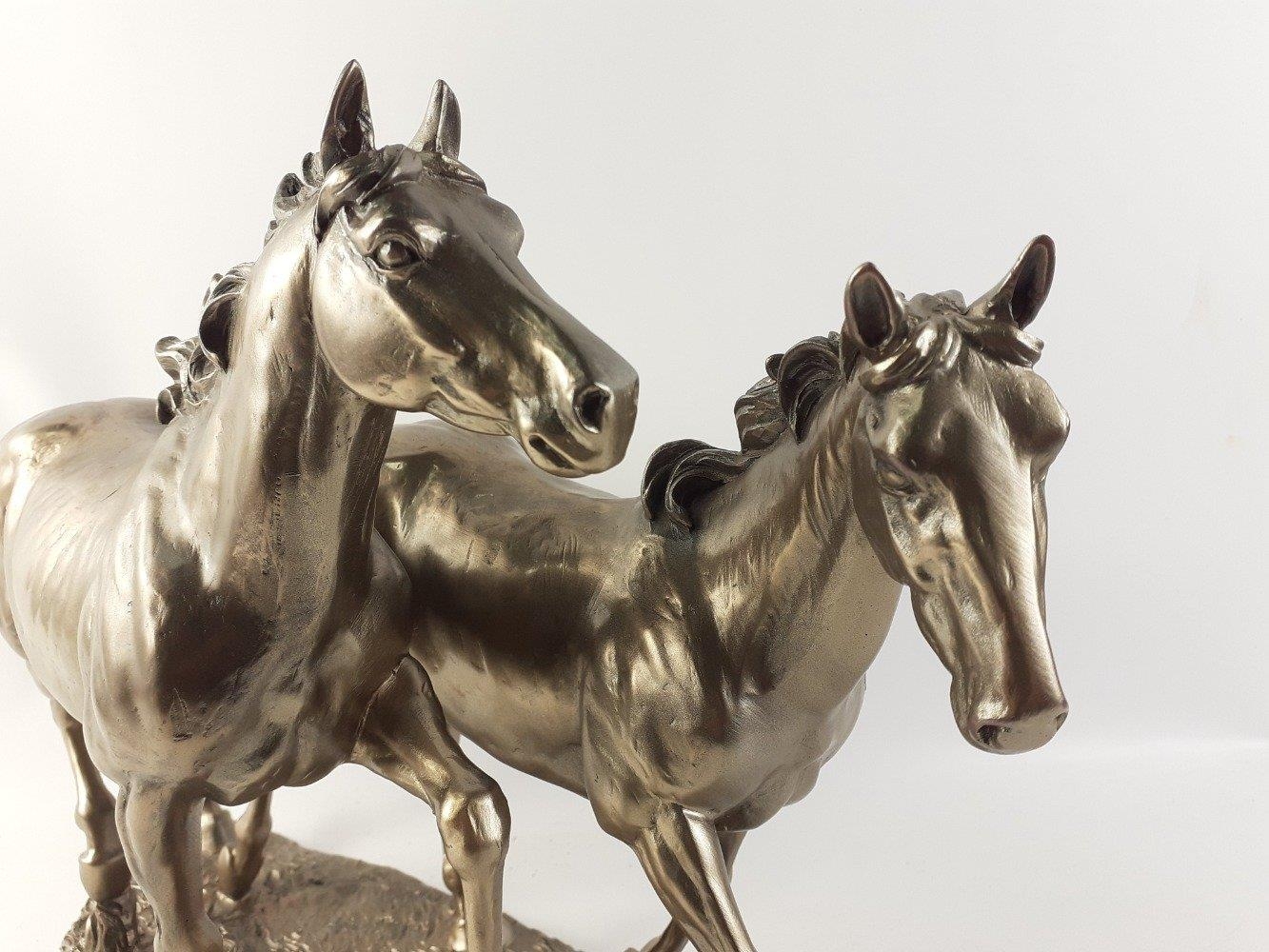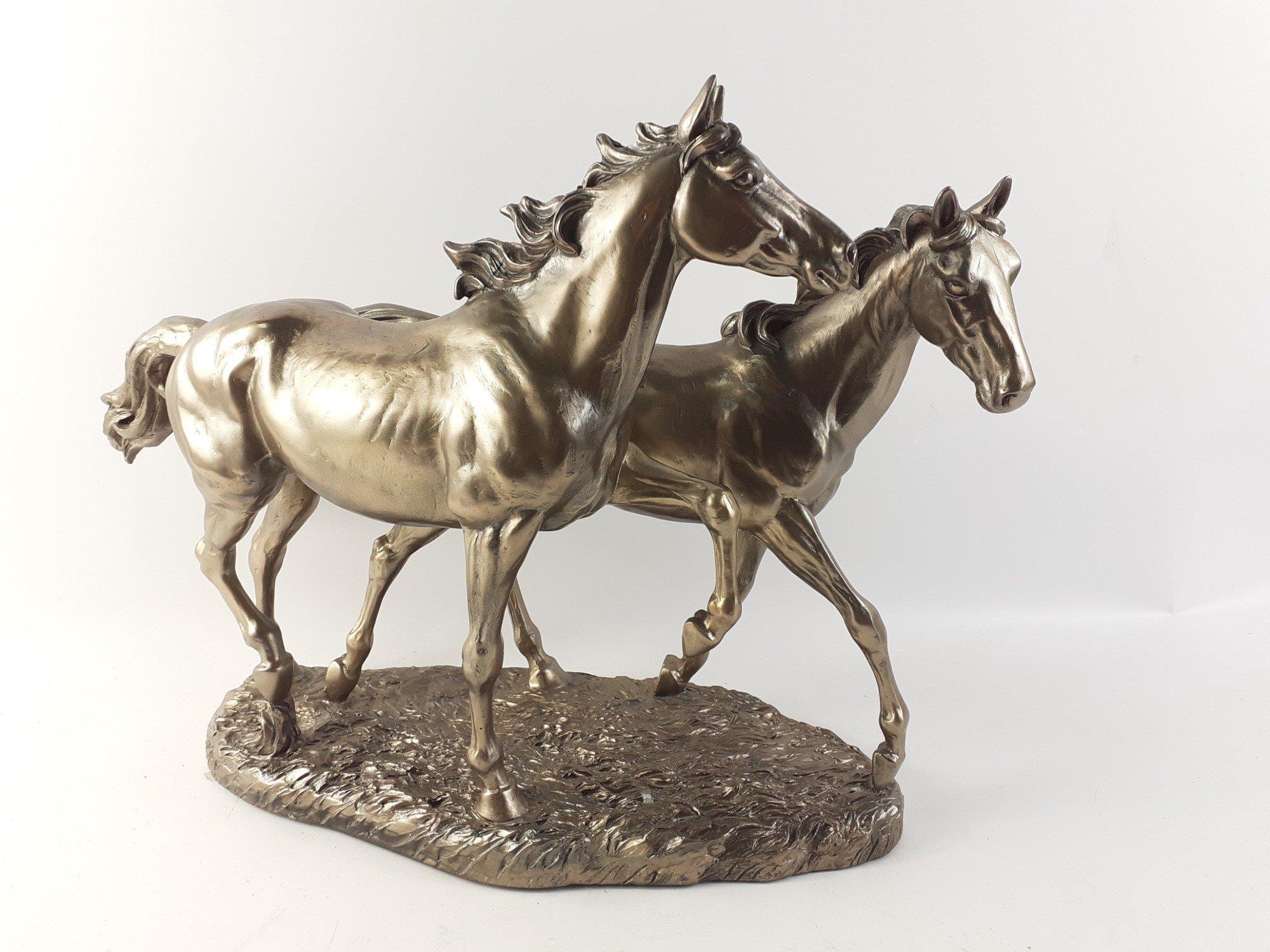 A beautiful and striking large resin horse model showing two gorgeous steeds with flowing manes and tails. Stands 30cm tall approximately and in lovely condition.