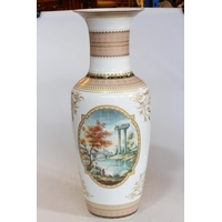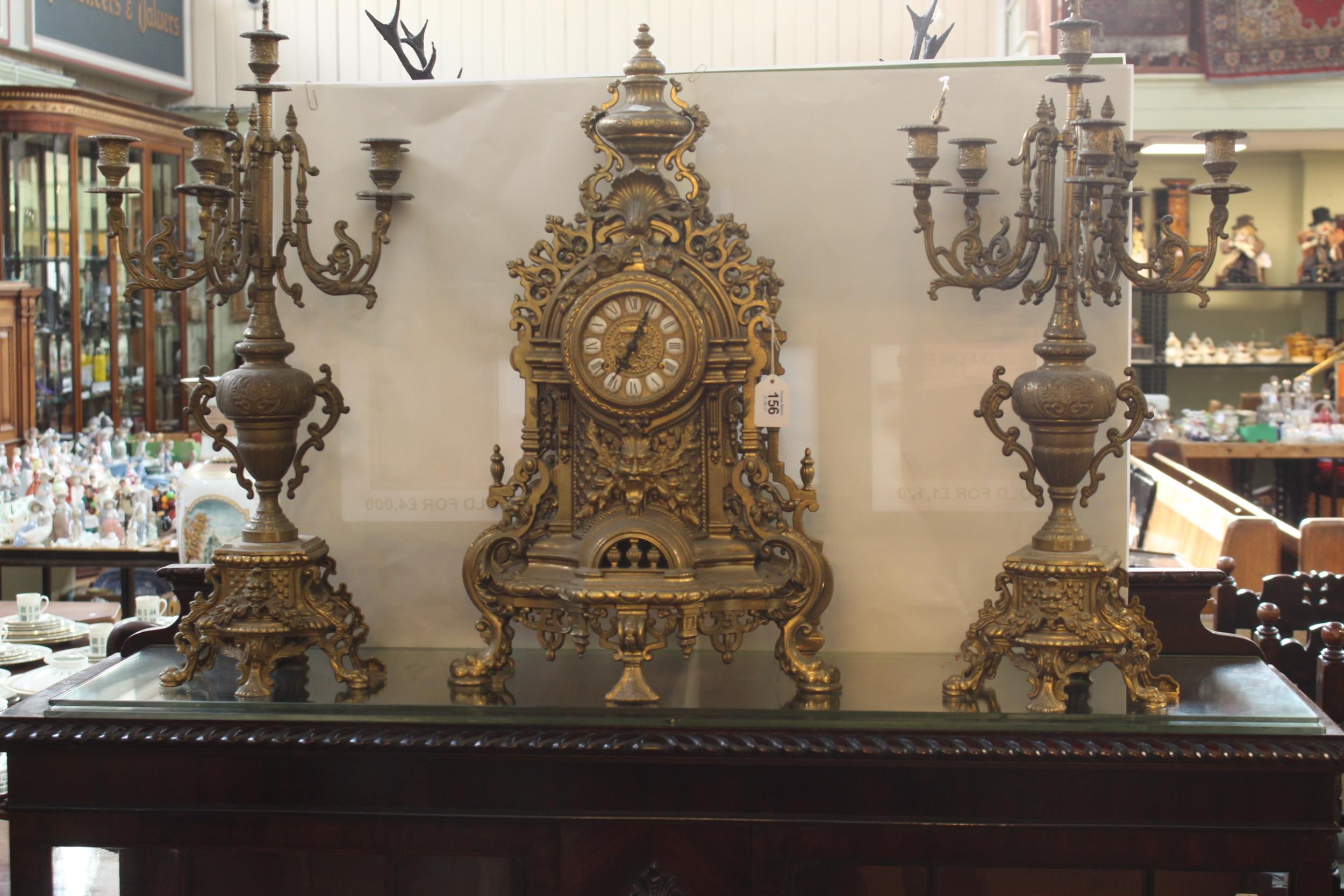 Highly ornate brass clock set, candelabra 67cm high.