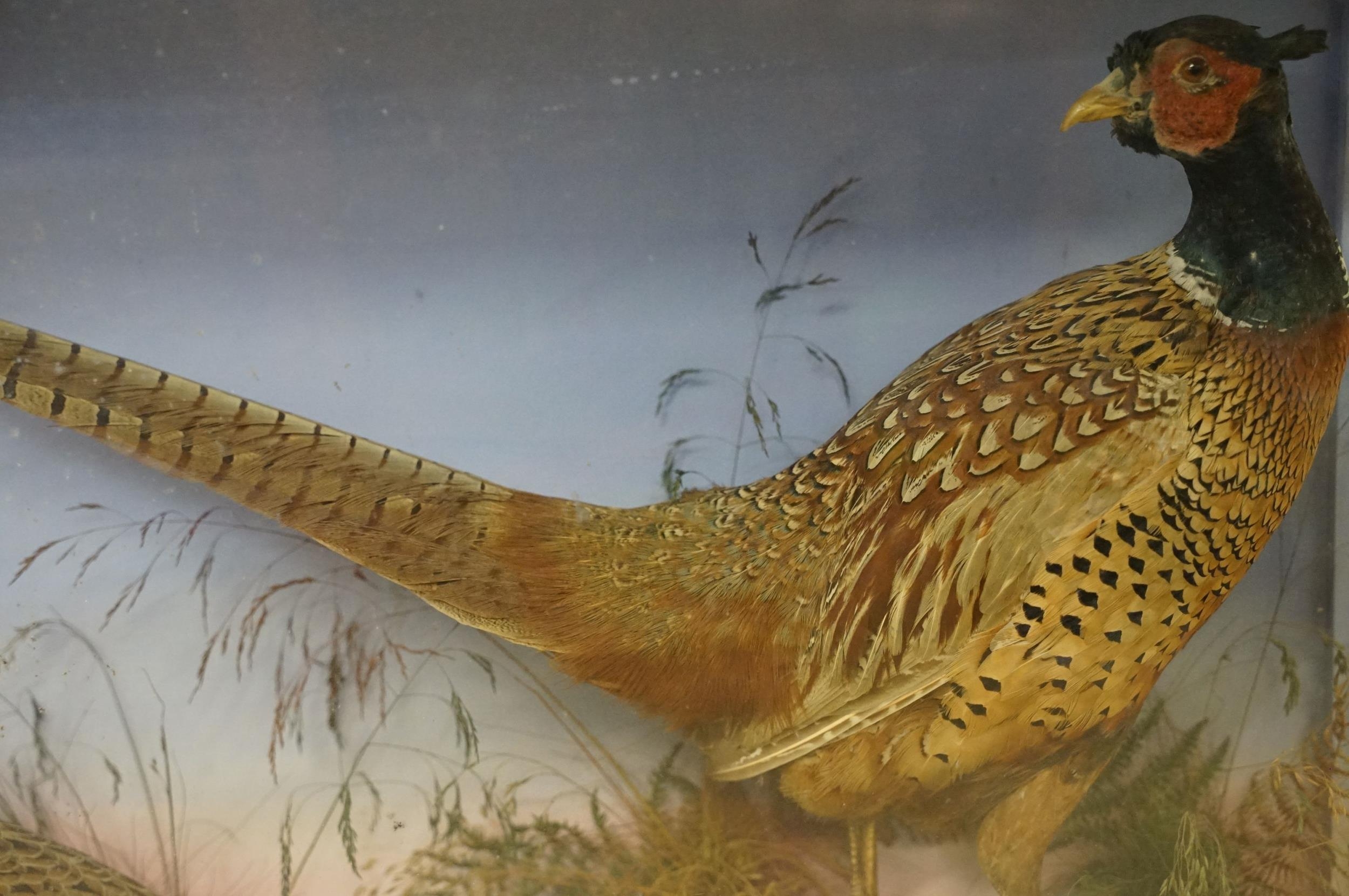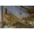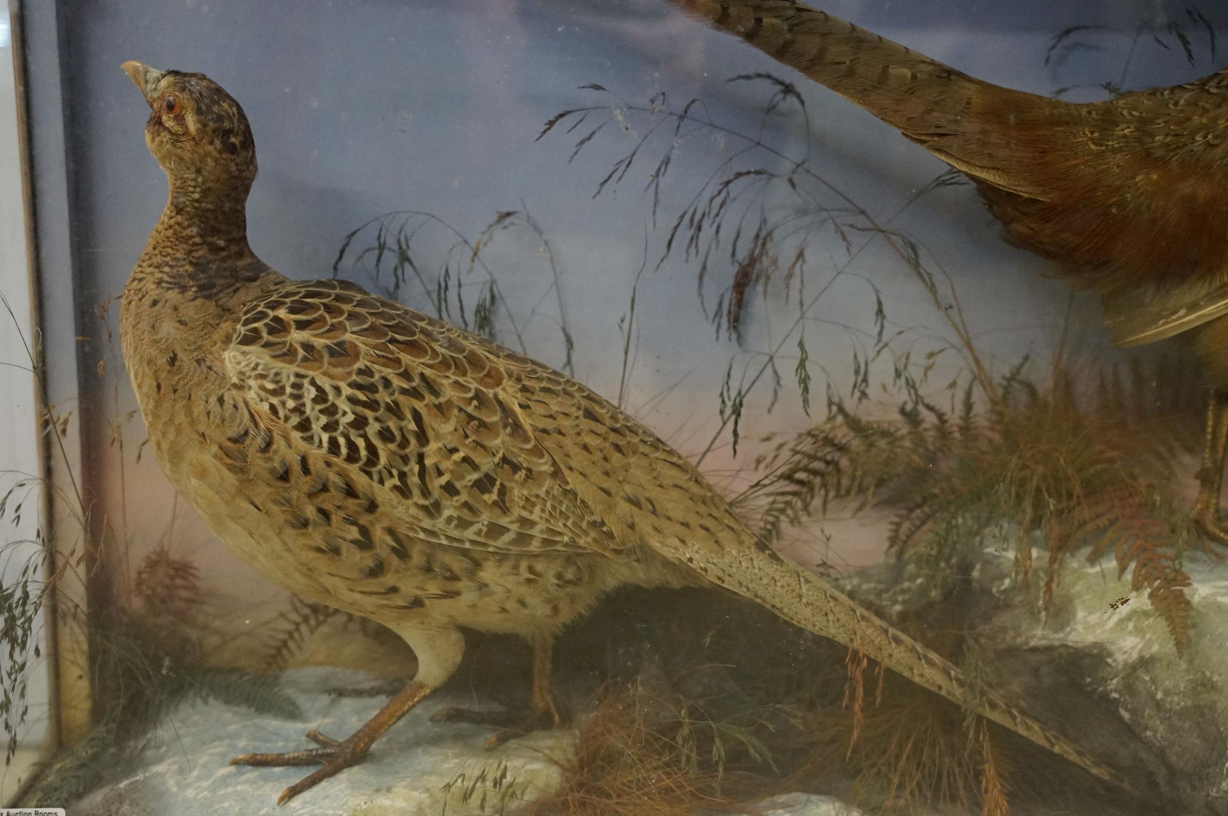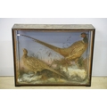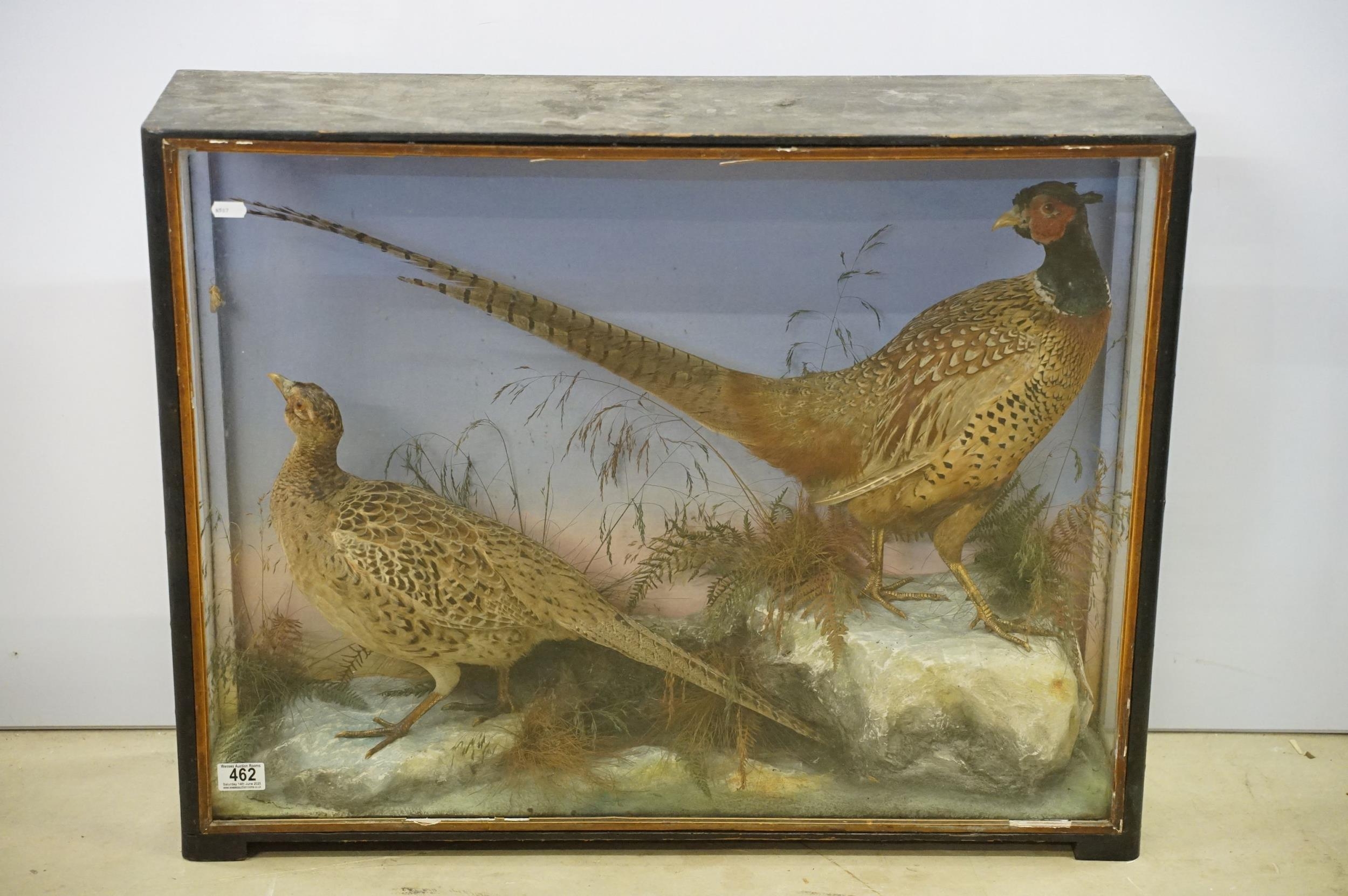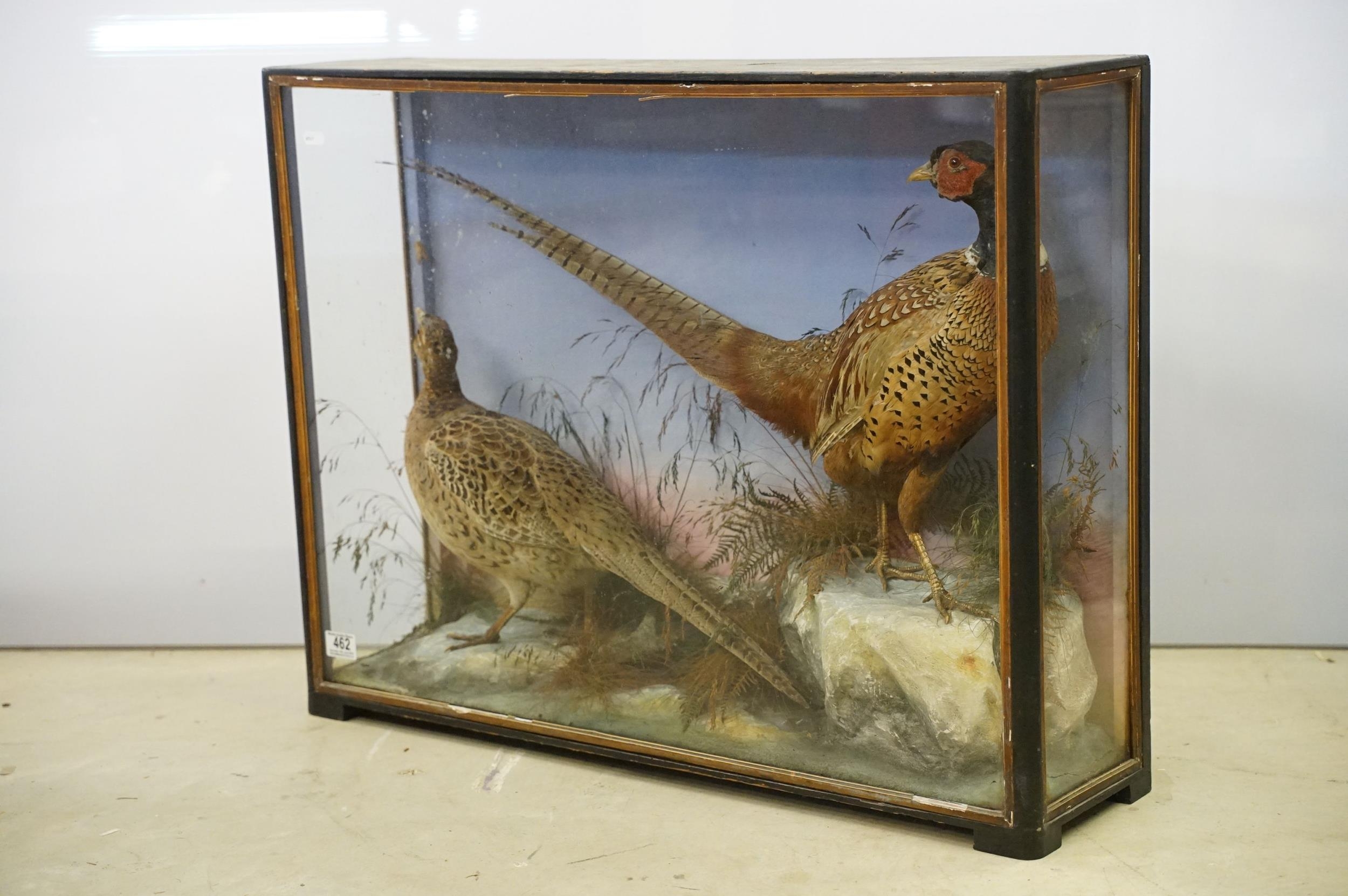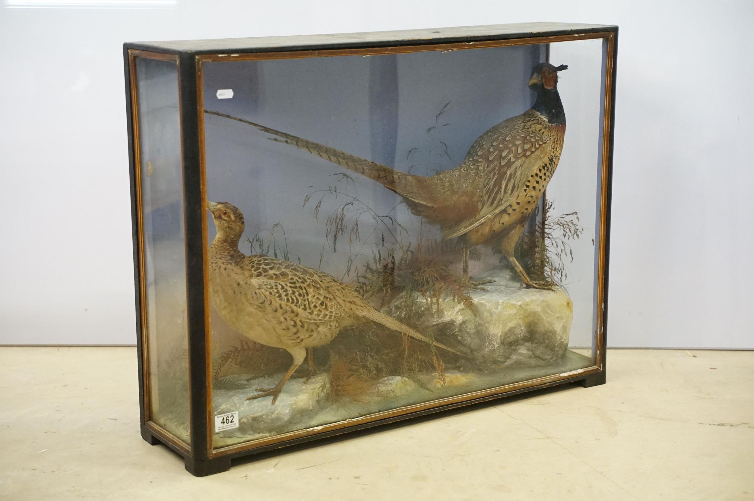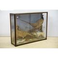Taxidermy - two pheasants within natural landscape mounted on rock contained within large glass display cabinet, 63cm high x 80cm wide x 20cm deep