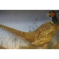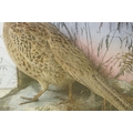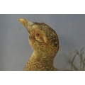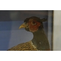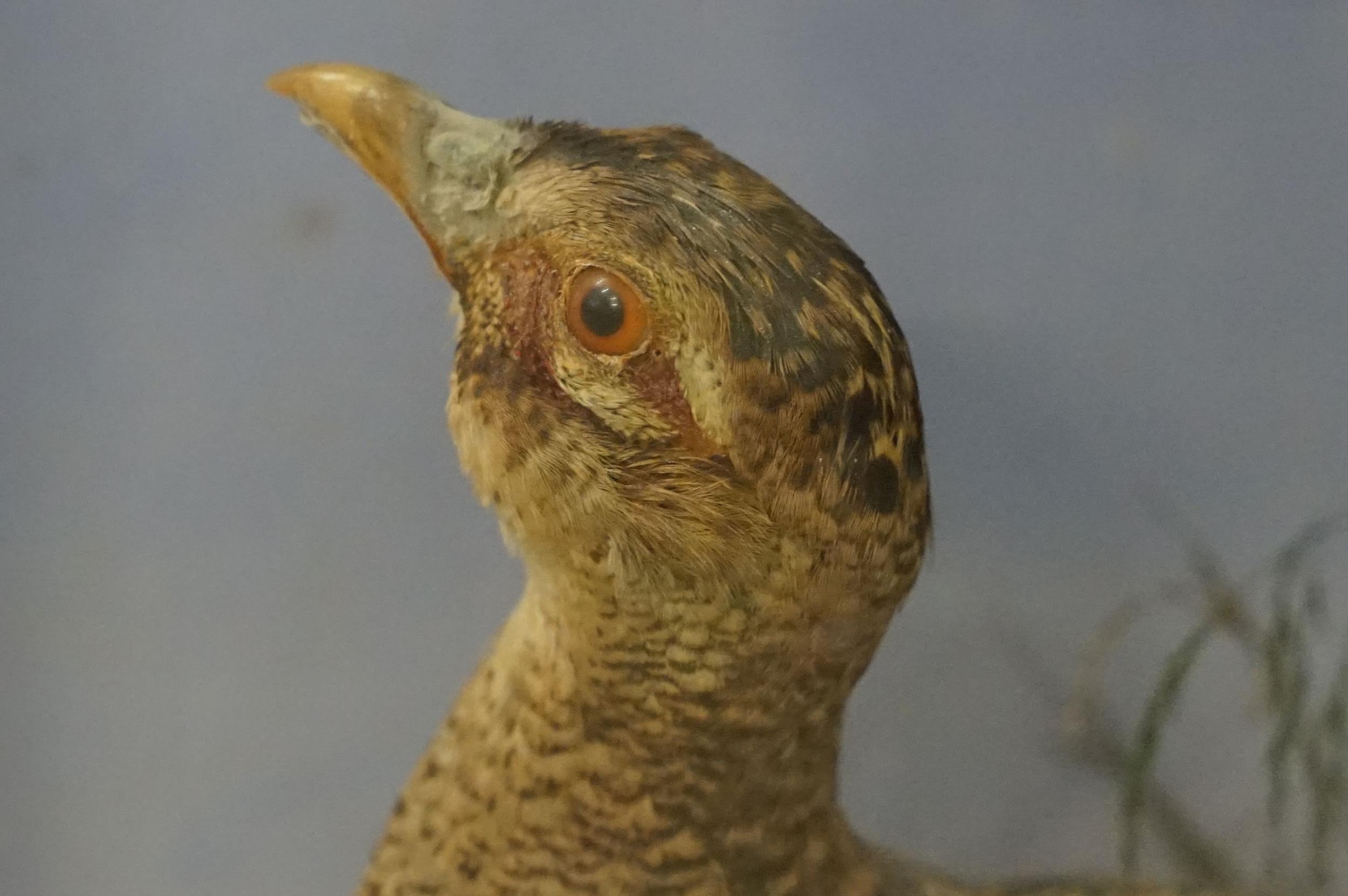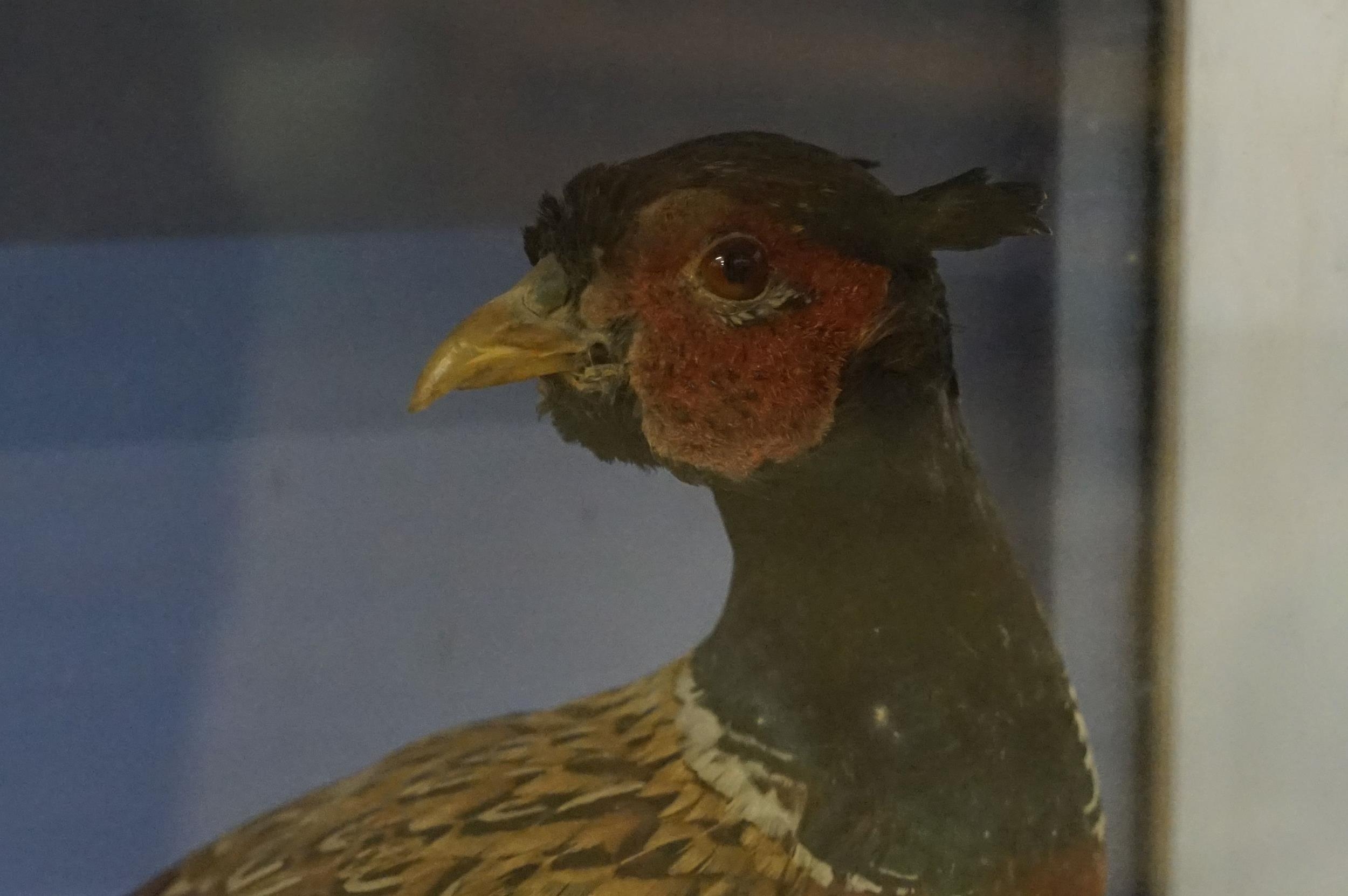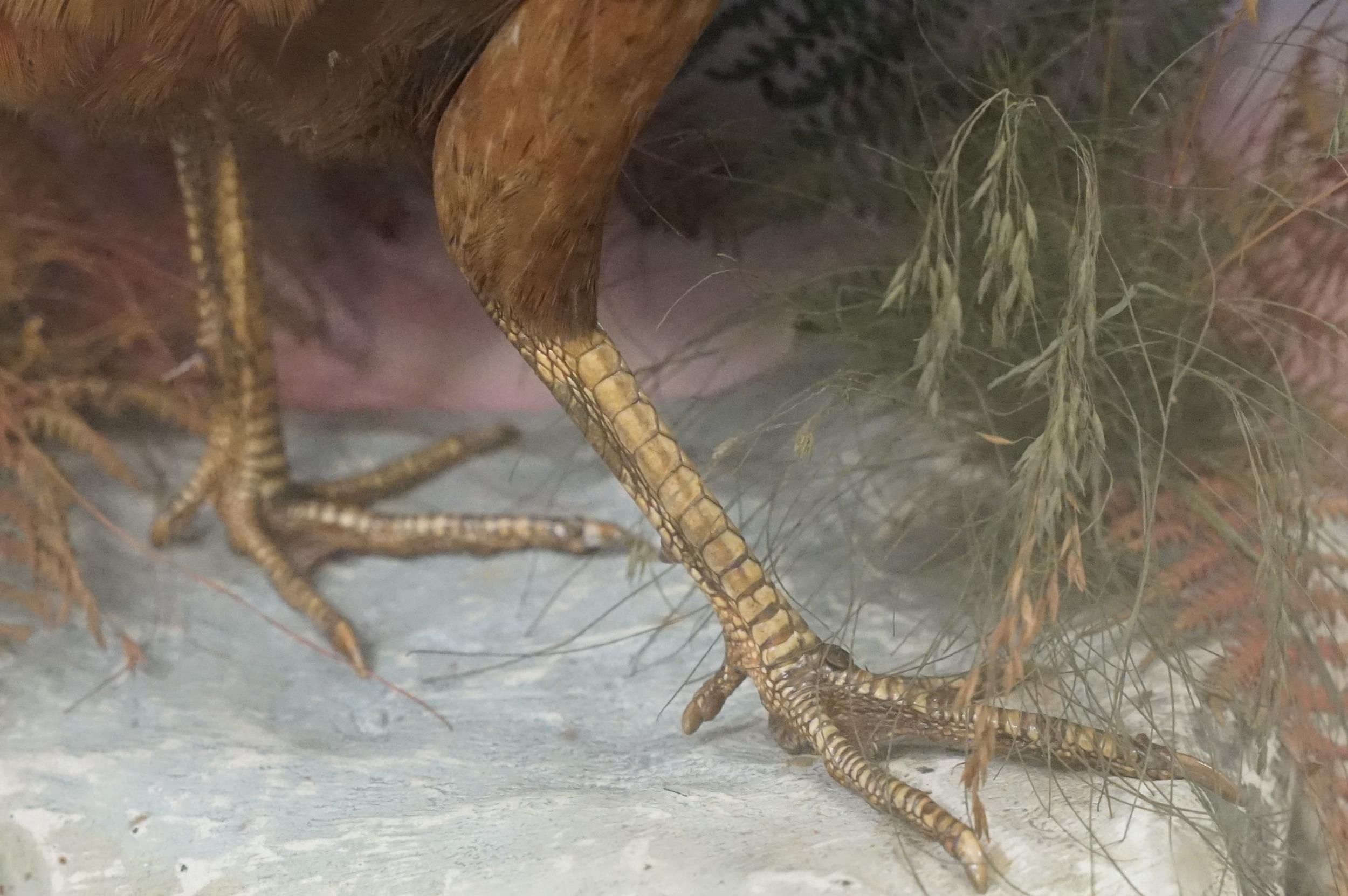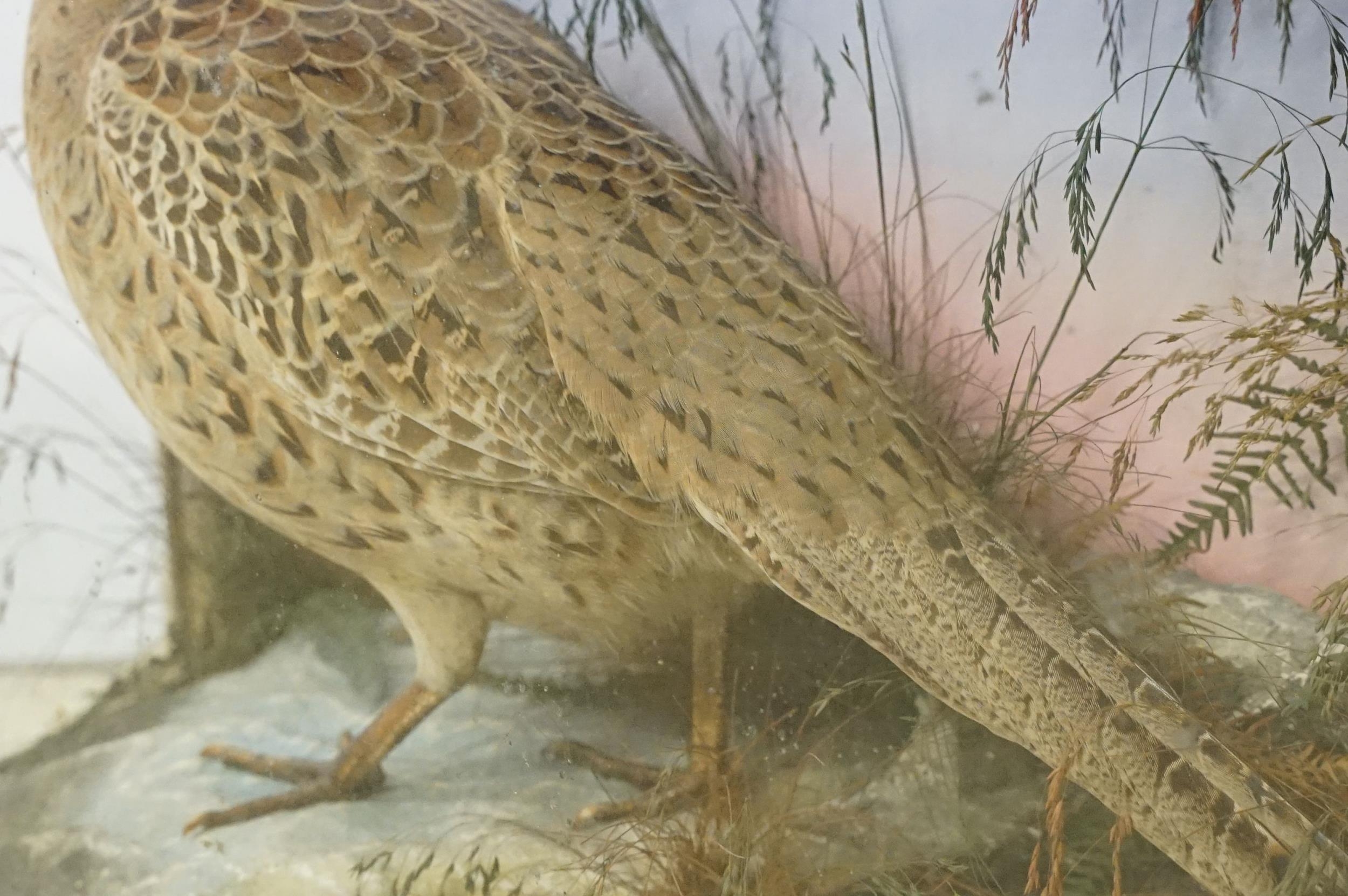 Taxidermy - two pheasants within natural landscape mounted on rock contained within large glass display cabinet, 63cm high x 80cm wide x 20cm deep