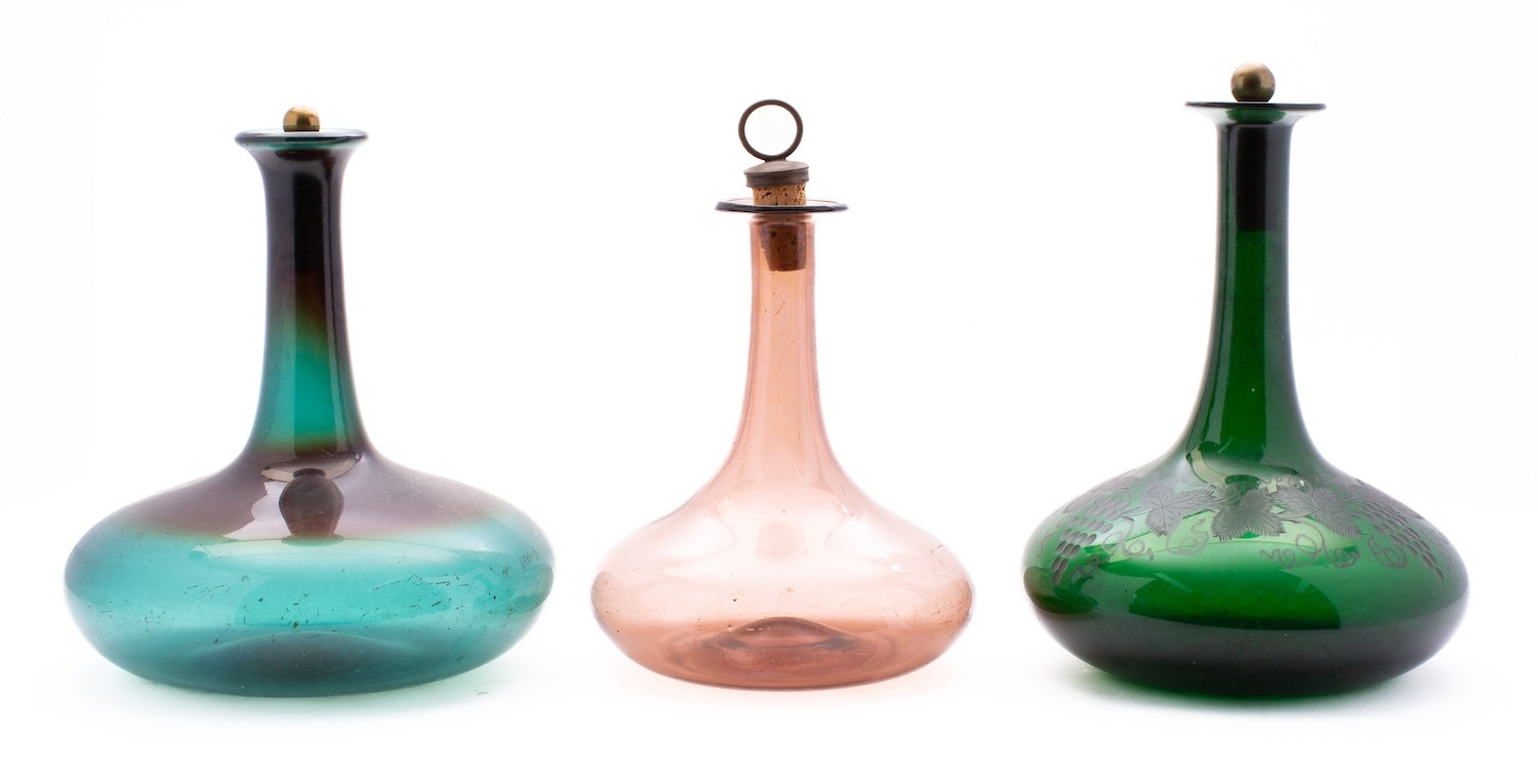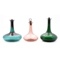 A group of three 19th century green and pale amethyst glass Mell decanters one engraved with vines, with brass mounted stoppers, 21-23cm [3].