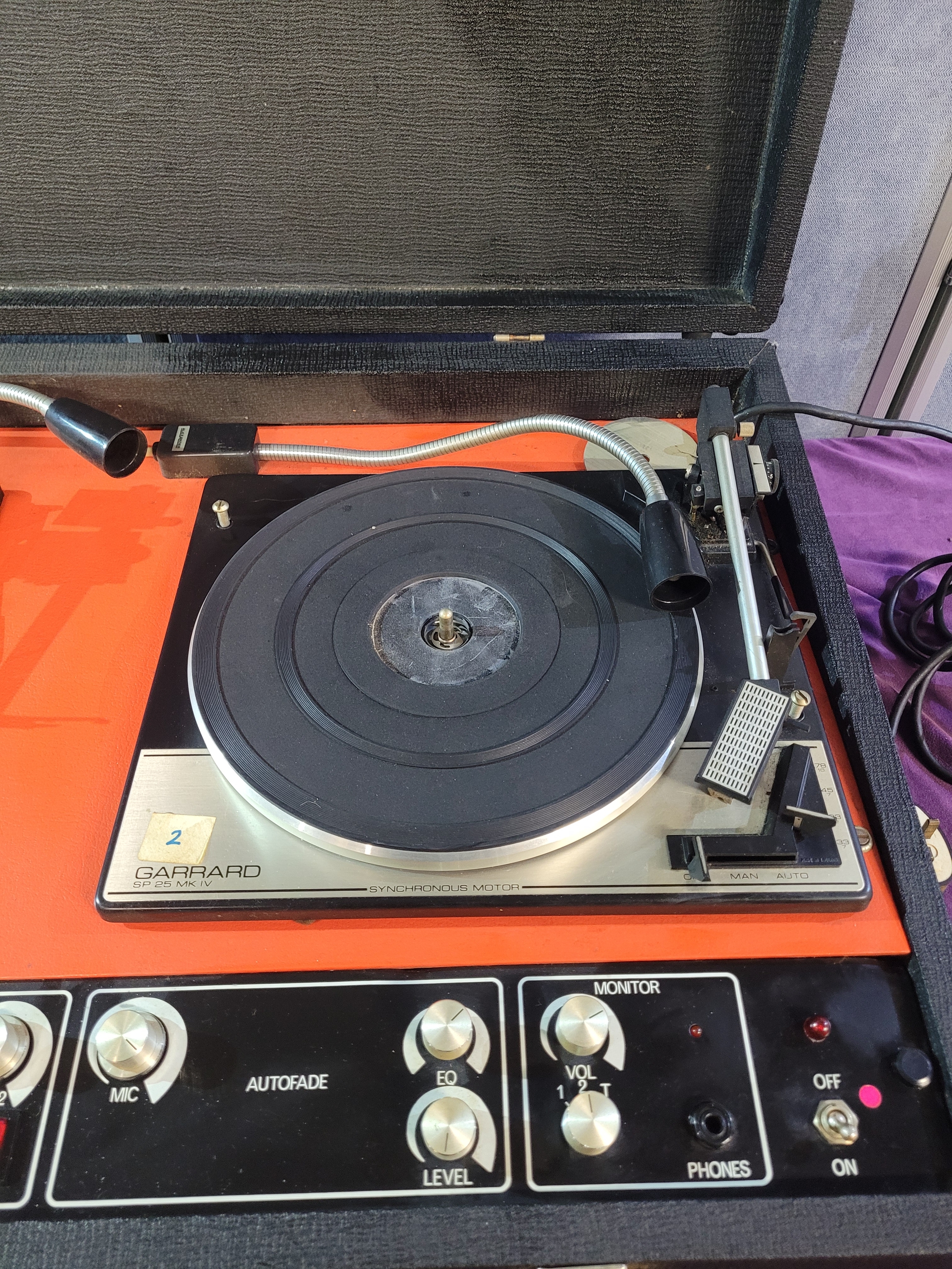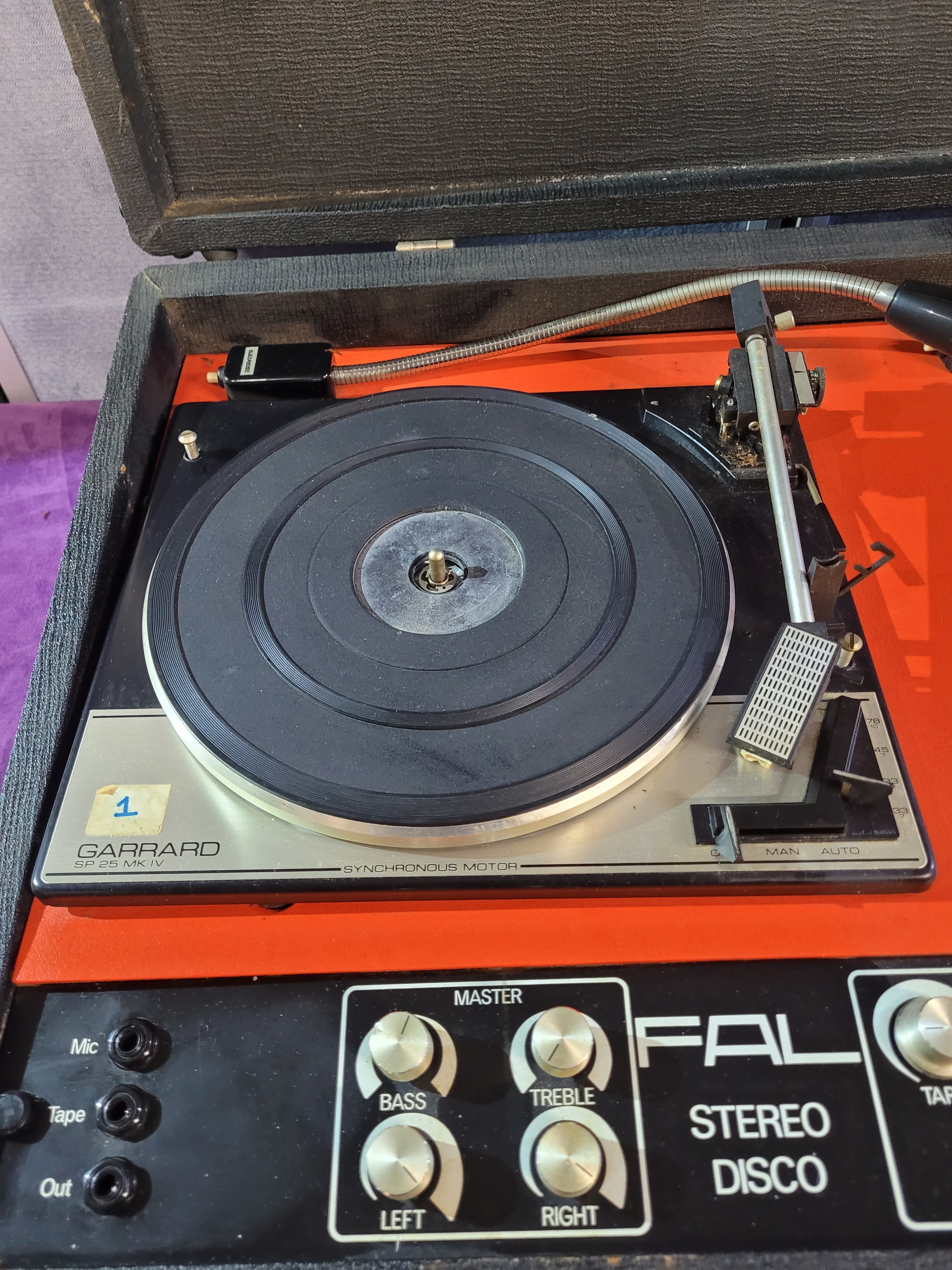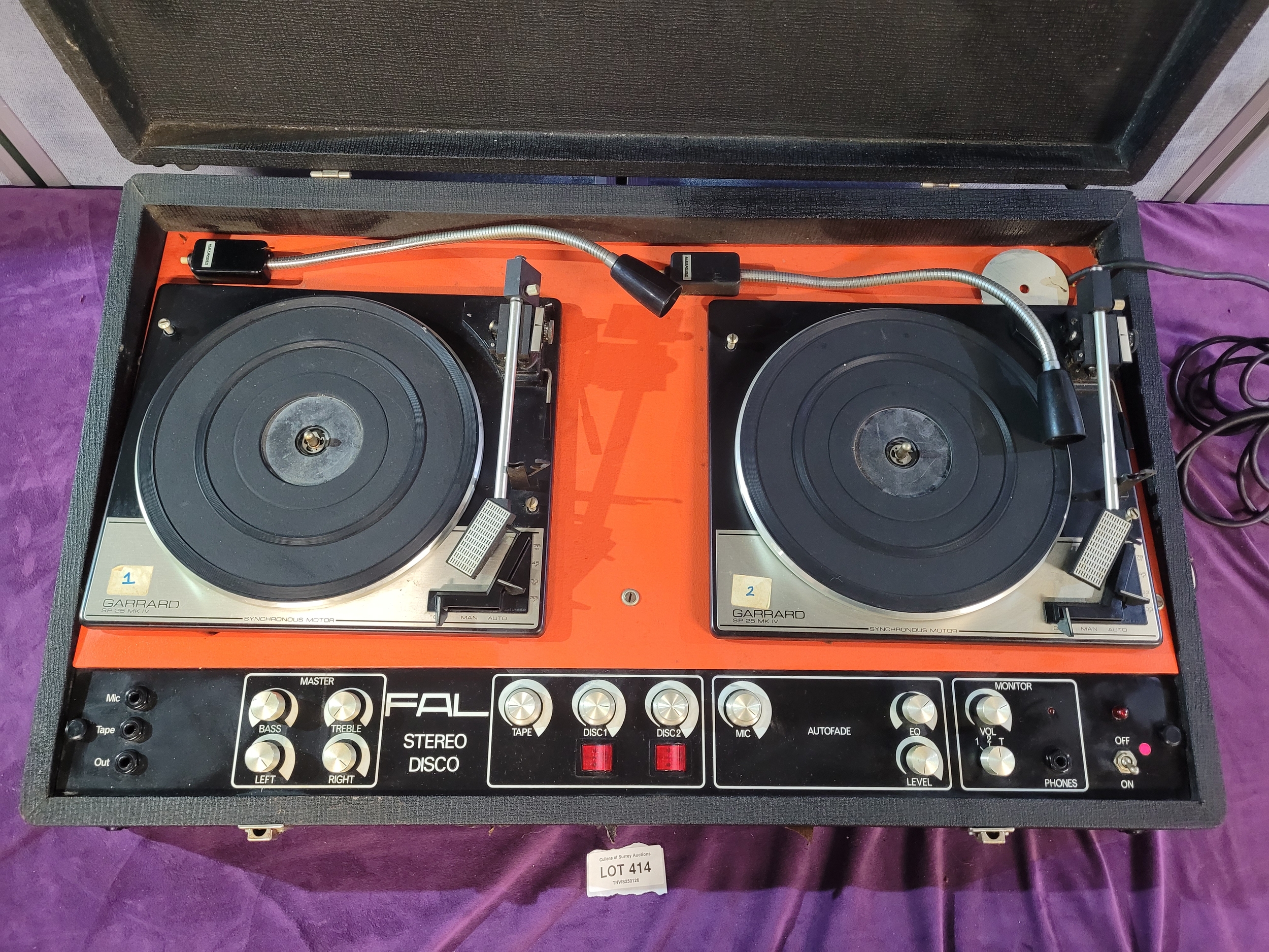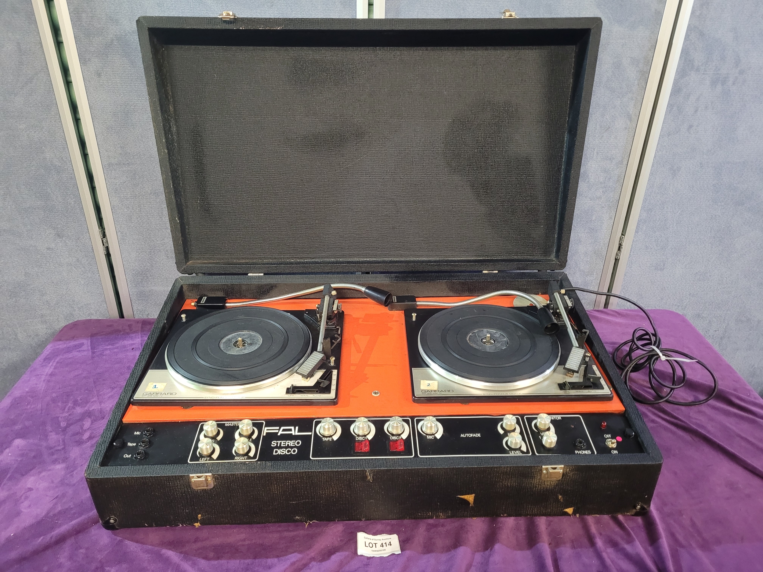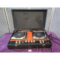 Vintage FAL Stereo Disco portable DJ unit featuring twin Garrard turntables housed in a suitcase-style case