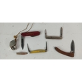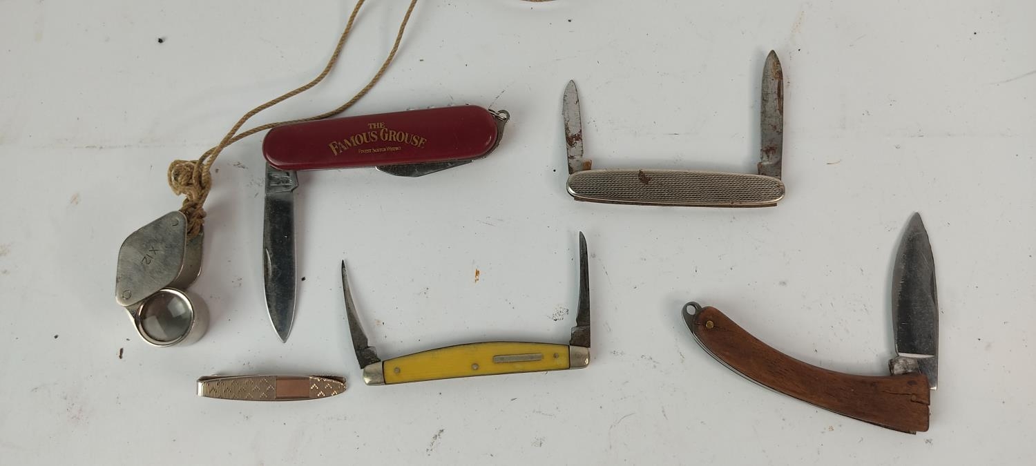A jewellers magnifying eye piece X12, four penknives and a tiepin.