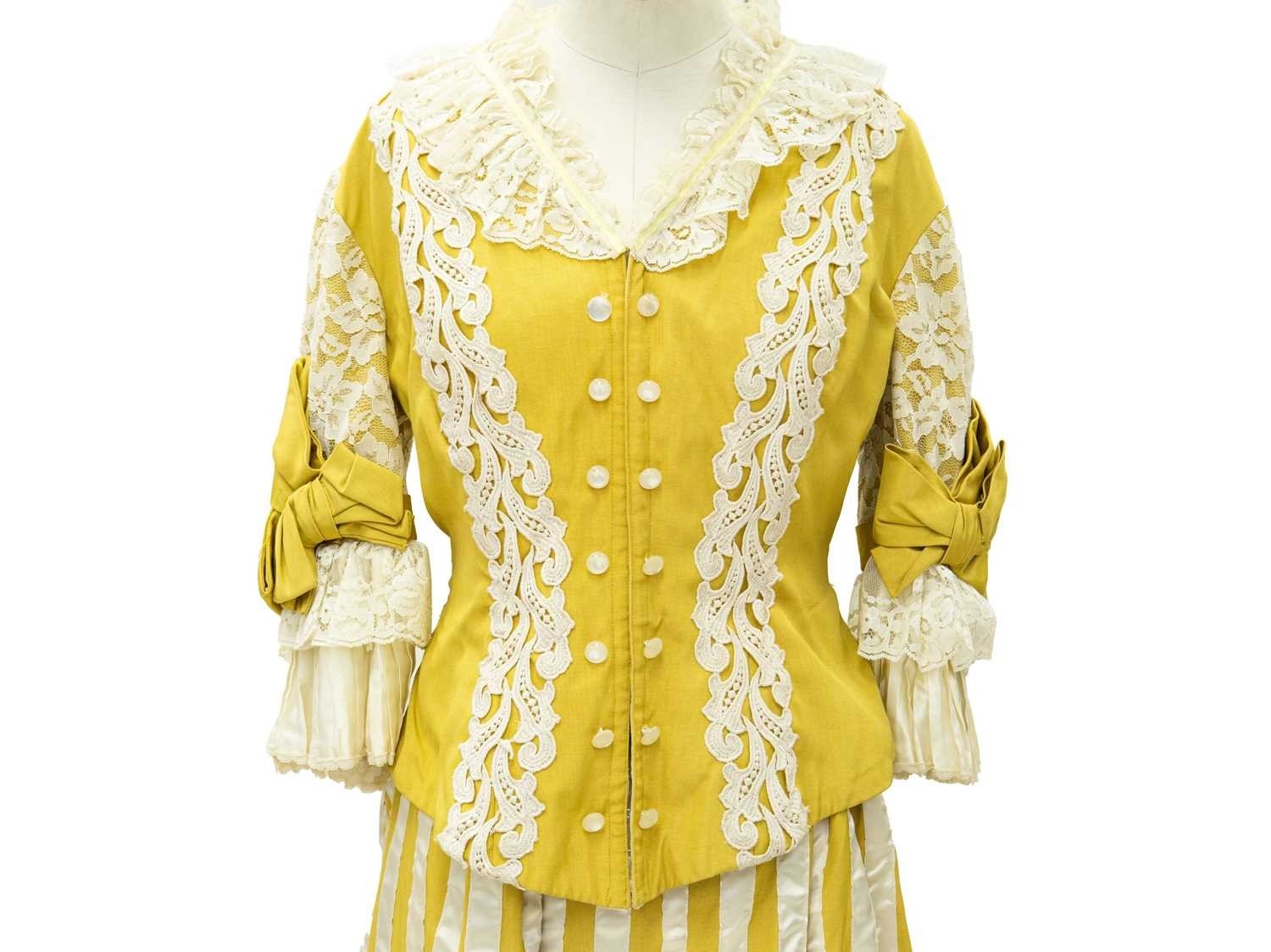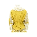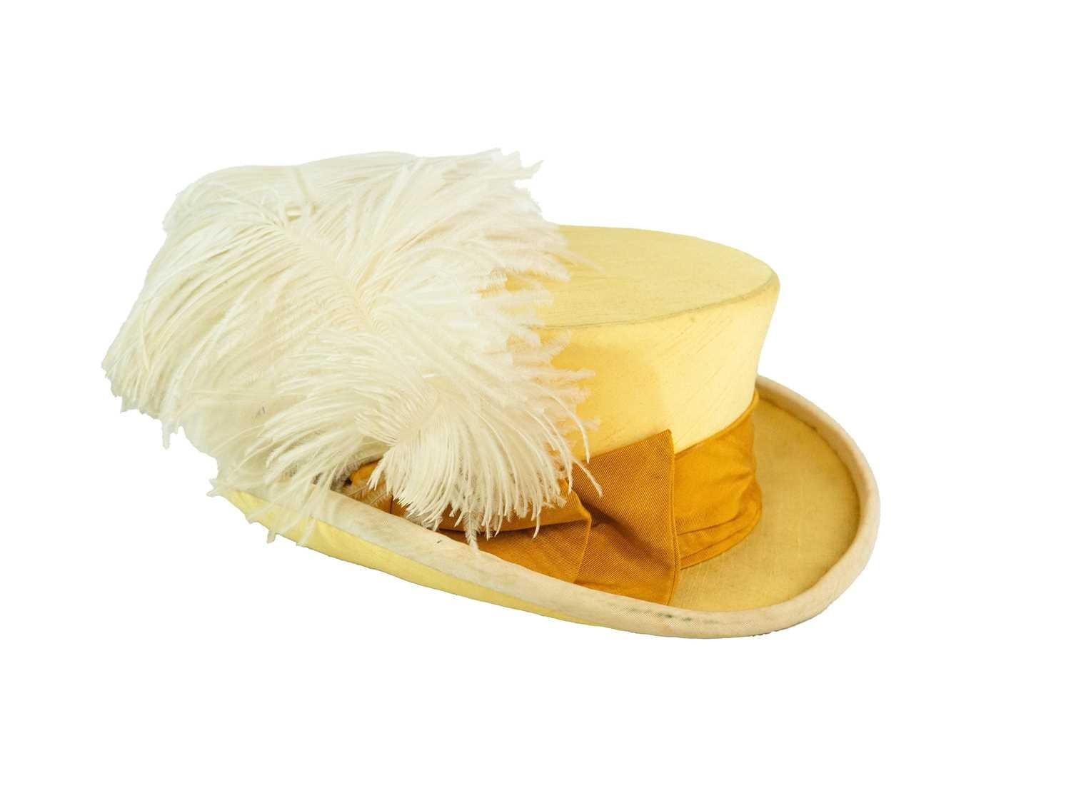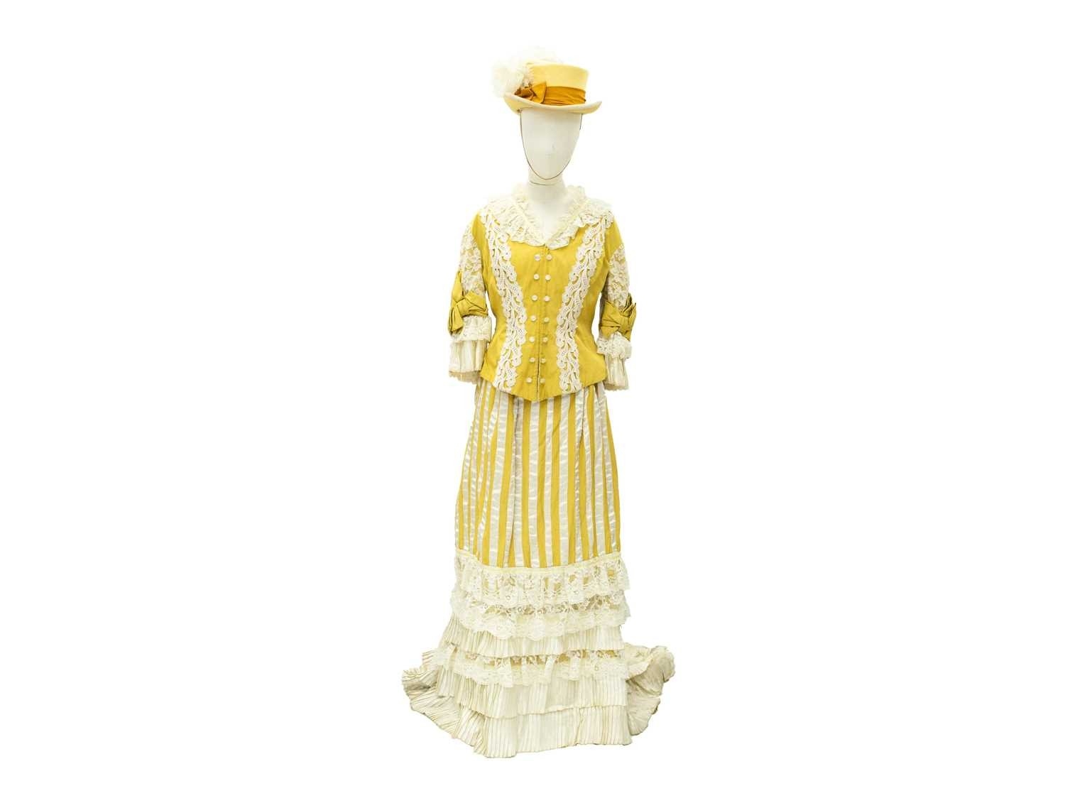 A yellow costume in the Edwardian style. Handwritten name inside the waist, possibly used in a play, tiered yellow and lace skirt, with matching fitted jacket with pearlescent buttons and top hat with ostrich feather decoration (3).
