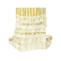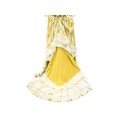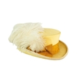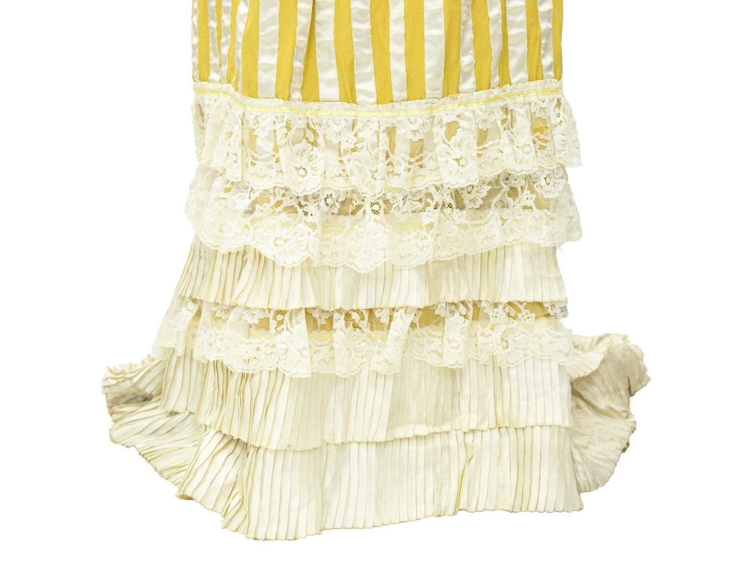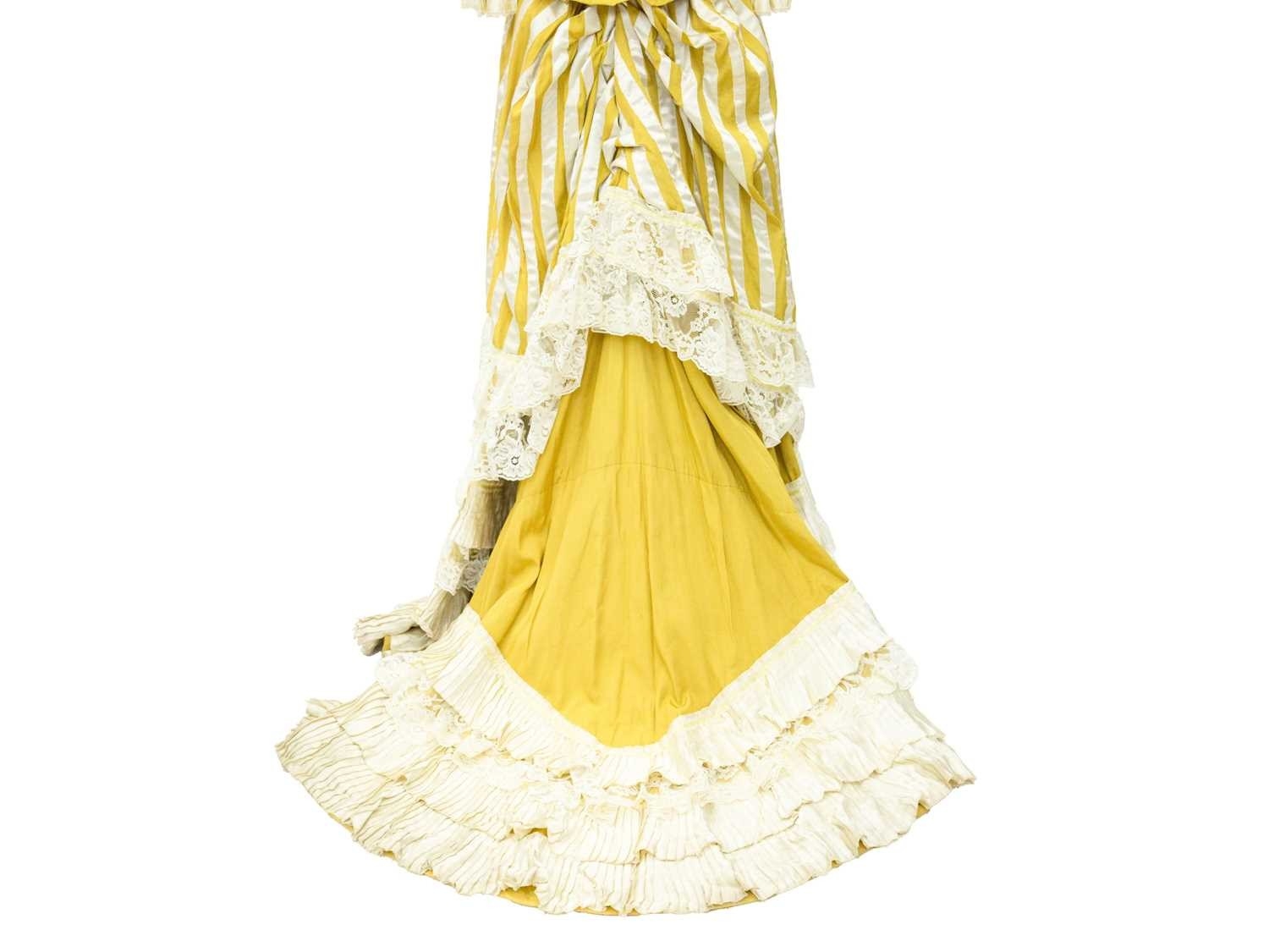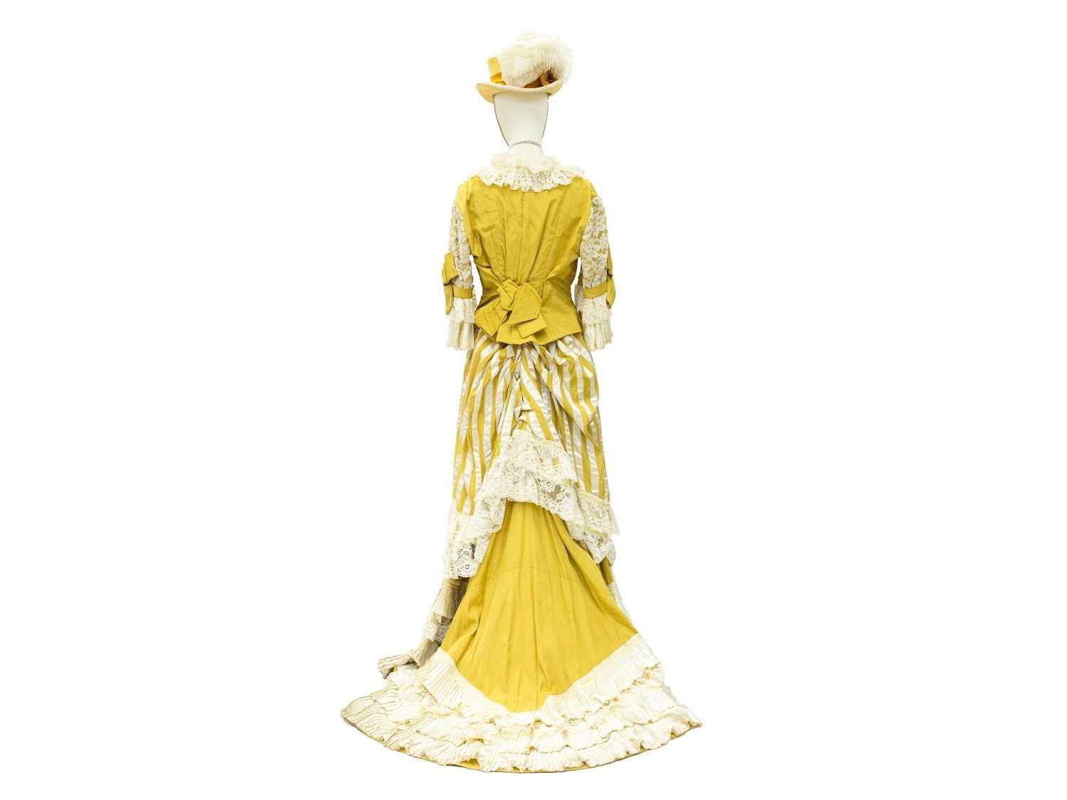 A yellow costume in the Edwardian style. Handwritten name inside the waist, possibly used in a play, tiered yellow and lace skirt, with matching fitted jacket with pearlescent buttons and top hat with ostrich feather decoration (3).