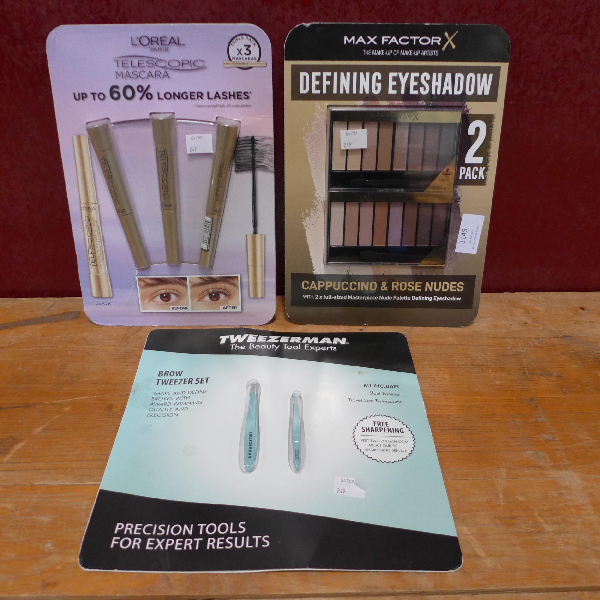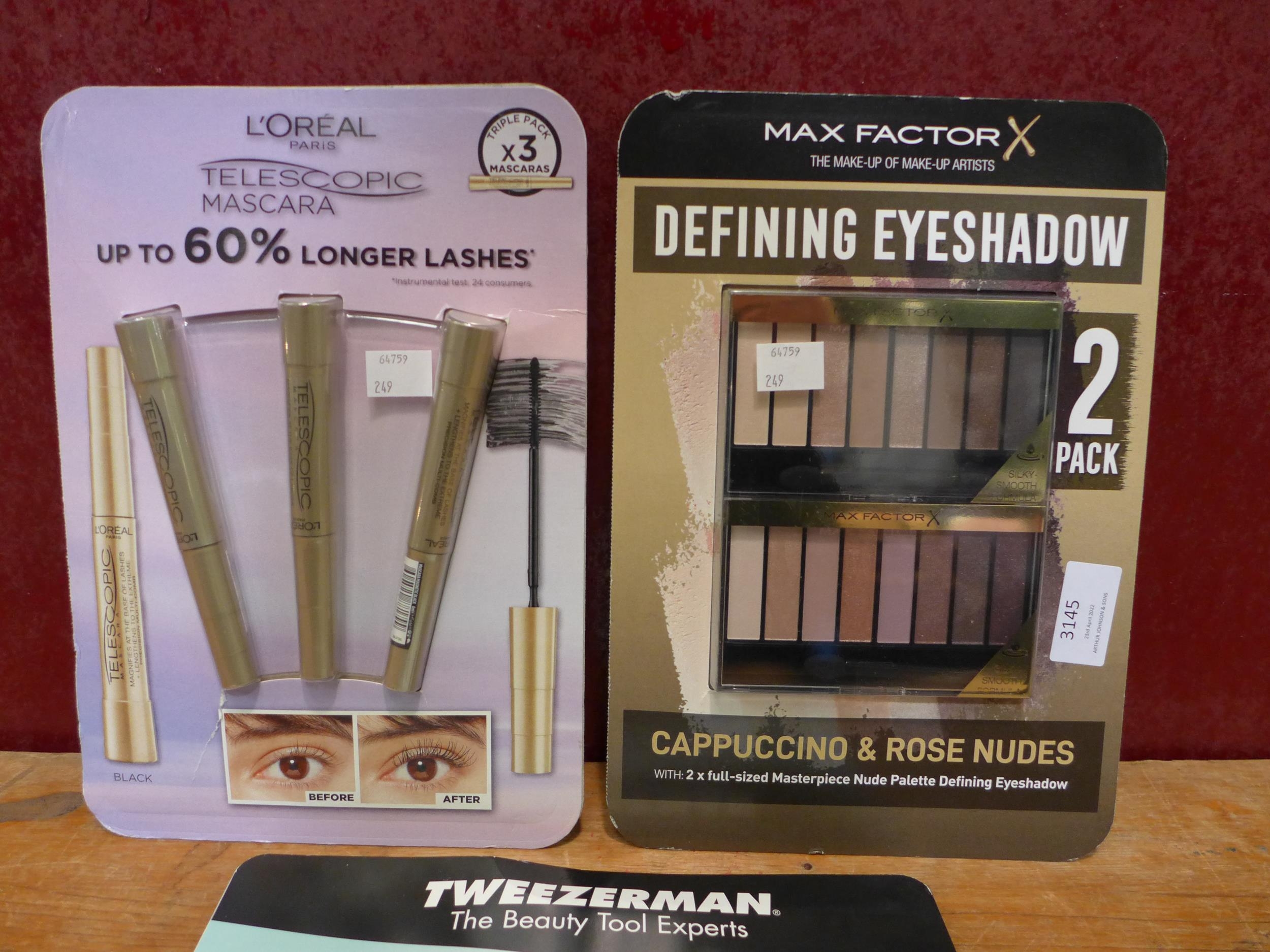 Max Factor Eyeshadow, L'Oreal Mascara 3Pk Telescopic and Tweezerman Brow Tweezer Set (249-443,447,451) * This lot is subject to vat
