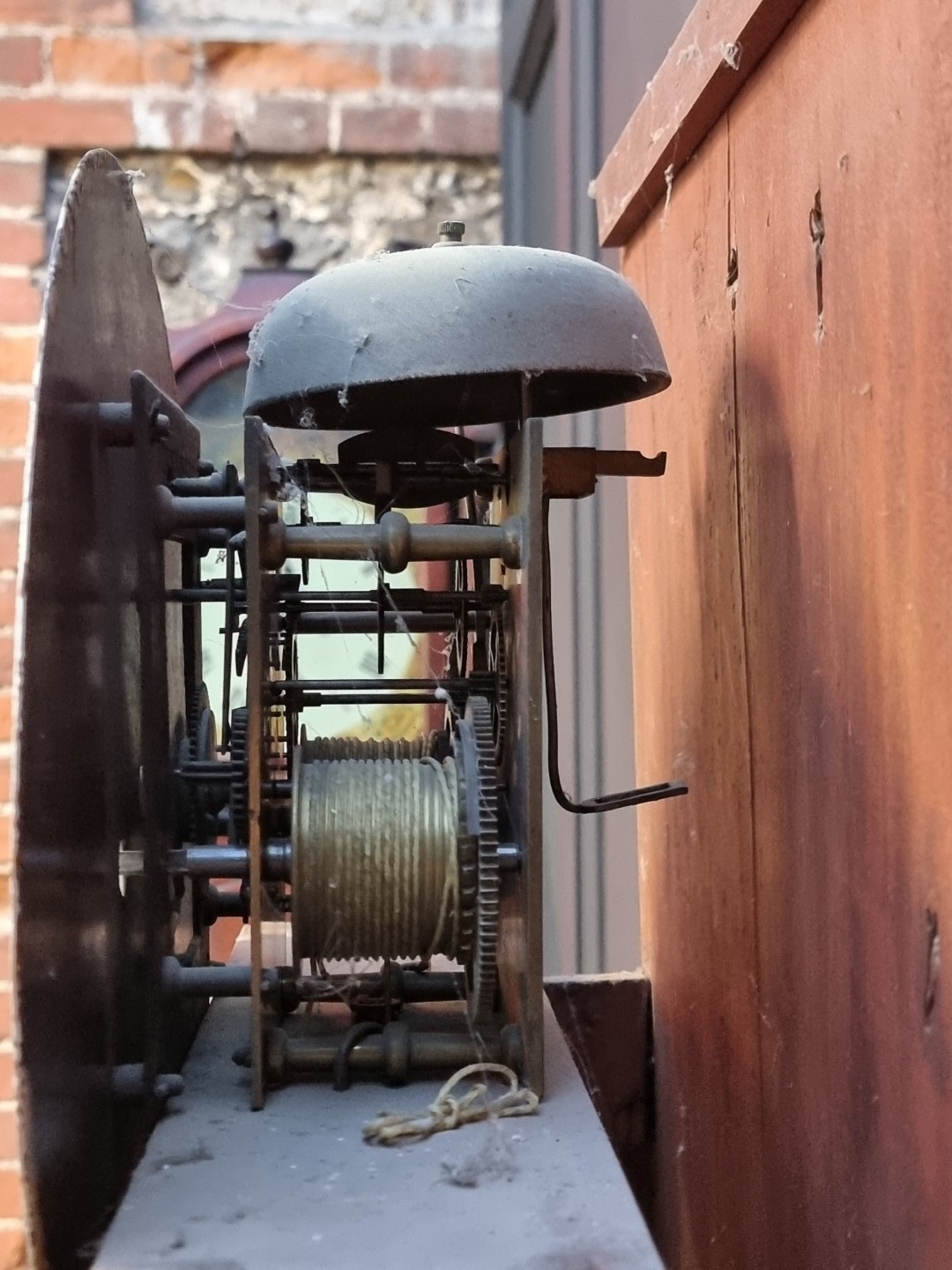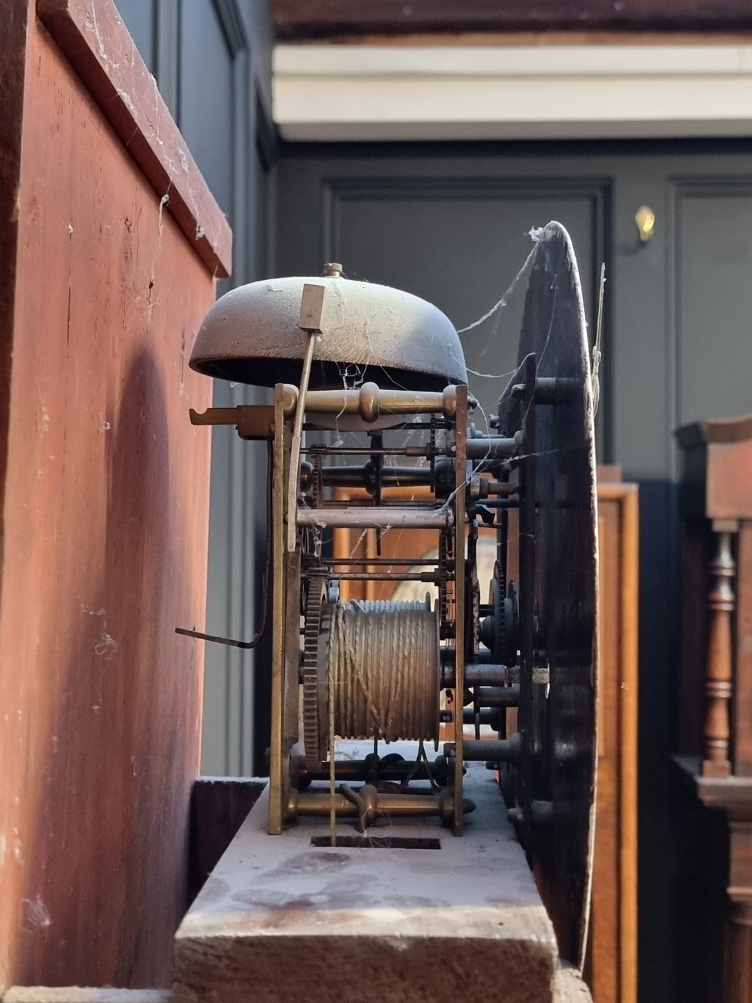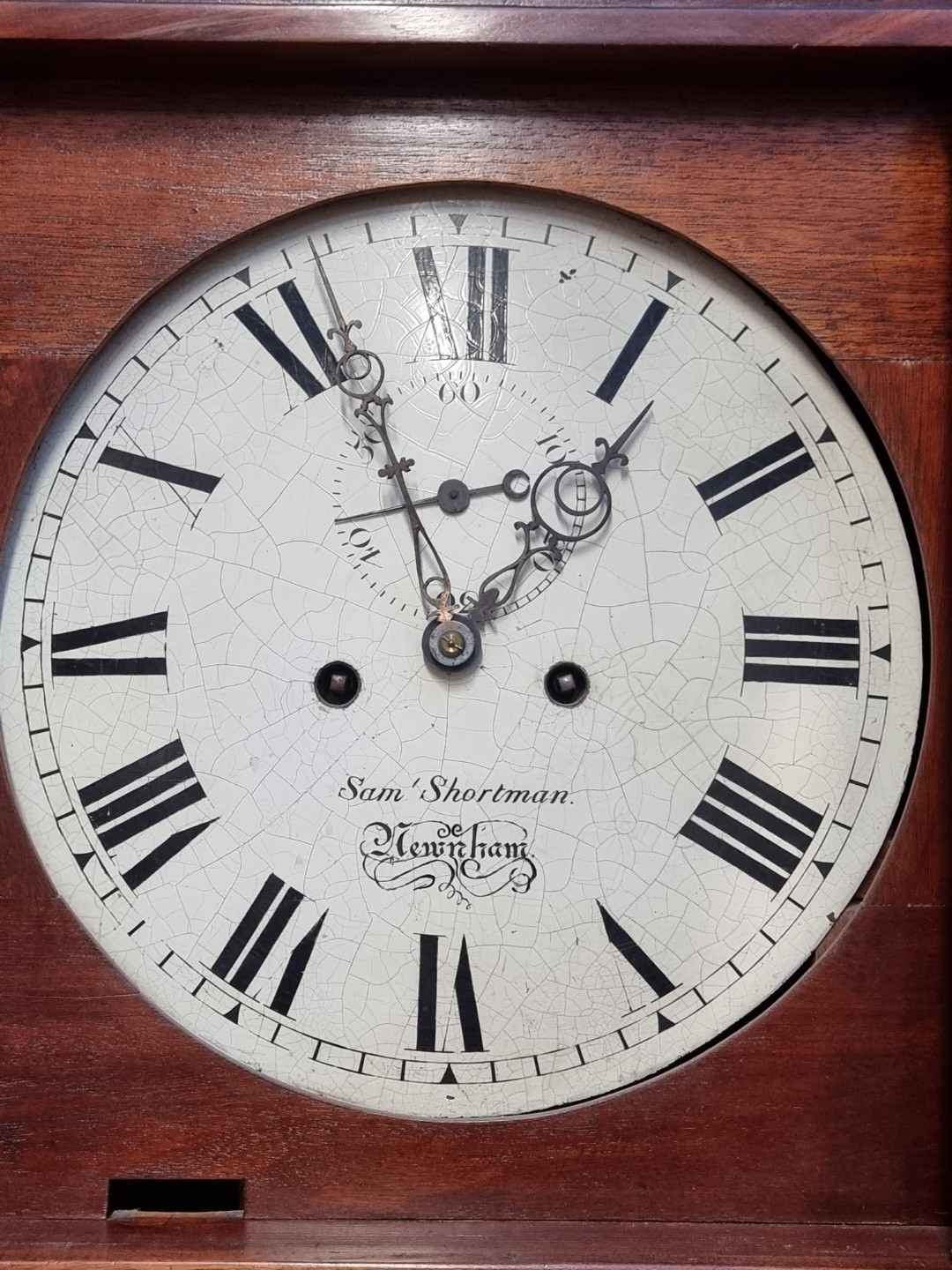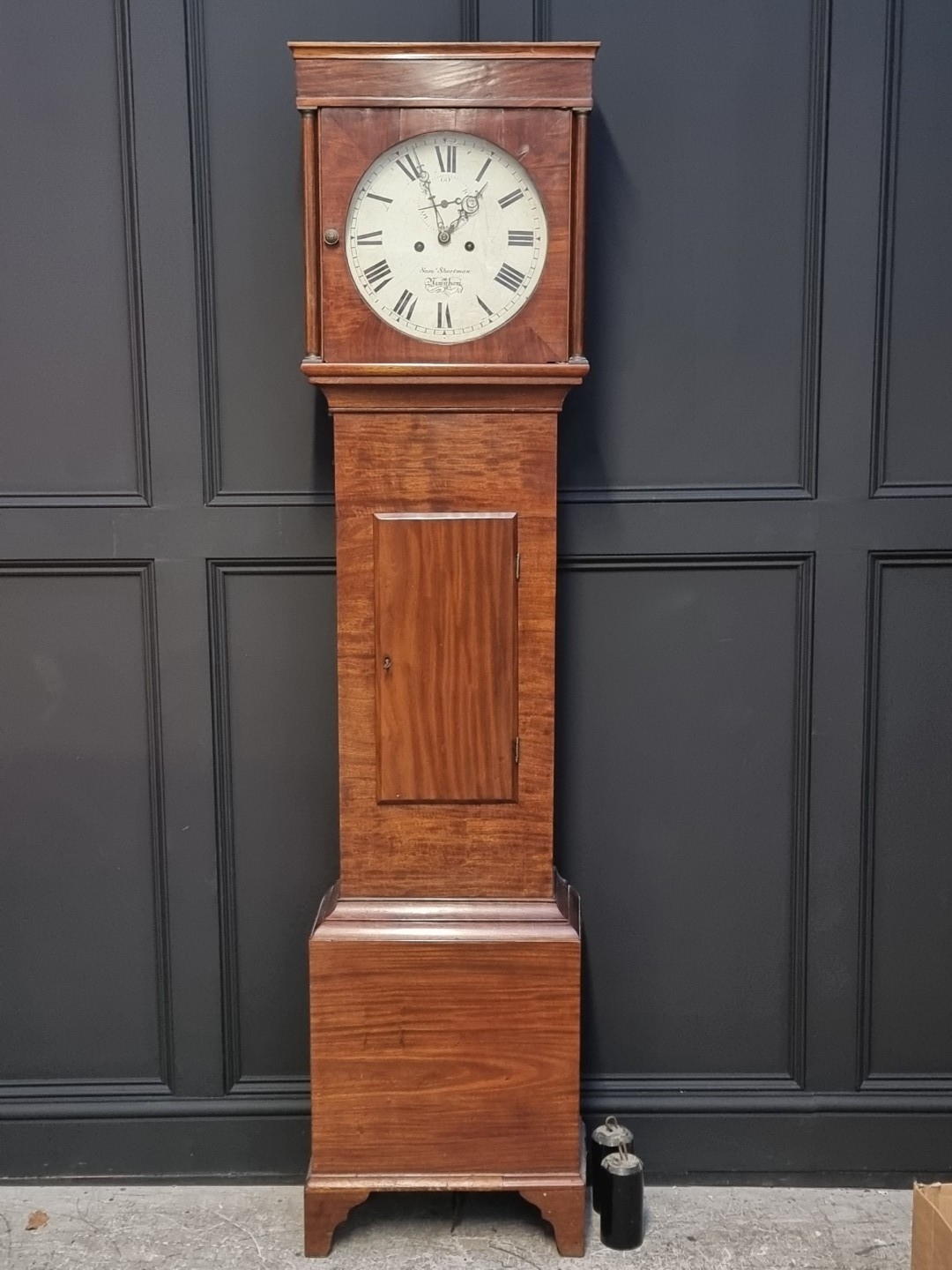 A 19th century mahogany eight day longcase clock, the 12 3/4in painted circular dial inscribed 'Sam Shortman, Newnham', 203cm high, with pendulum and weights.