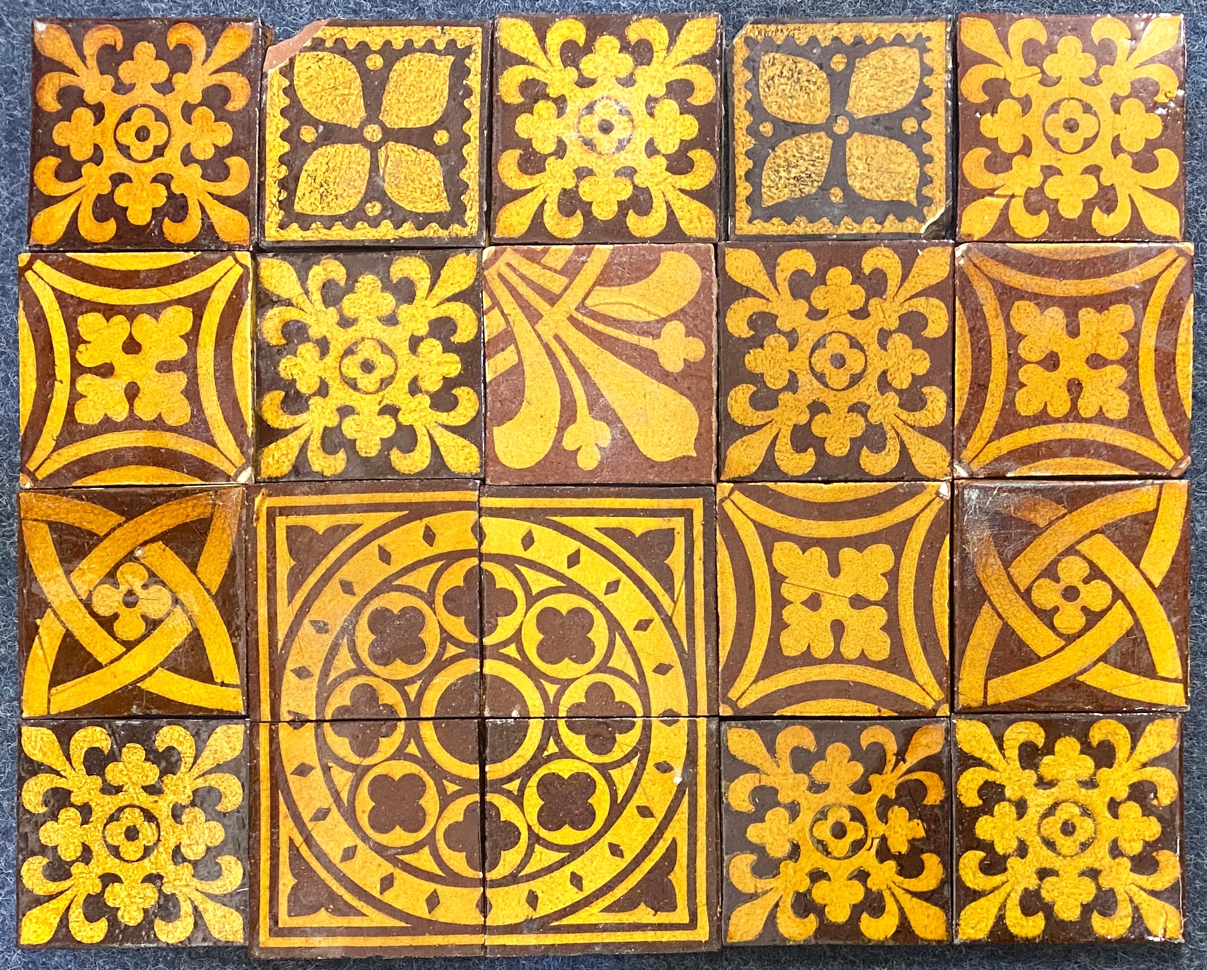 A collection of twenty assorted Craven Dunnill & Co encaustic tiles to include a group of four tiles with circle and quatrefoil design (a/f)