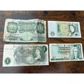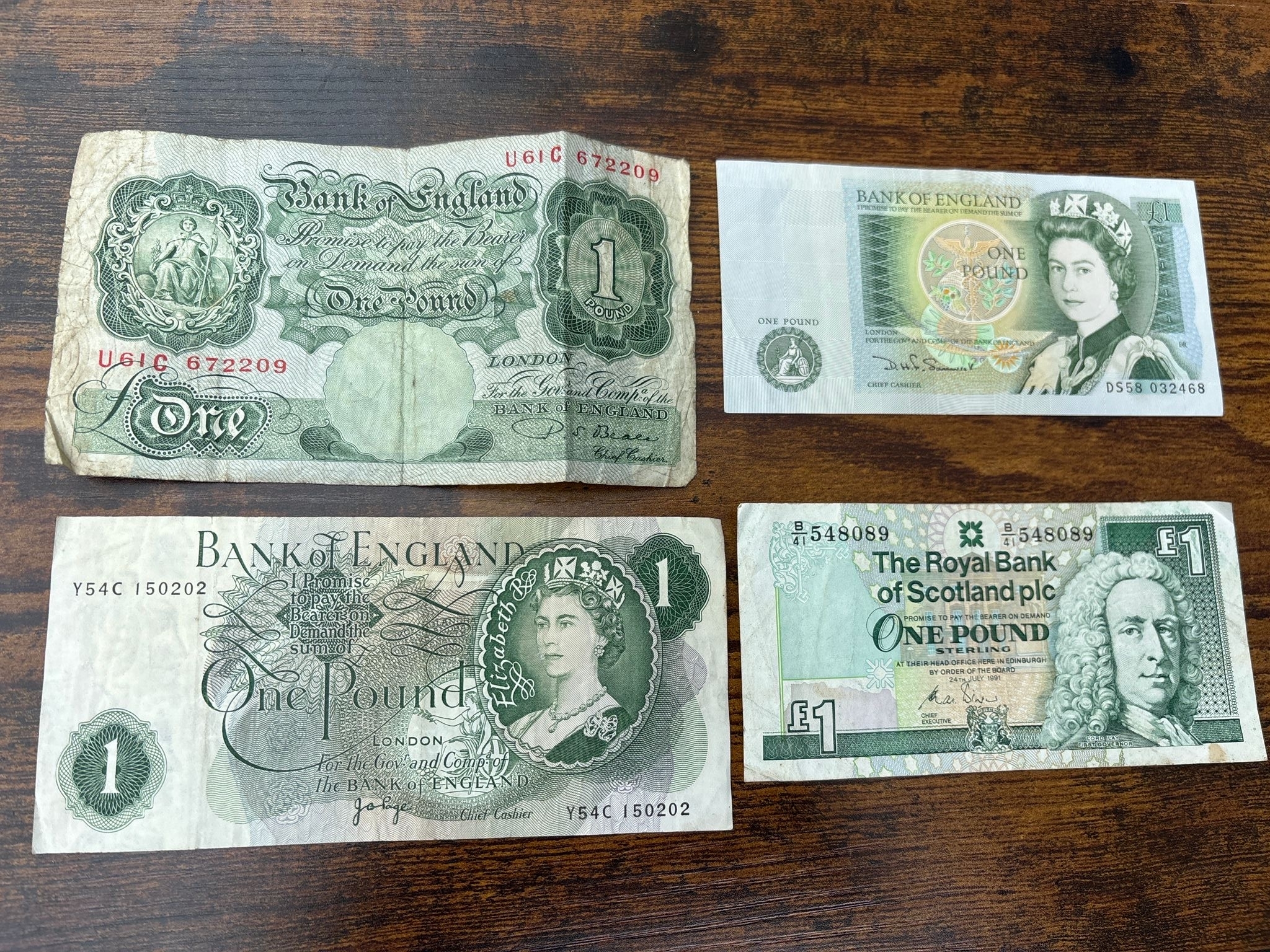 British £1 Banknote Collection – 4 Notes (Elizabeth II Era) Mixed group of original British one pound banknotes including Bank of England and Royal Bank of Scotland issues, all featuring Queen Elizabeth II (reigned 1952–2022). Includes: • Bank of England £1 (green – Series C/D, c.1960s–1970s) • Bank of England £1 (later issue, c.1980s–1990s) • Royal Bank of Scotland £1 (modern issue, c.1980s–1990s) • Additional Bank of England £1 note (Elizabeth II portrait series) A nice mix showing the evolution of the £1 note before withdrawal from circulation in 1988 (England/Wales) and later in Scotland. Condition: mixed – from crisp to heavily circulated with folds, staining and edge wear (as pictured)