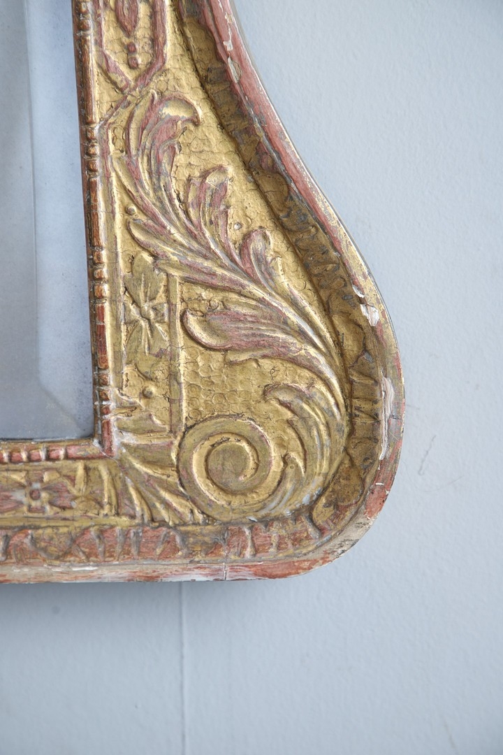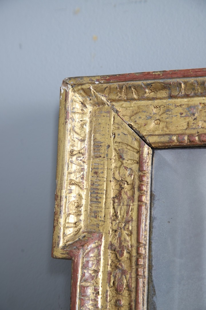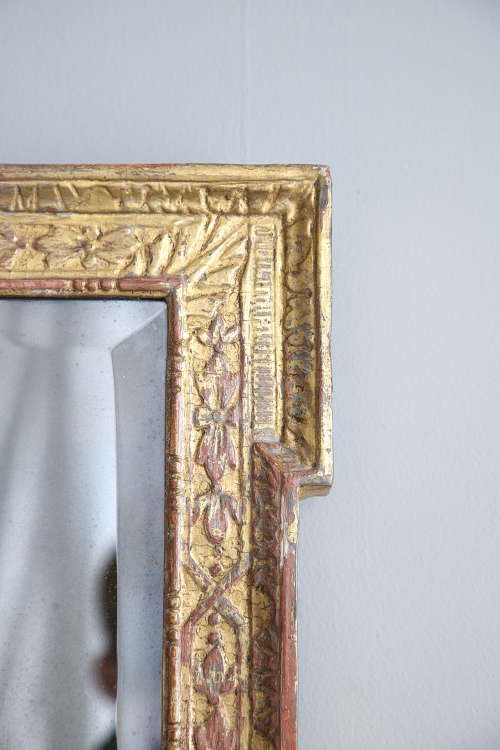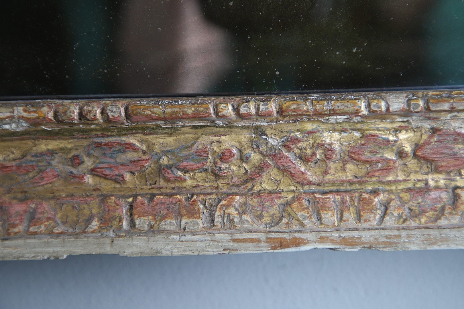 A GEORGE II GILTWOOD AND GESSO OVERMANTLE MIRROR. the bevelled plate to a shallow-relief moulded frame of Classical motif decoration, height, 49cm, width 96cm.