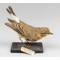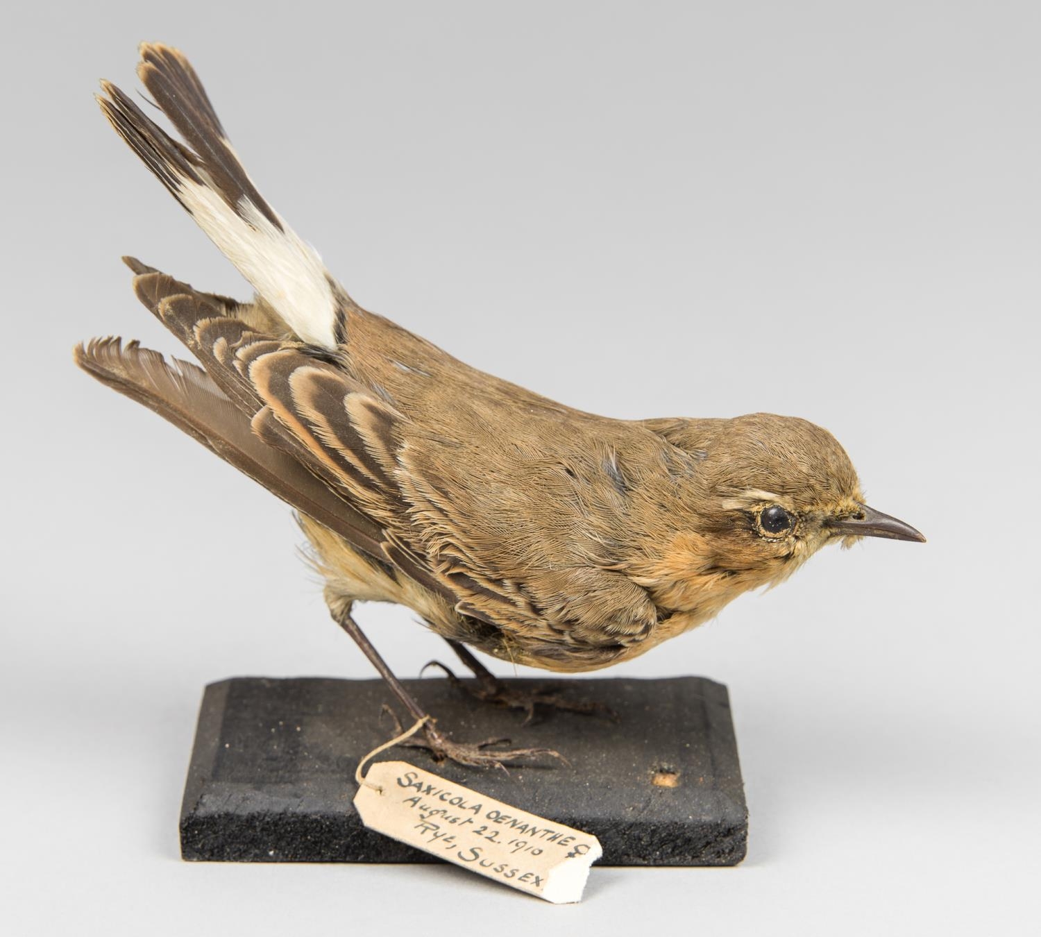 AN EARLY 20TH CENTURY TAXIDERMY WHEATEAR UPON A NATURALISTIC BASE.