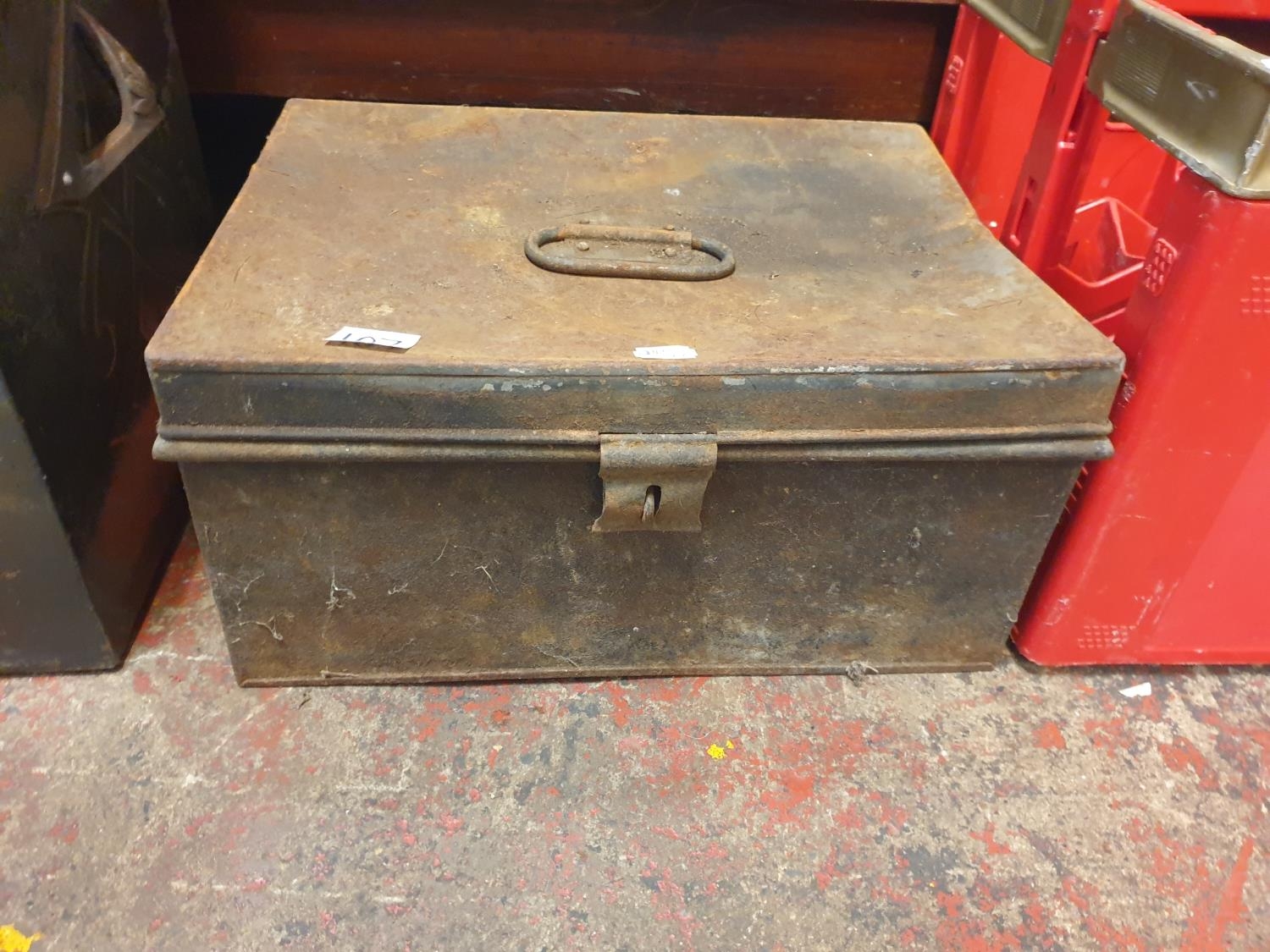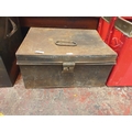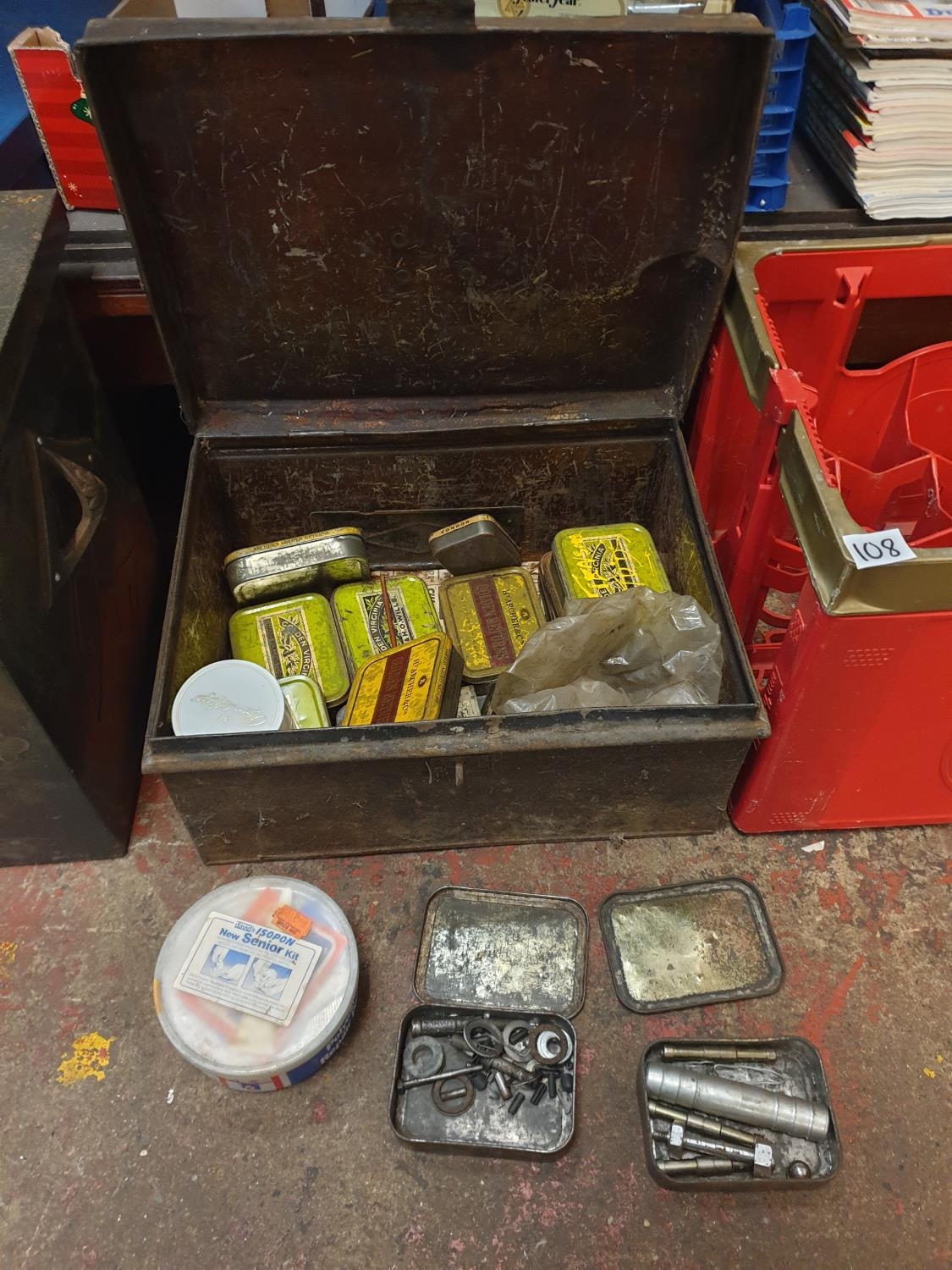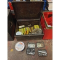 Vintage Rectangular Metal Trunk with Assorted Tobacco Tins Containing Screws, Bolts etc.