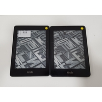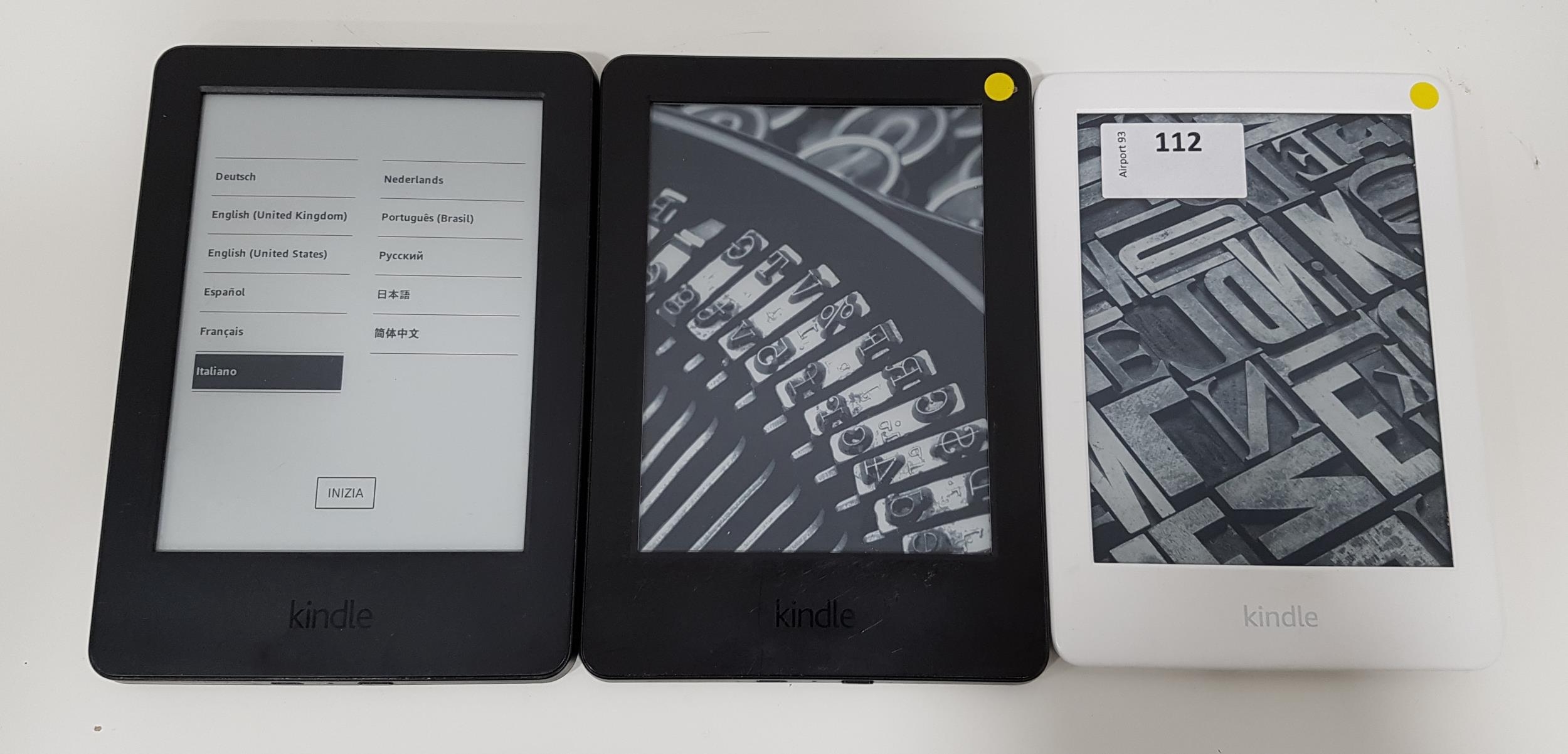 comprising two Kindle Basic (2014), serial numbers 90C6 0706 5436 0381 AND 90C6 0706 5365 036L; and a white Kindle Basic 3 (2019), serial number G090 WH05 9324 06EF (3)