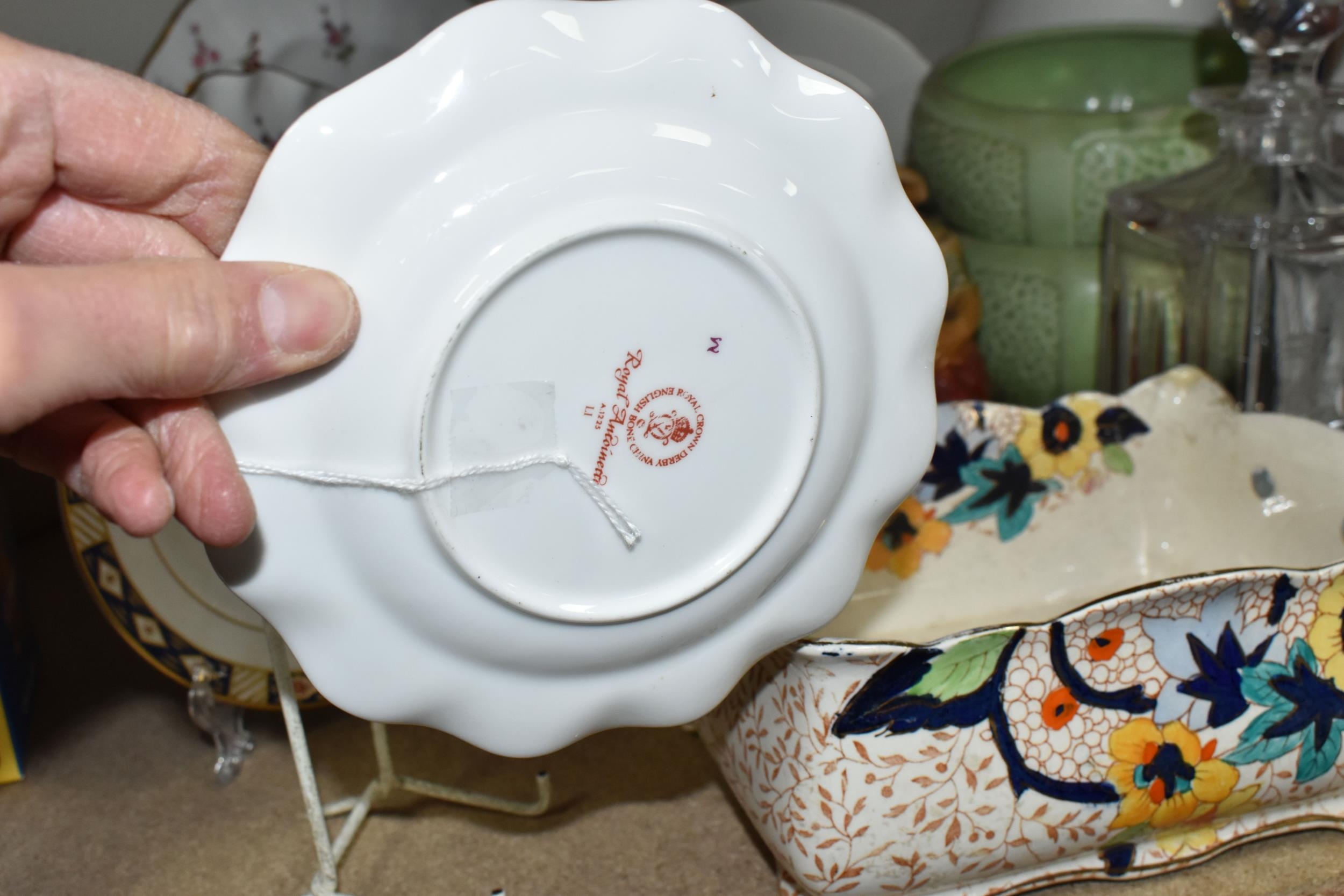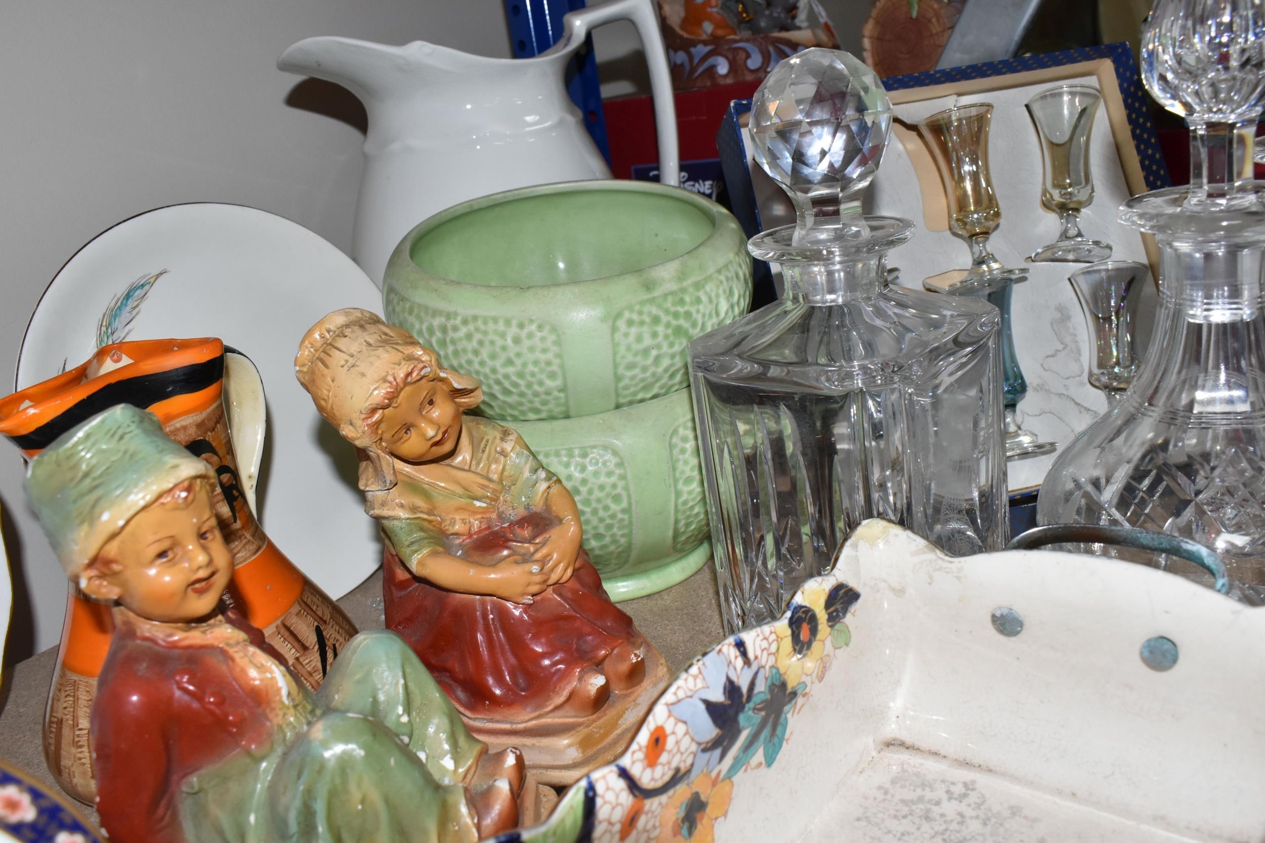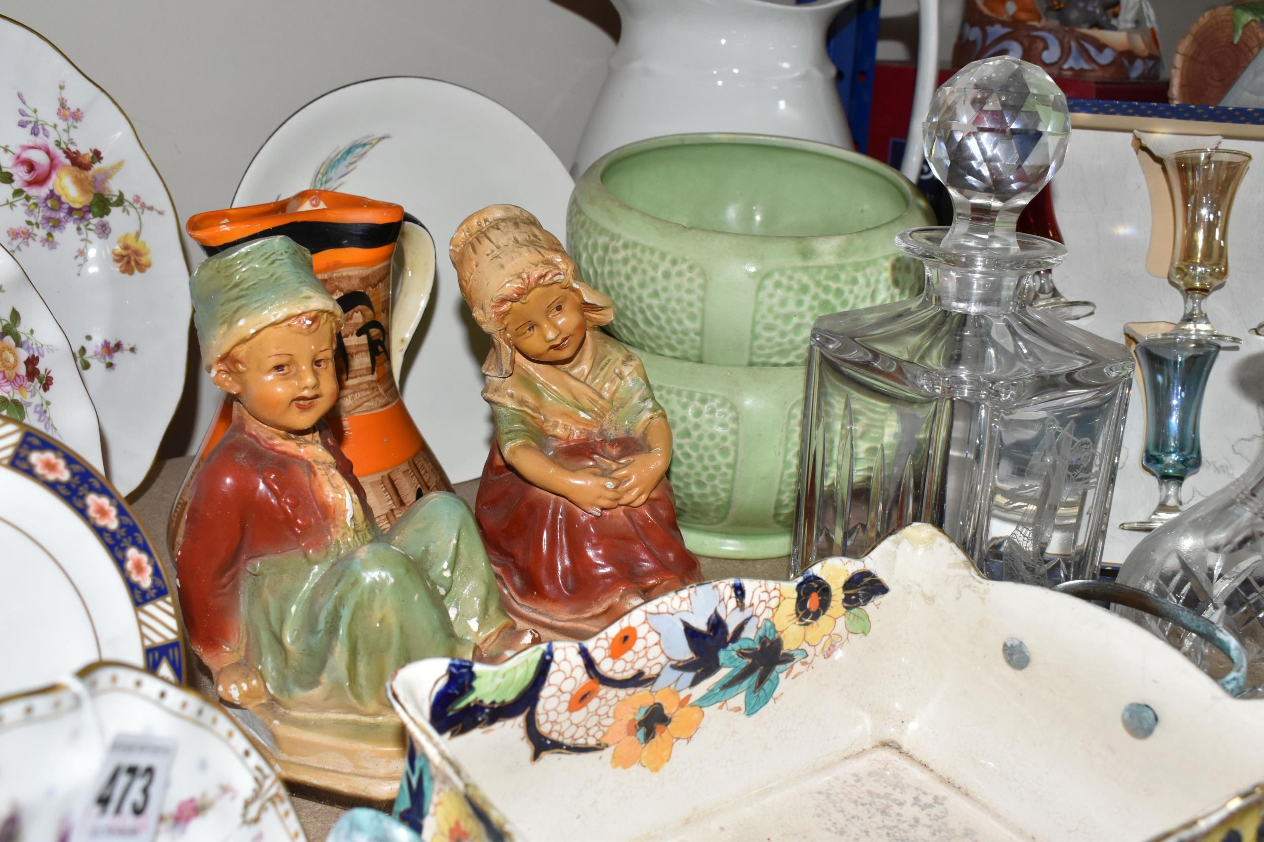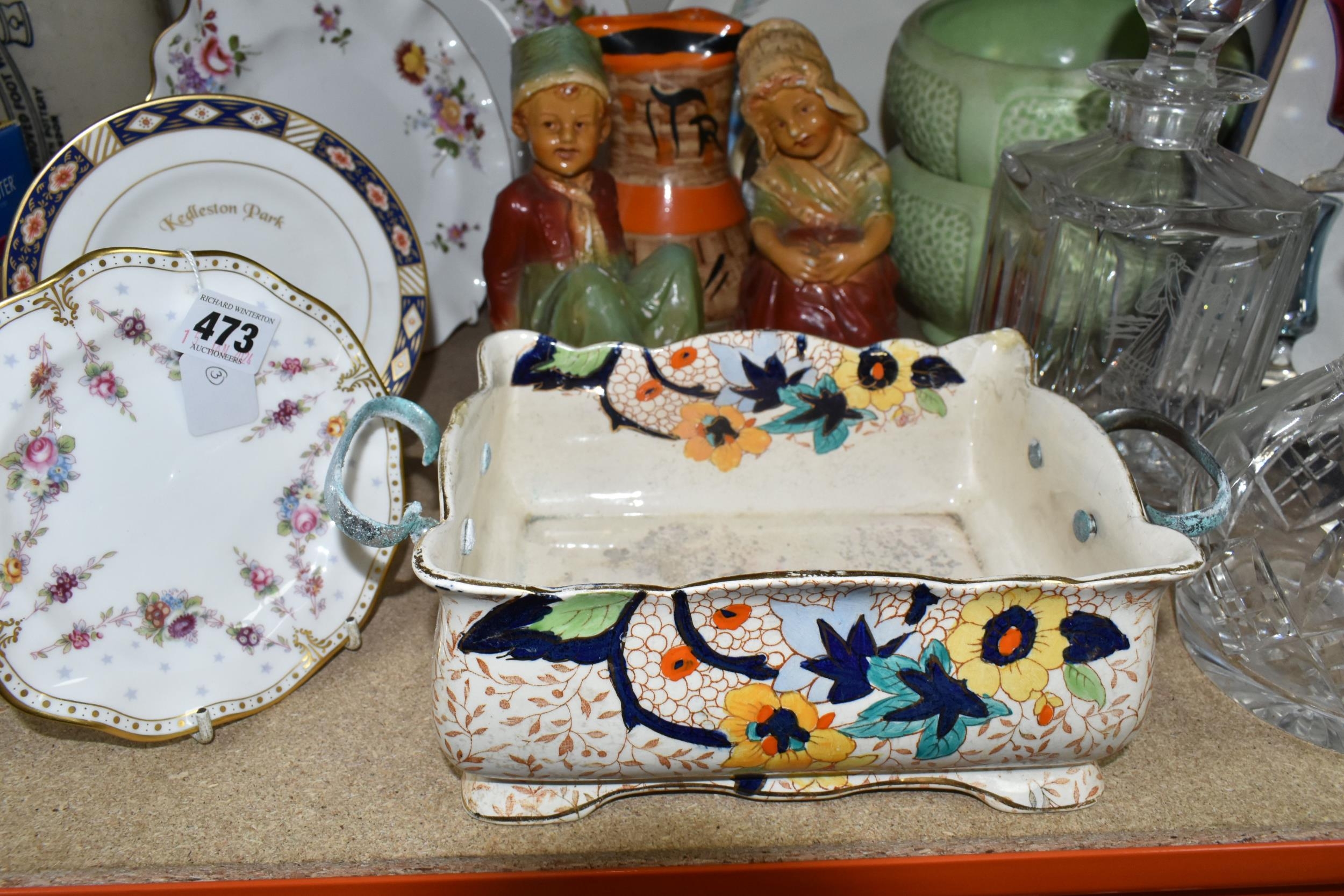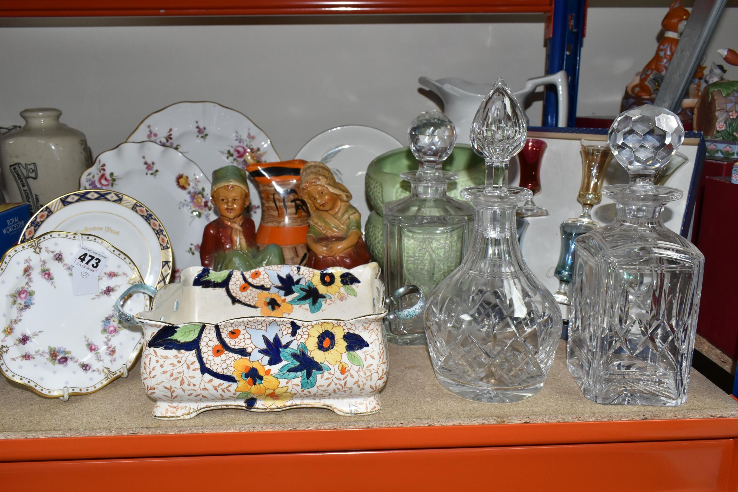 A GROUP OF CERAMICS, GLASS AND CHALKWARE, to include a Royal Crown Derby 'Royal Antoinette' side plate (second quality), a Royal Crown Derby Imari 1315 side plate produced for Kedleston Park Golf Club, Royal Crown Derby 'Derby Posies' dinner plate and wavy rimmed plate, a Davenport twin handled dish (handles having Verdigris, hairlines, restoration, crazing and staining to main dish), three crystal decanters including Edinburgh Crystal, a pair of chalkware figures of children (some chips), etc (16) (Condition Report: generally ok, sd and as stated in description)