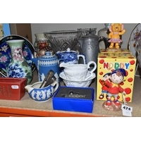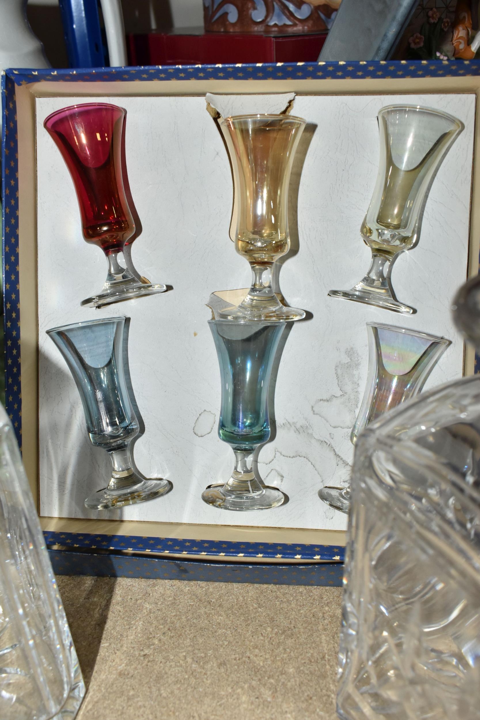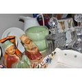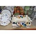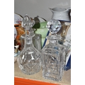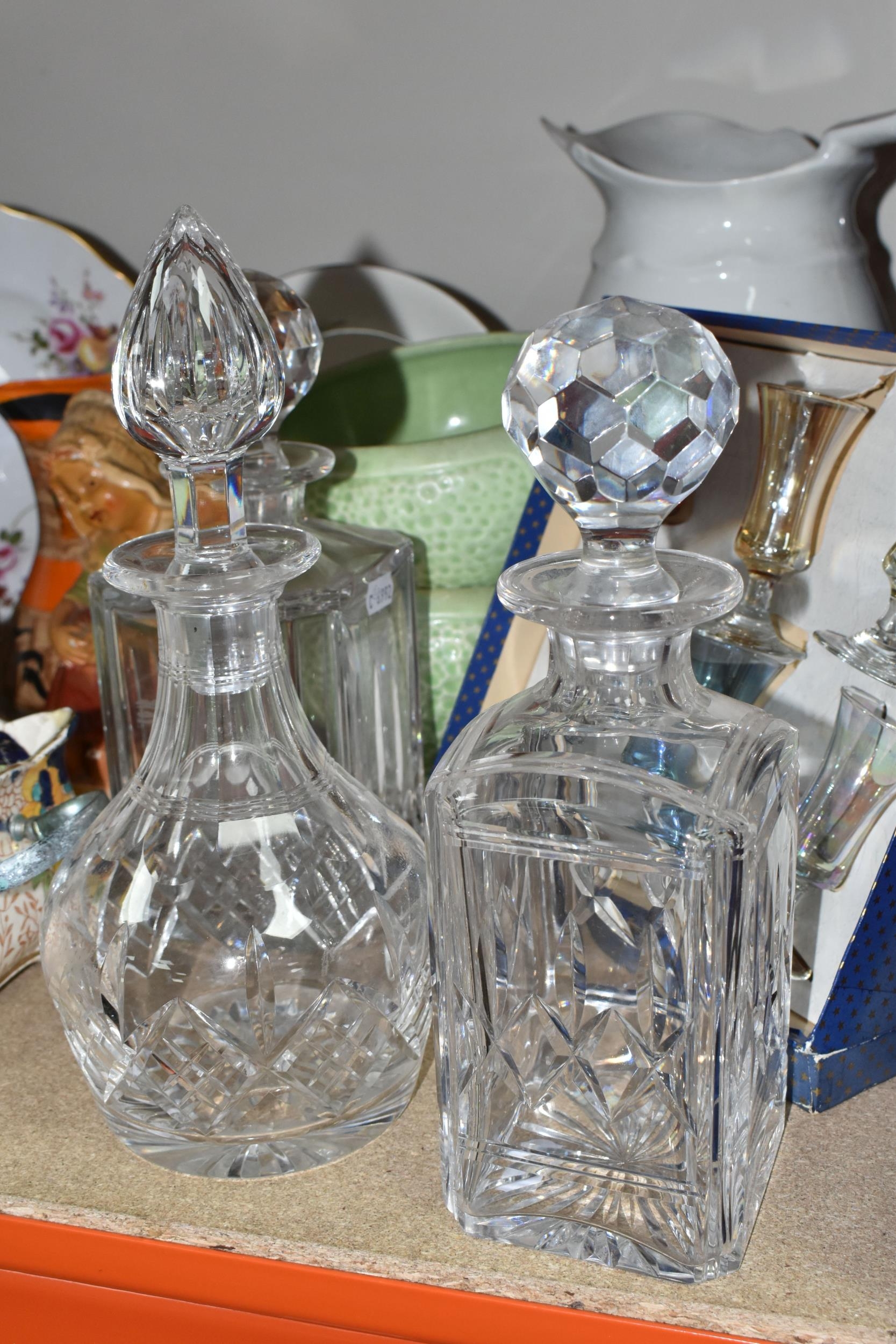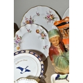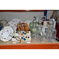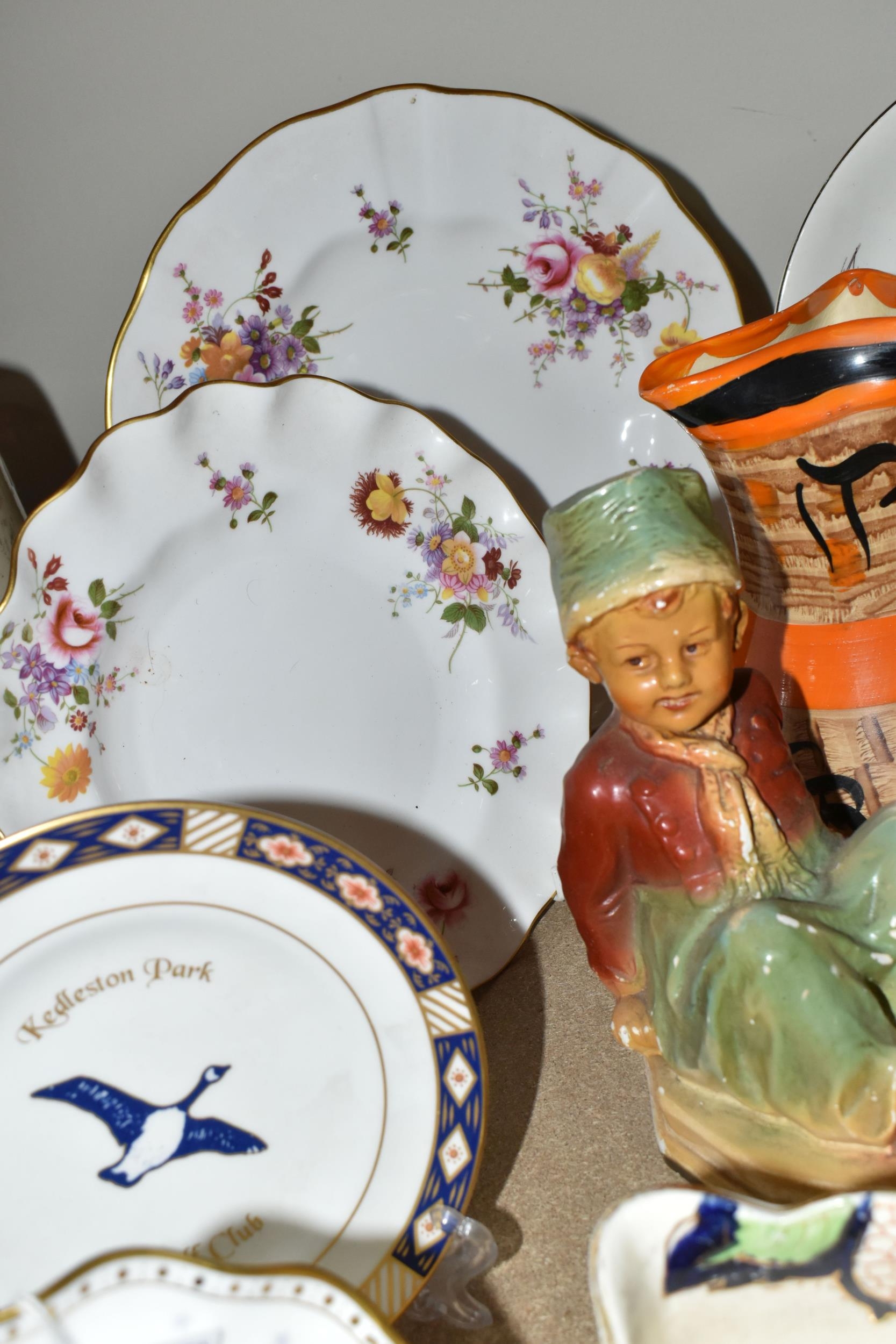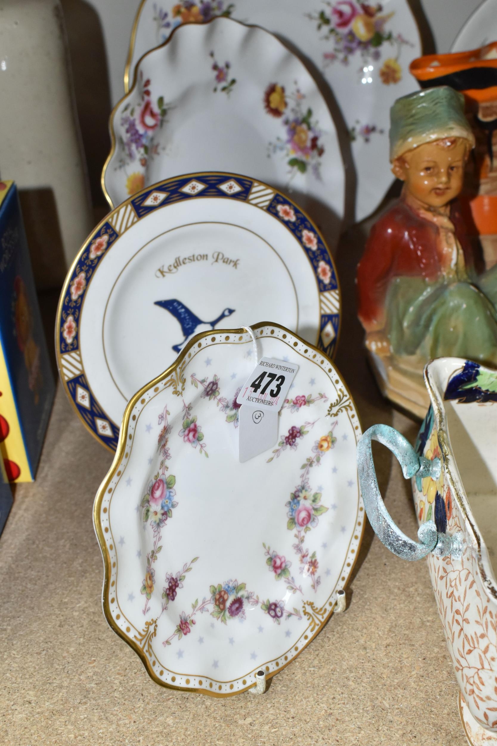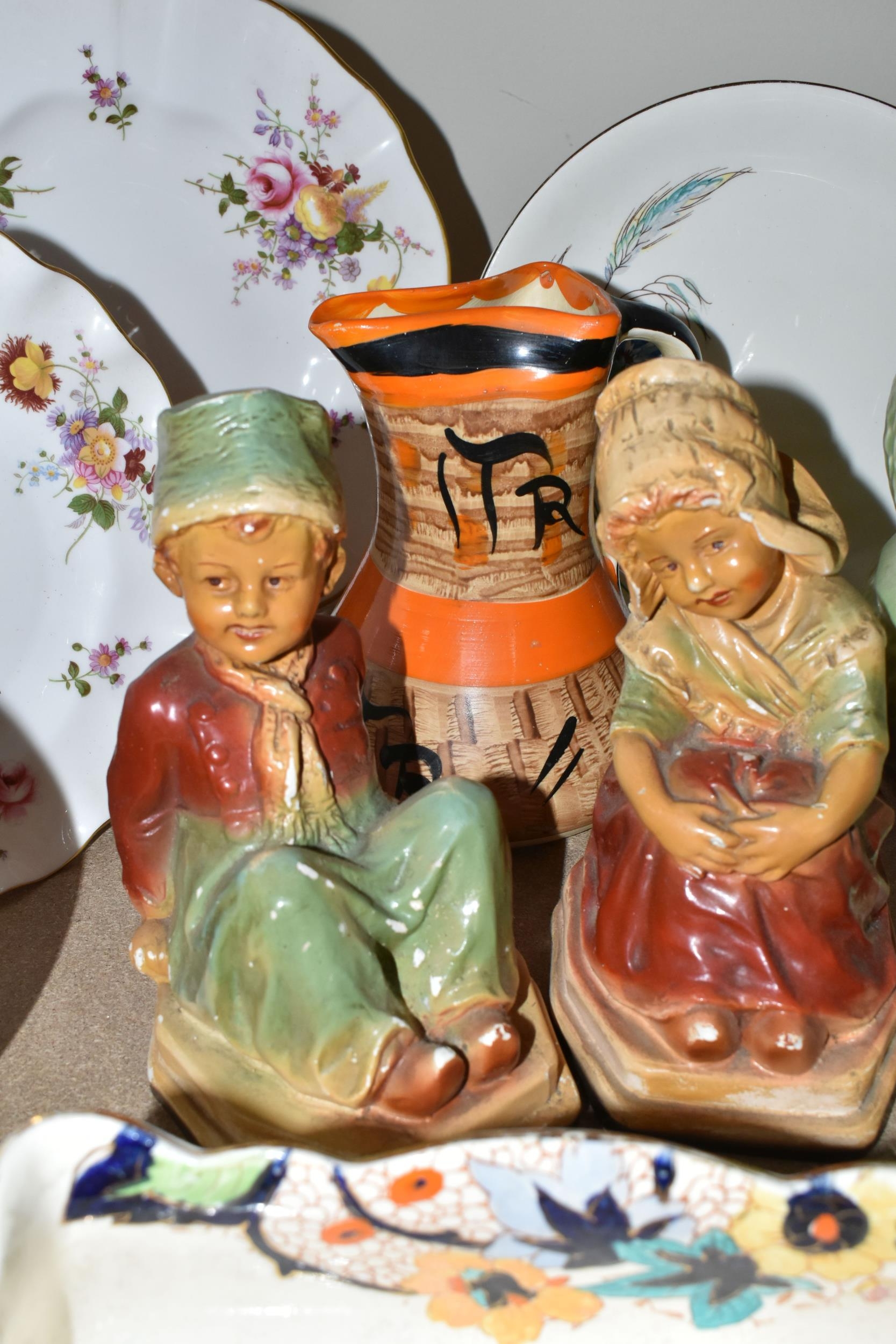 A GROUP OF CERAMICS, GLASS AND CHALKWARE, to include a Royal Crown Derby 'Royal Antoinette' side plate (second quality), a Royal Crown Derby Imari 1315 side plate produced for Kedleston Park Golf Club, Royal Crown Derby 'Derby Posies' dinner plate and wavy rimmed plate, a Davenport twin handled dish (handles having Verdigris, hairlines, restoration, crazing and staining to main dish), three crystal decanters including Edinburgh Crystal, a pair of chalkware figures of children (some chips), etc (16) (Condition Report: generally ok, sd and as stated in description)