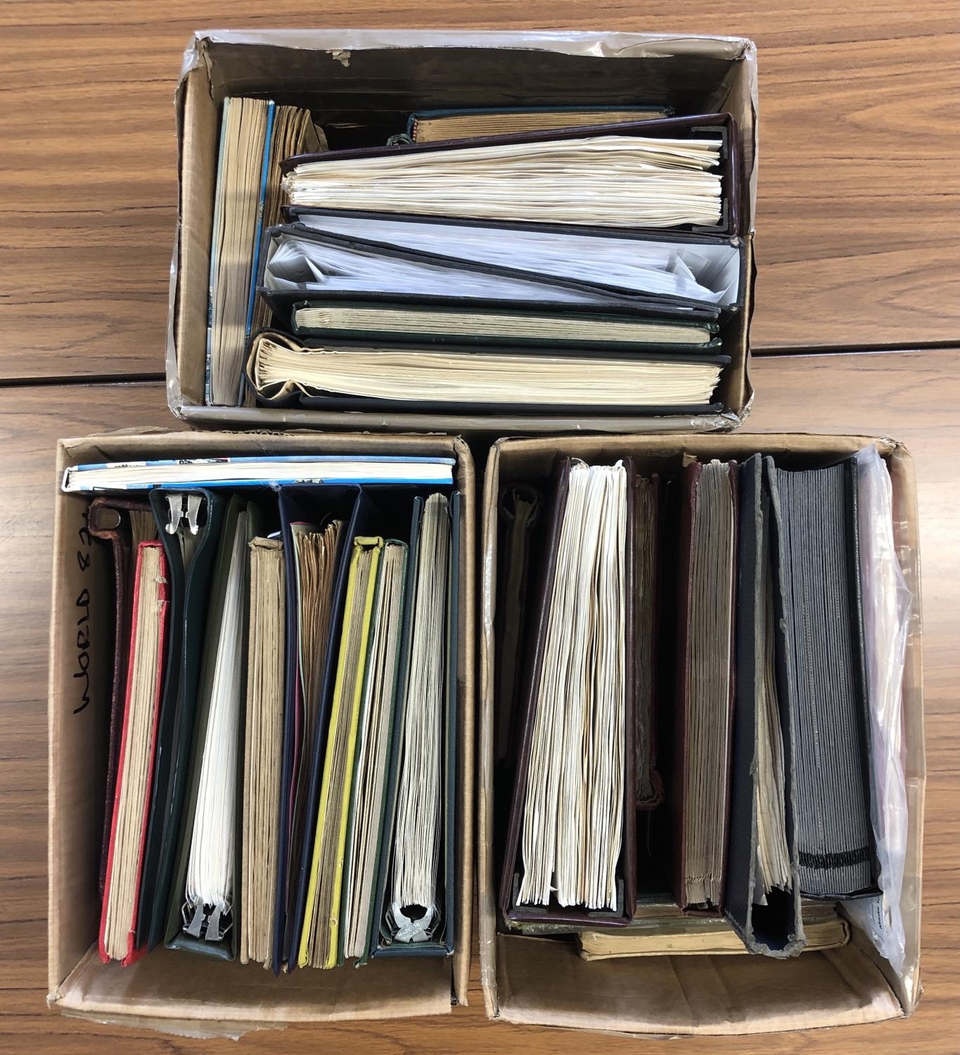 WORLD MIXTURE IN THREE CARTONS; 28 stockbooks, albums & binders + a handful of loose pages containing a worldwide assortment of stamps. Covers a range of countries & periods. (Qty)