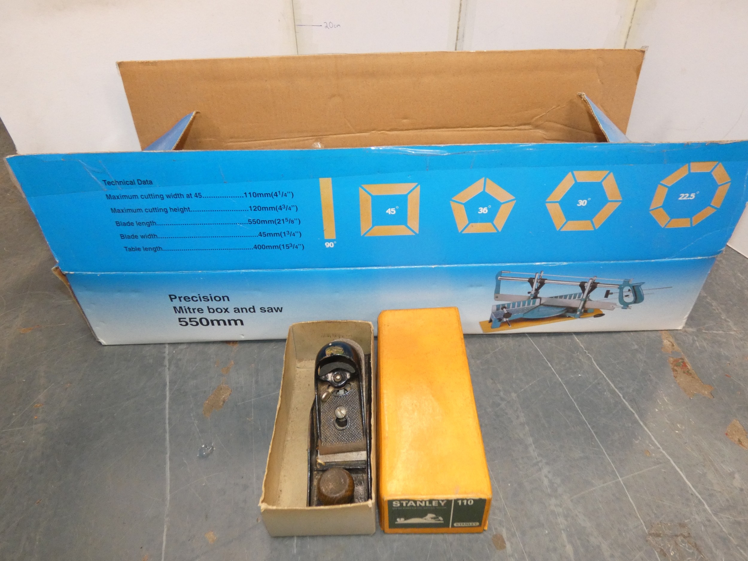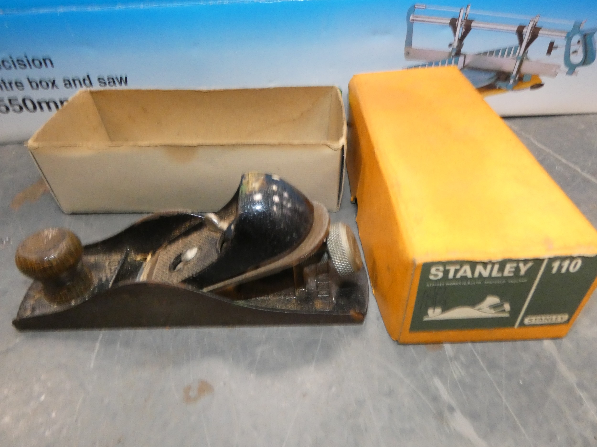 Precision mitre box and saw, and a Stanley plane, both boxed.
