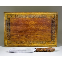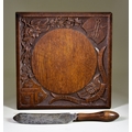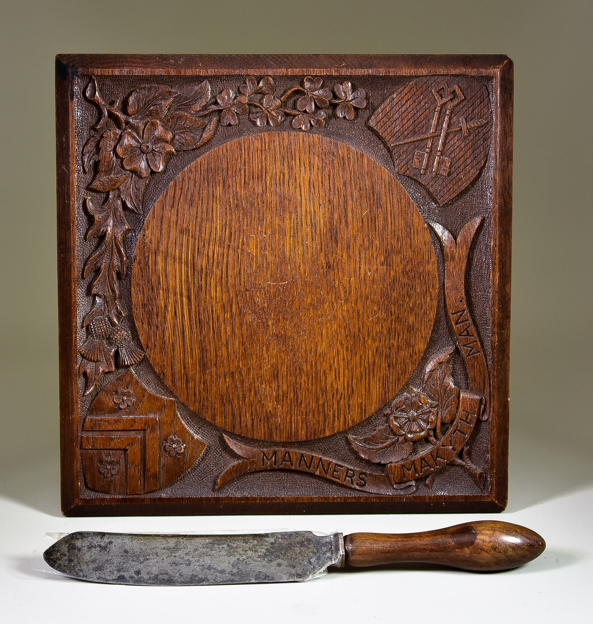 A 20th Century Oak "Wykham" Square, in the form a medieval trencher, with moulded crumb gully, the borders carved with floral insignia and two coats of arms of Winchester Cathedral and College, and "Manners Makyth Man", 12.25ins square, the reverse carved "A.W.R. Christmas 1905", and a knife with plain turned wood handle