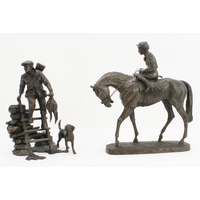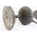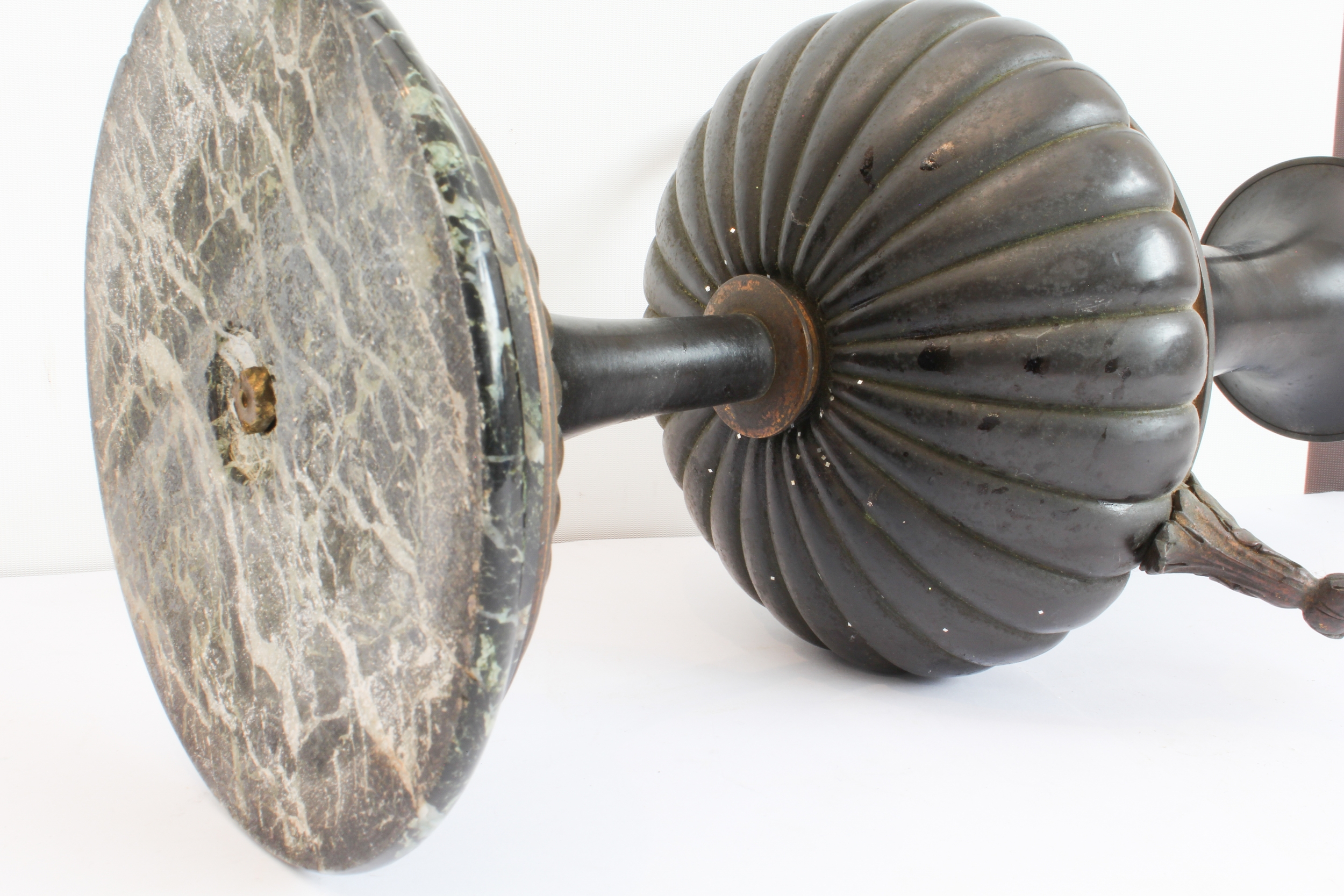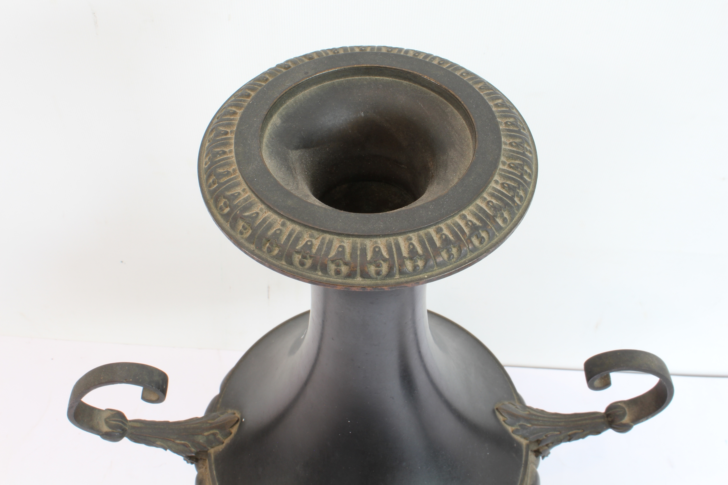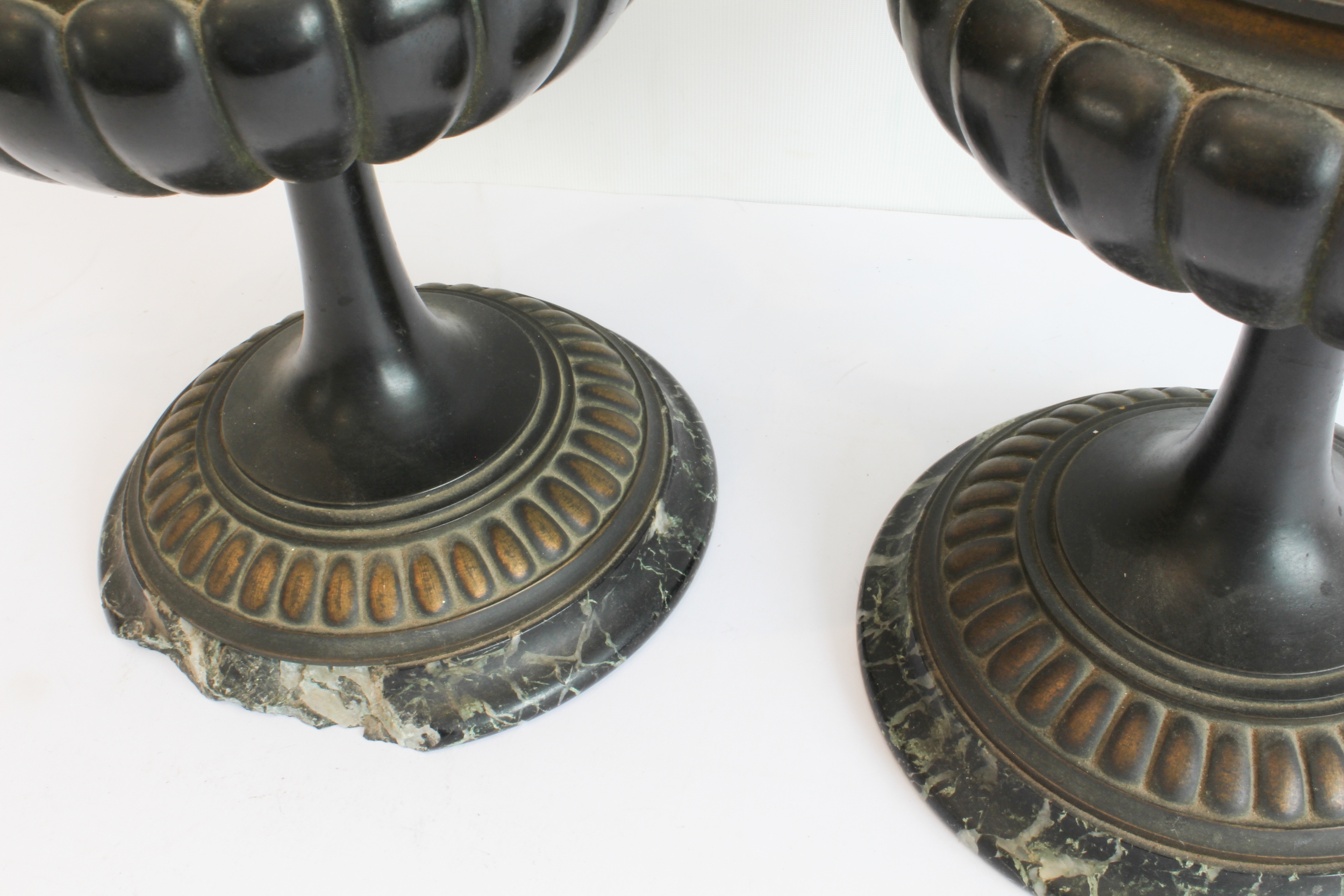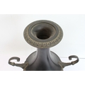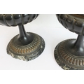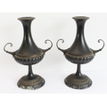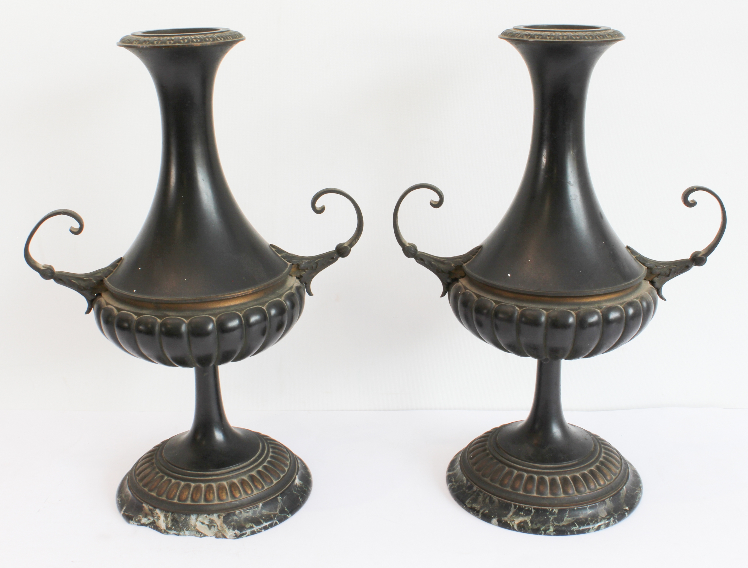 A pair of late 19th to early 20th century two-handled patinated (bronze?) vases on circular black and white variegated marble bases (36.5 cm high).