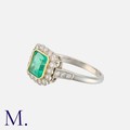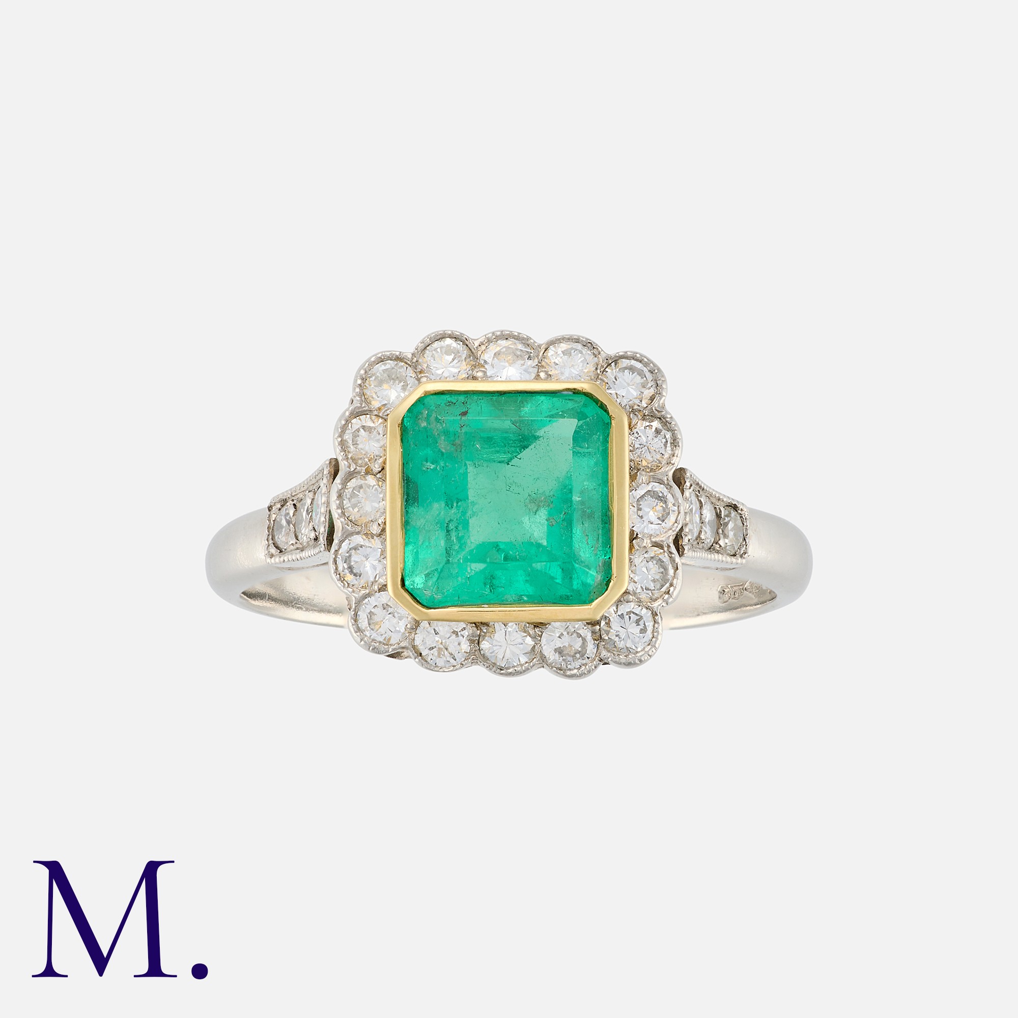 An Emerald and Diamond Ring in platinum and yellow gold, set with a rectangular cut emerald weighing approx. 1.6ct with round cut diamonds in surround. Band marked for platinum.