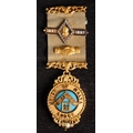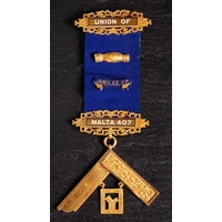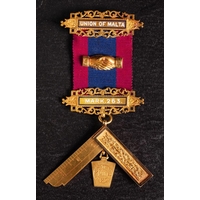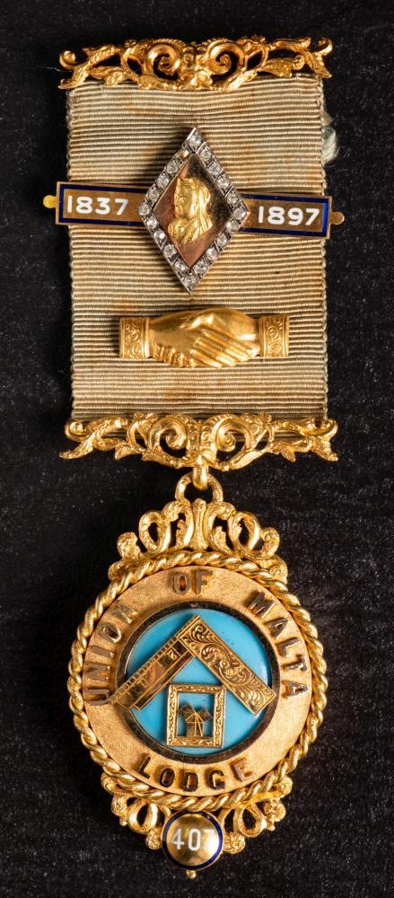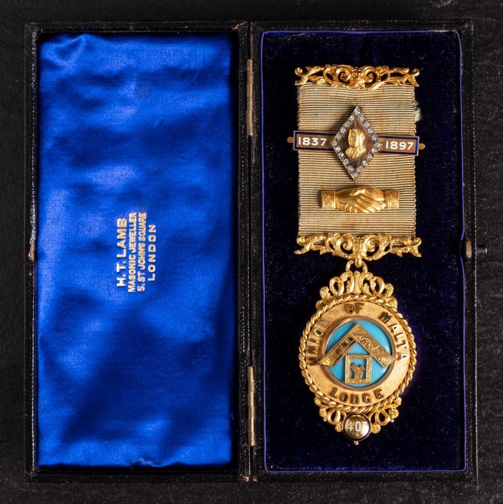A Victorian 18ct gold 'Union of Malta Lodge No.407' Queen Victoria Silver Jubilee Masonic jewel: with paste set Jubilee clasp and pierced suspension bars over a circular suspension inscribed and dated to reverse 1897, in a leather case for H T Lamb. 49g